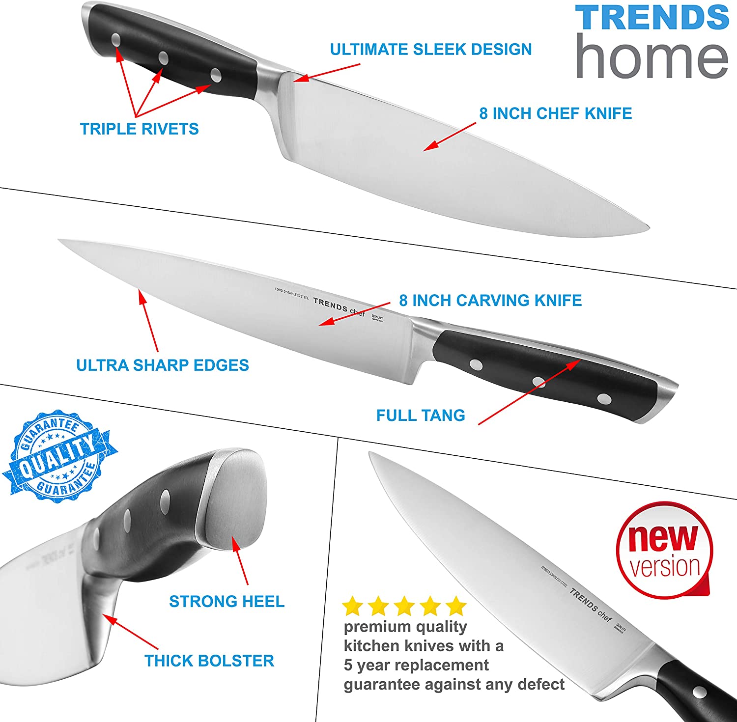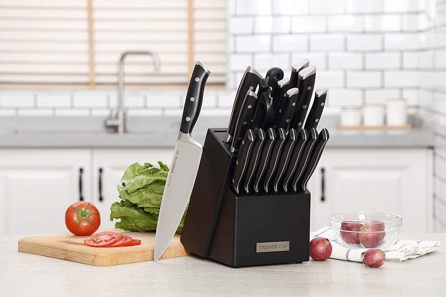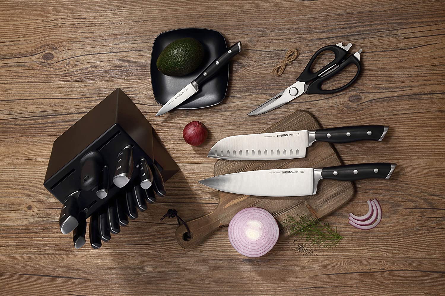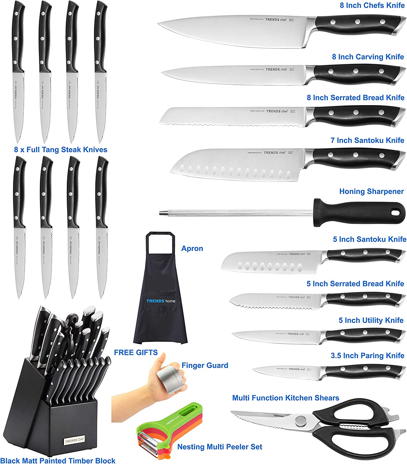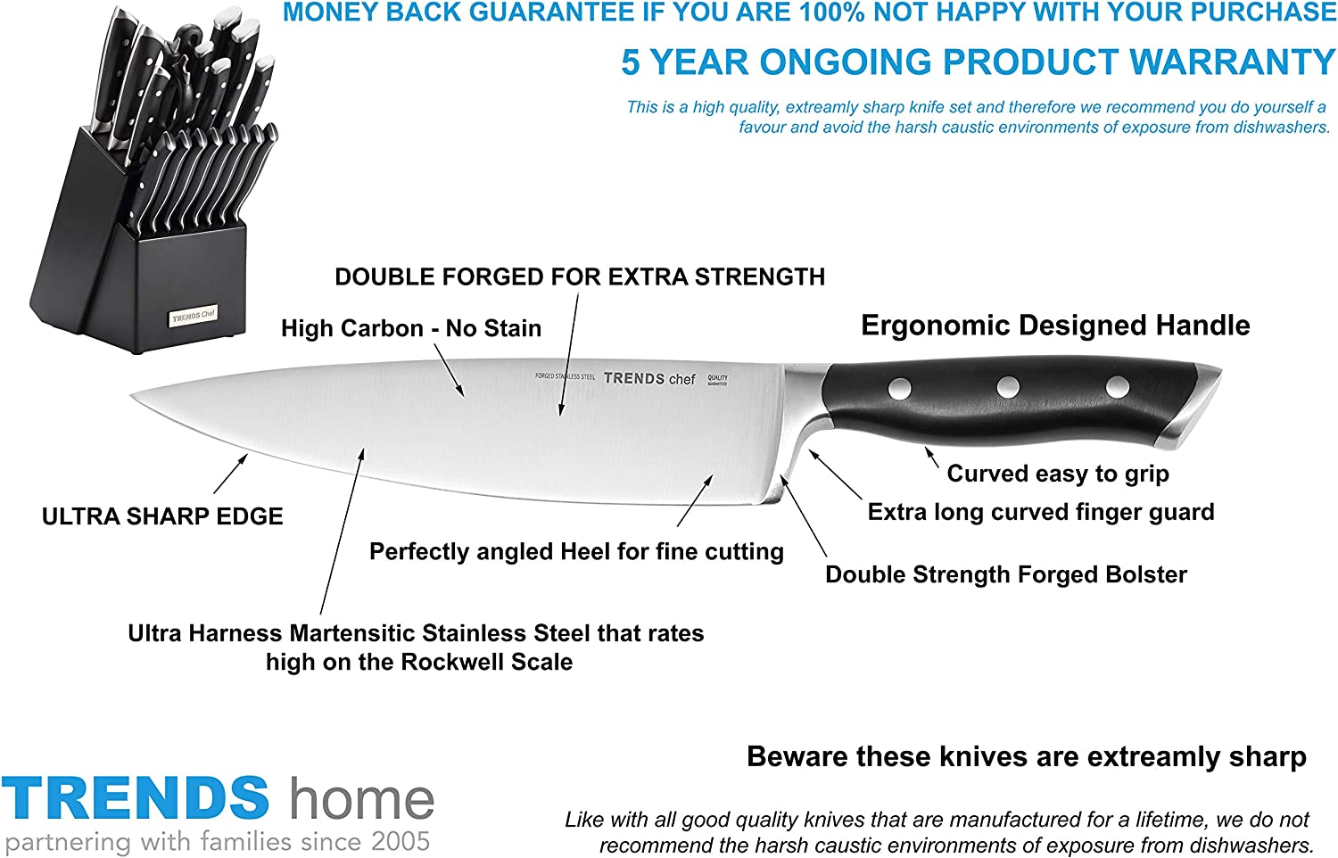 TRENDS Chef 19 Pc Premium German Steel #1.4116 Kitchen Knife Block Set. Triple Rivet. This set of Knives is a super sharp knife set for the kitchen. 16 Knives. Sharpener. Block. and kitchen shears.