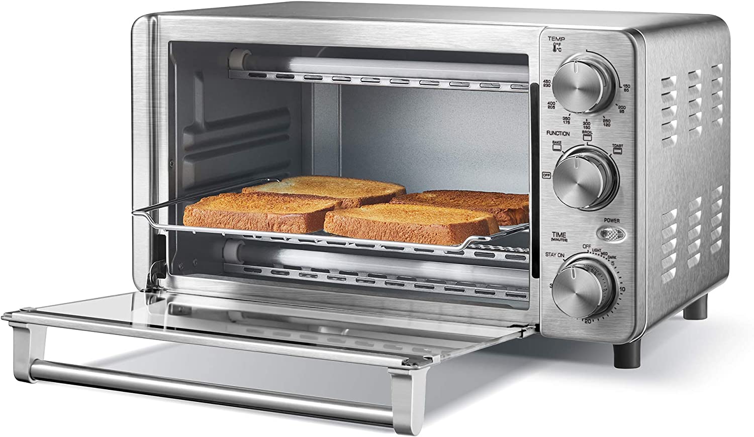 Elite Gourmet ECT4400B# Long Slot 4 Slice Toaster. Countdown Timer. Bagel Function. 6 Toast Setting. Defrost. Cancel Function. Built-in Warming Rack. Extra Wide Slots for Bagel Waffle. Stainless Steel