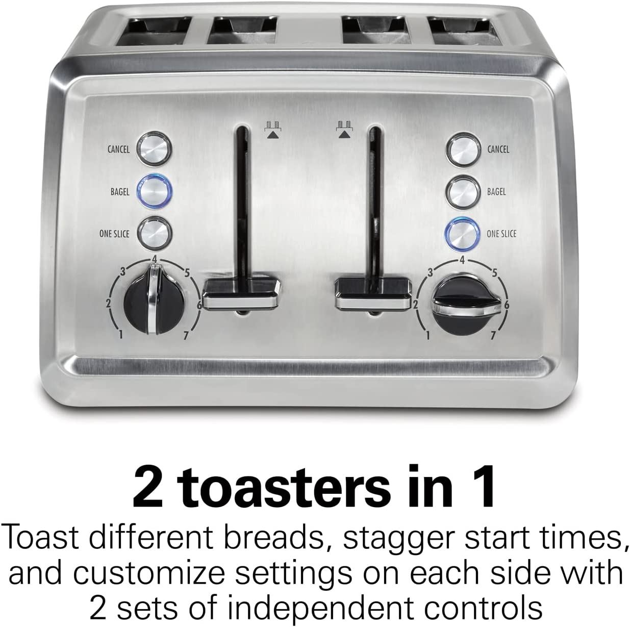 Hamilton Beach Toaster with Extra-Wide Slots. Sure-Crisp Technology. Bagel Setting. Toast Boost. Slide-Out Crumb Tray. Auto-Shutoff and Cancel Button. 4-Slice. Stainless Steel (24798)