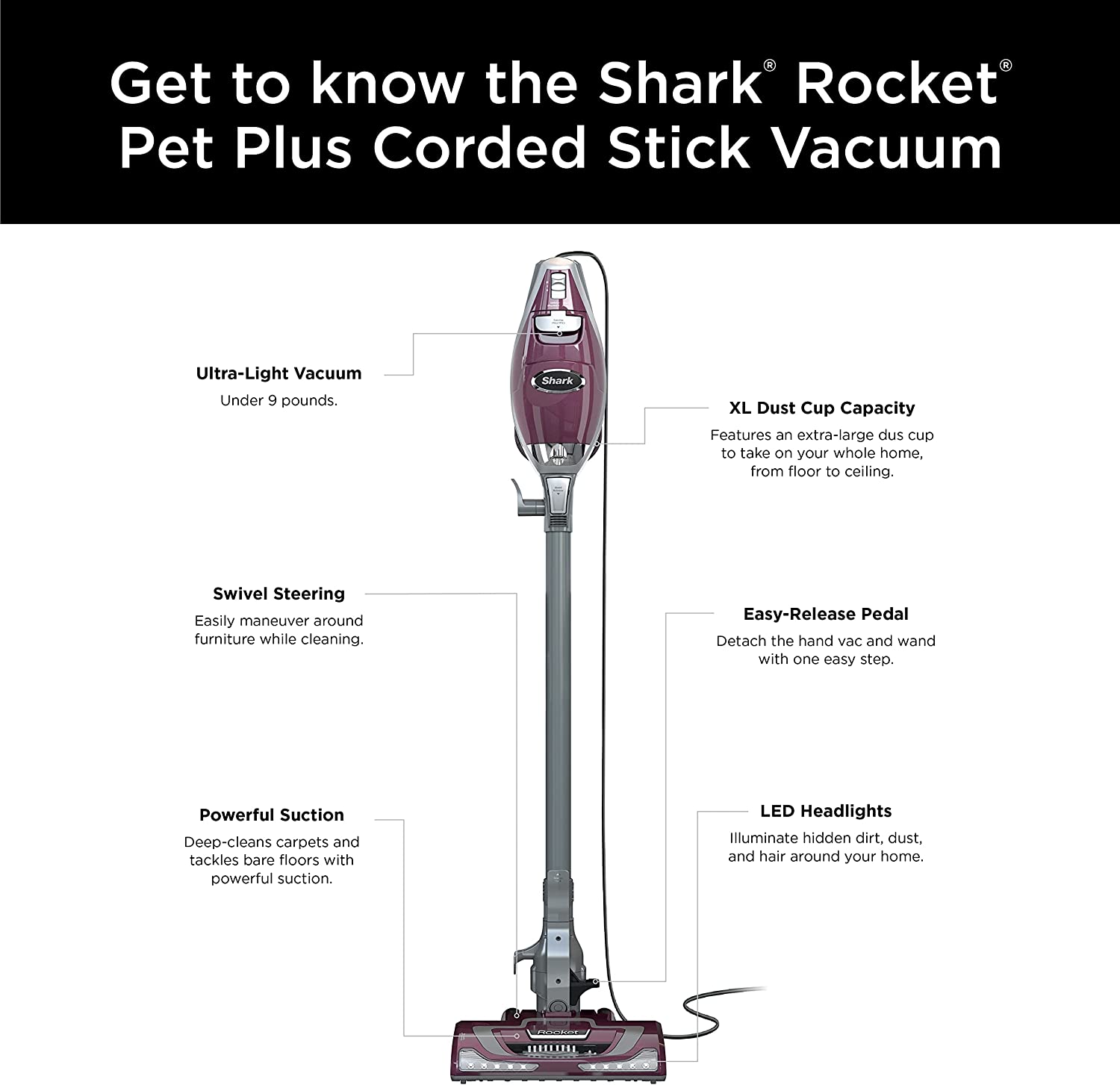 Shark HV322 Rocket Pet Plus Corded Stick Vacuum with LED Headlights. XL Dust Cup. Lightweight. Perfect for Pet Hair Pickup. Converts to a Hand Vacuum. with (2) Pet Attachments. Bordeaux/Silver