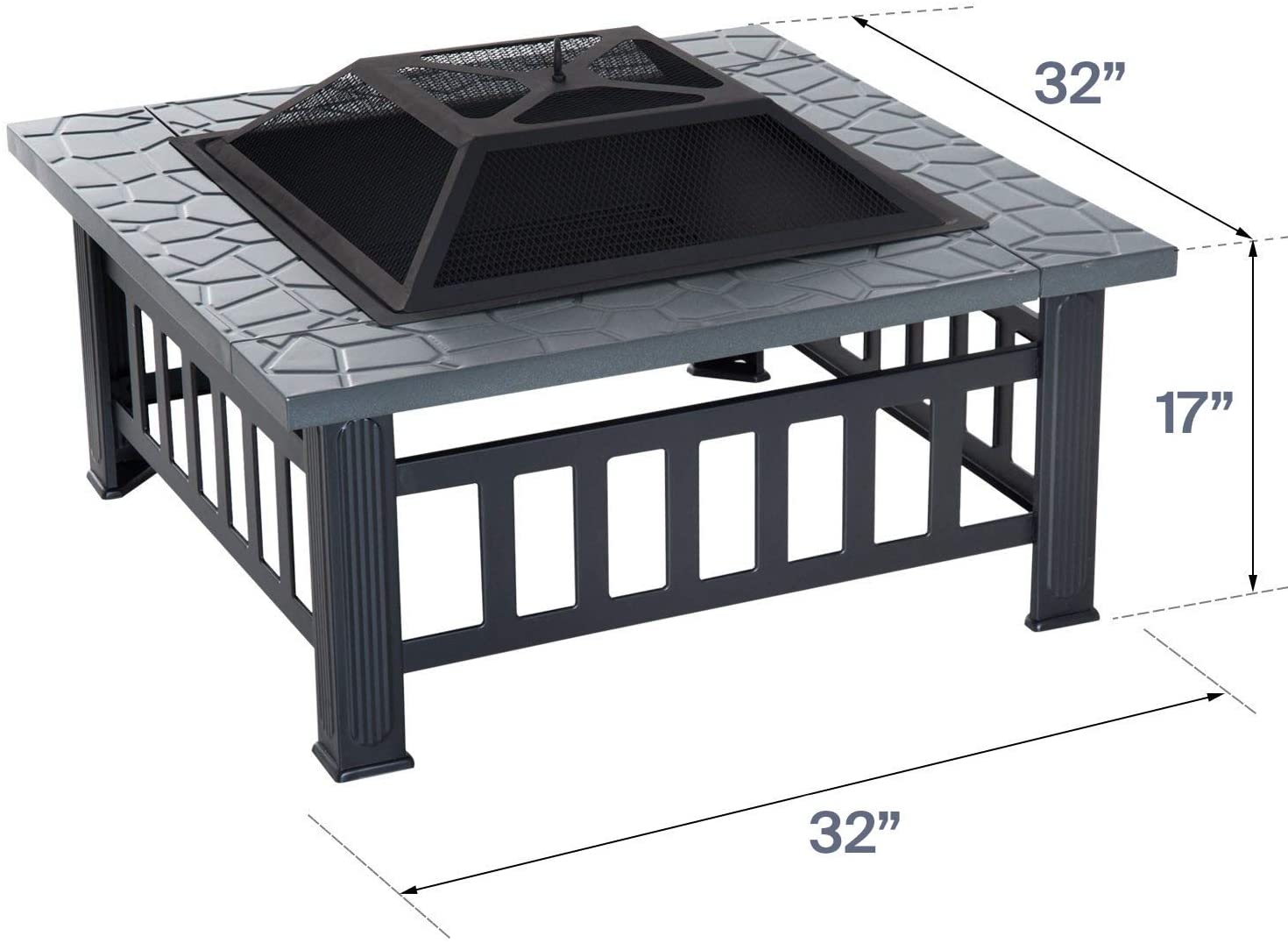 Ash Fire Pit - Square Outdoor Wood Burning and Grill for Camping and Picnic - Portable Steel Frame with Legs. Mesh Cover. Poker - Bonfire and Cooking in The Patio. Deck. Garden. Backyard