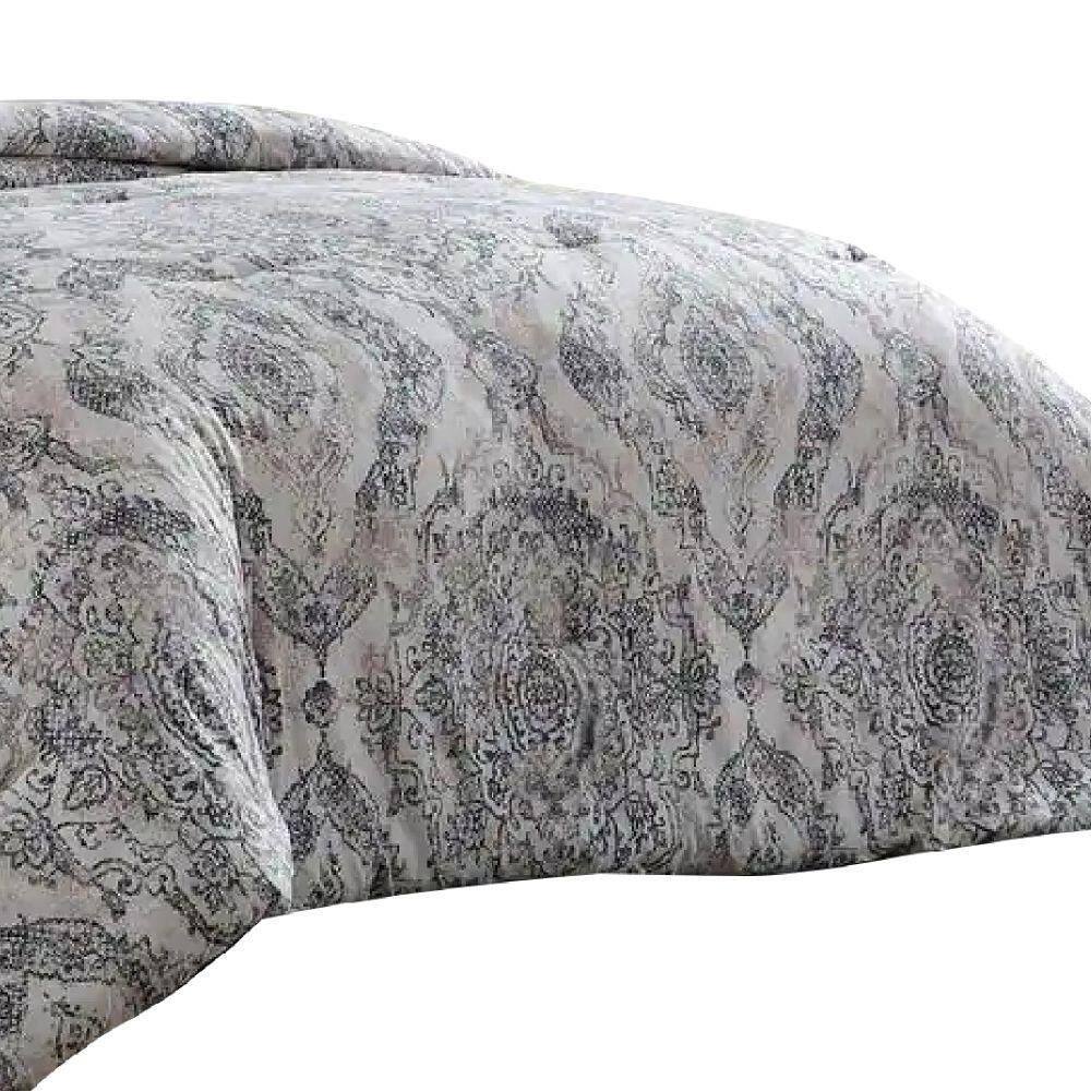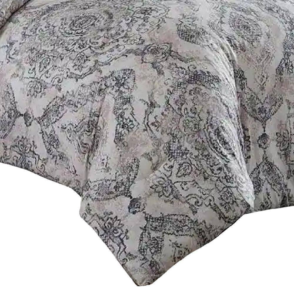 Benjara Lance 8- Piece White and Gray Damask Print Microfiber Queen Bed Comforter Set