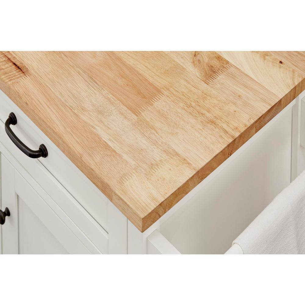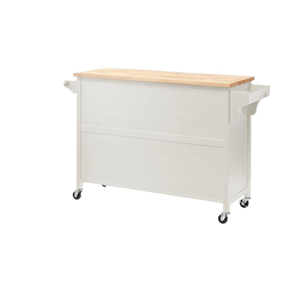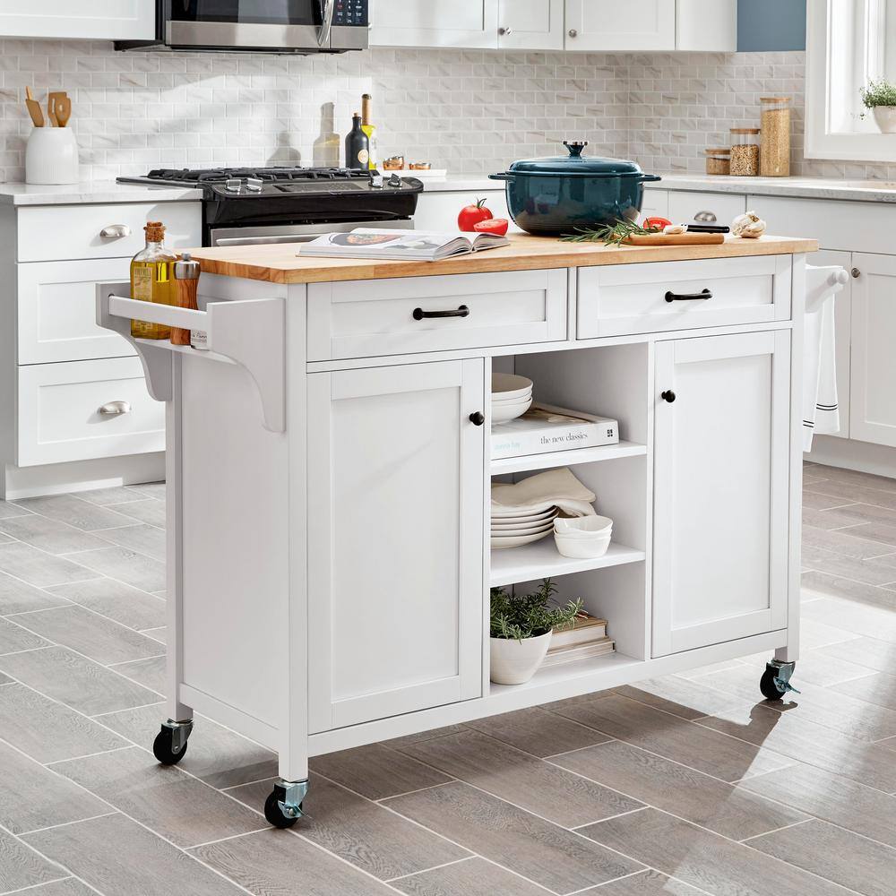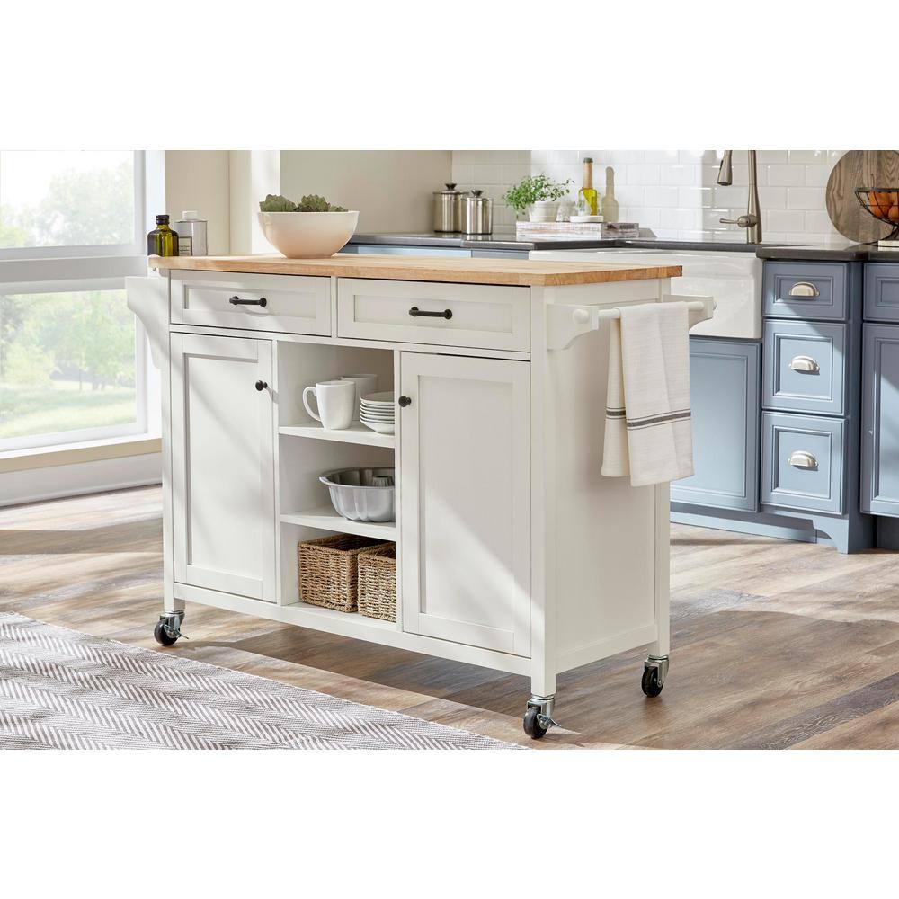 Home Decorators Collection Rockford White Rolling Kitchen Cart with Butcher Block Top and Double-Drawer Storage (56″ W)