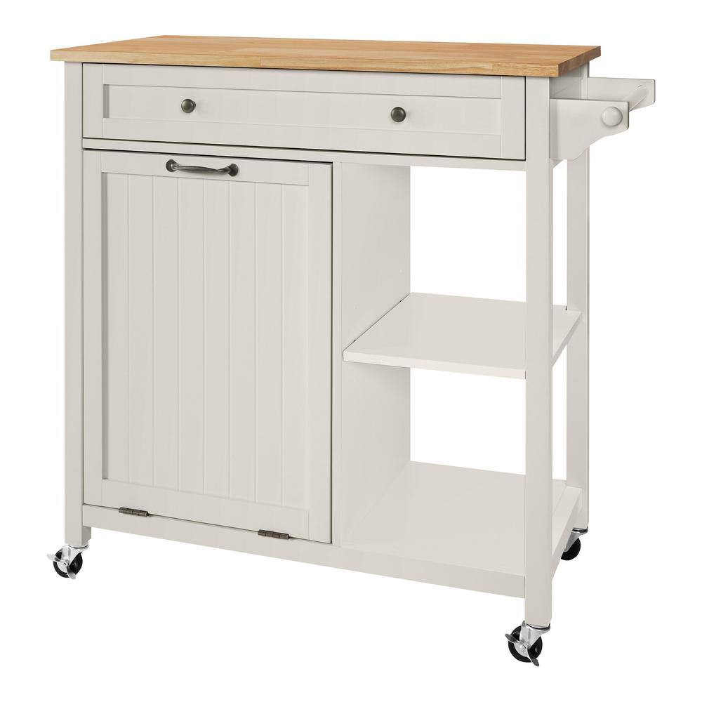 StyleWell Bainport Ivory Wooden Rolling Kitchen Cart Butcher Block Top and Trash Storage (34″ W)
