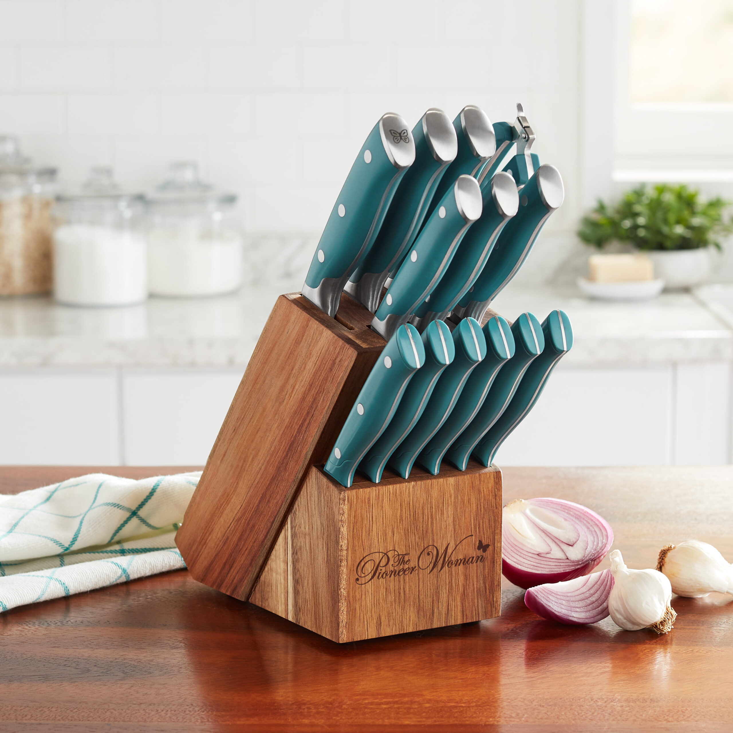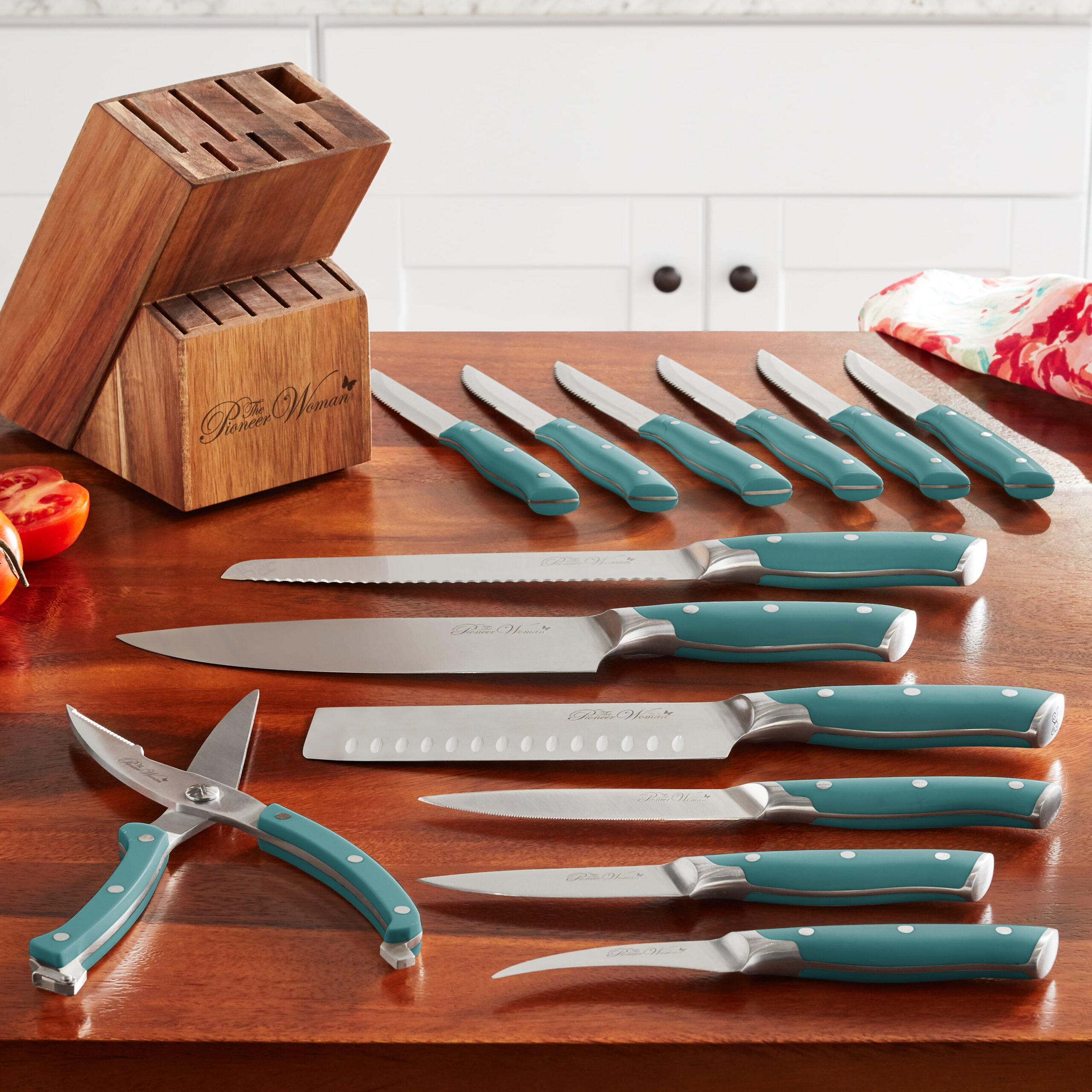 The Pioneer Woman Pioneer Signature 14-Piece Stainless Steel Knife Block Set. Teal