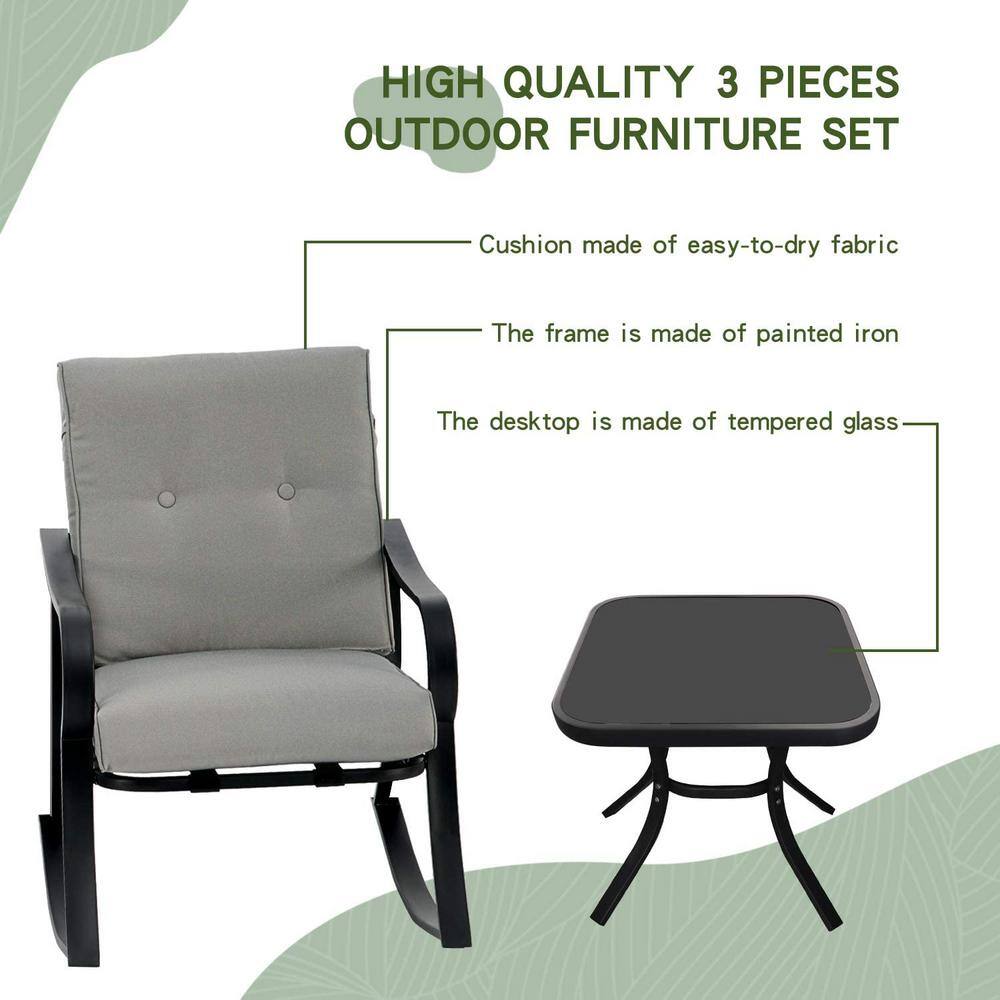 Suncrown 3-Piece Metal Outdoor Bistro Set Rocking Chairs with Gray Cushions