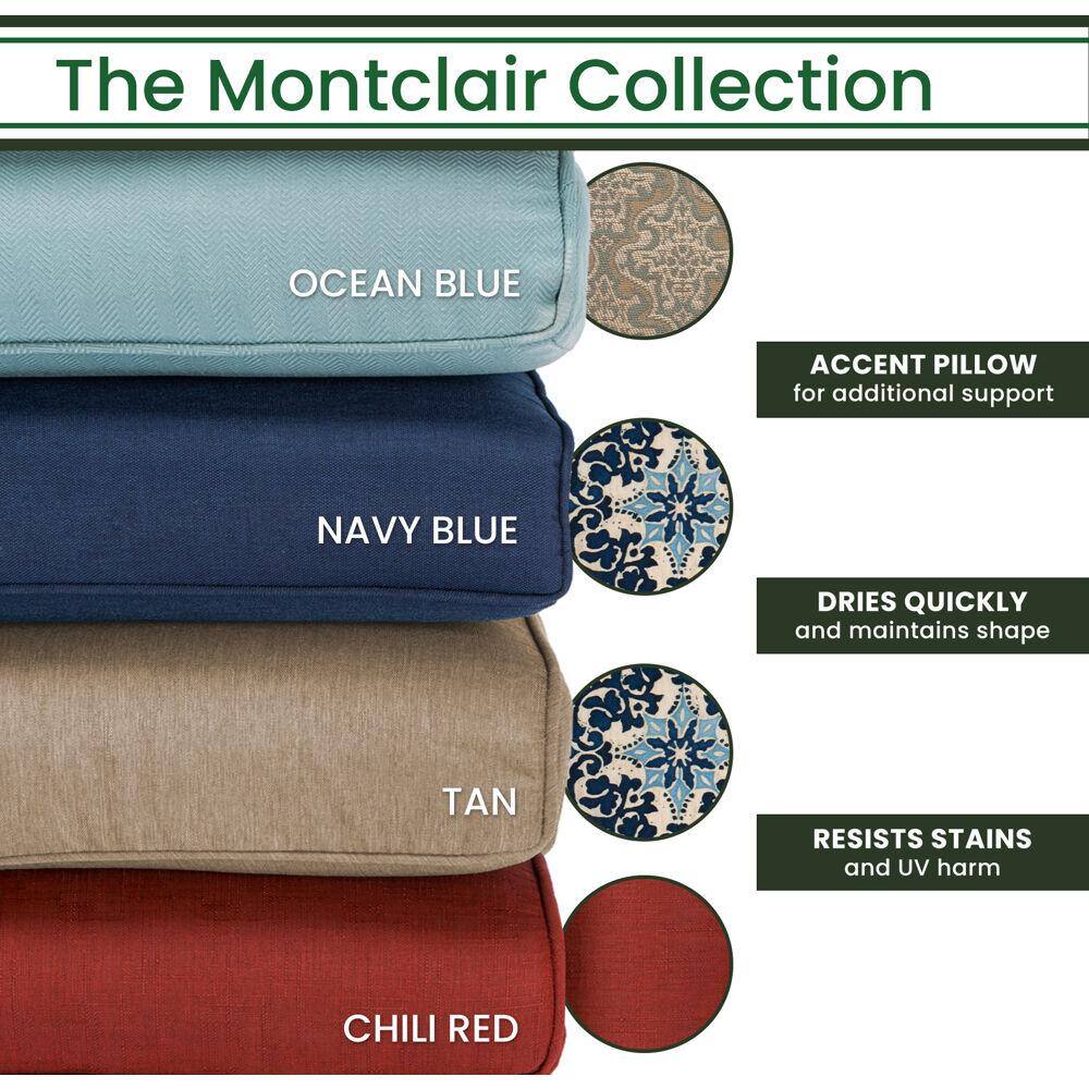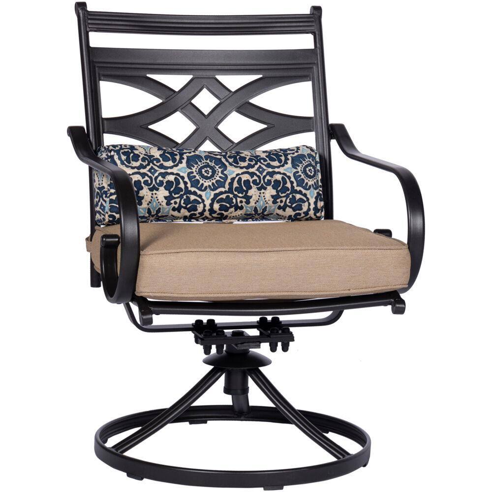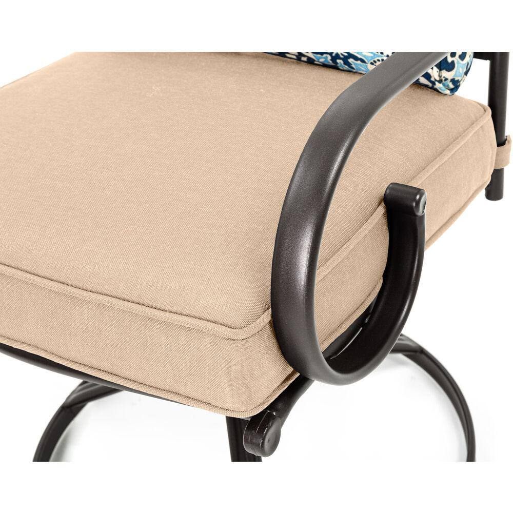 Hanover Montclair 3-Piece Steel Outdoor Bistro Set with Tan Cushions. 2 Swivel Rockers and 27 in. Table