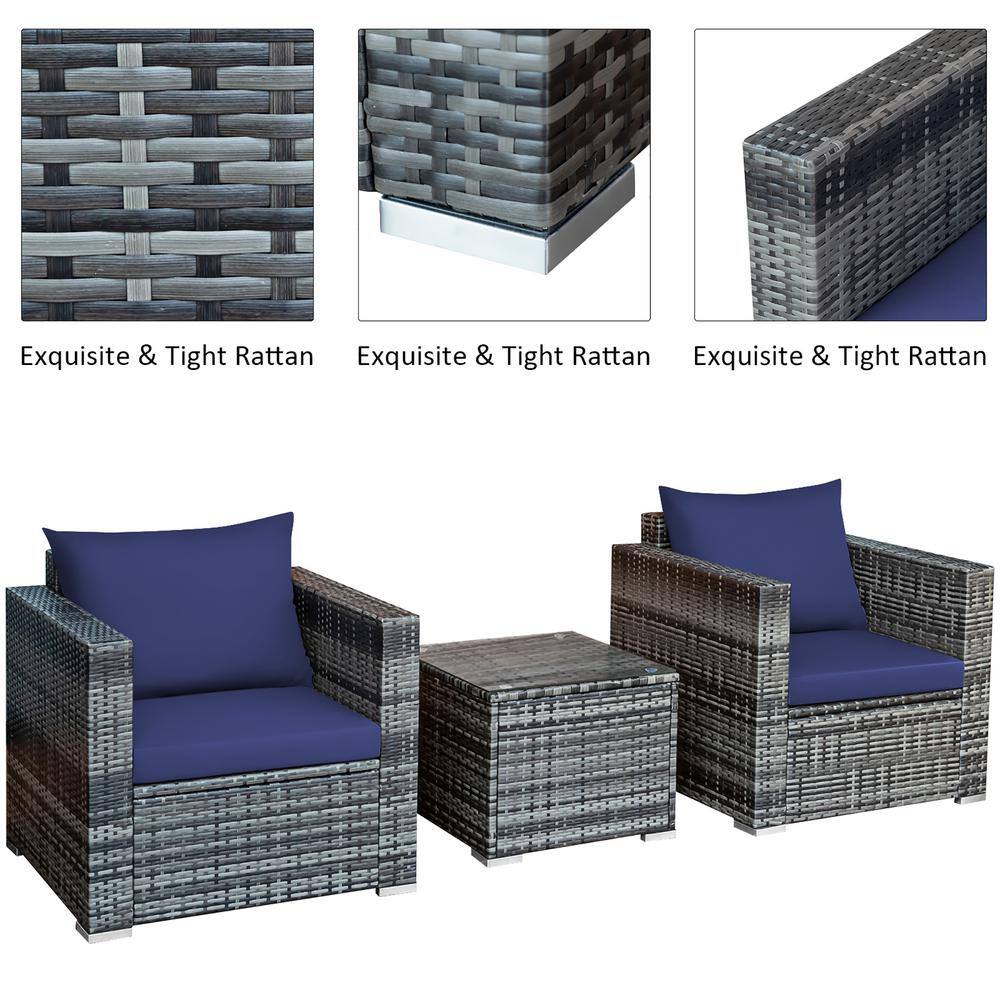Costway 3-Piece Wicker Patio Rattan Furniture Outdoor Bistro Set with Navy Cushions Sofa Chair Table
