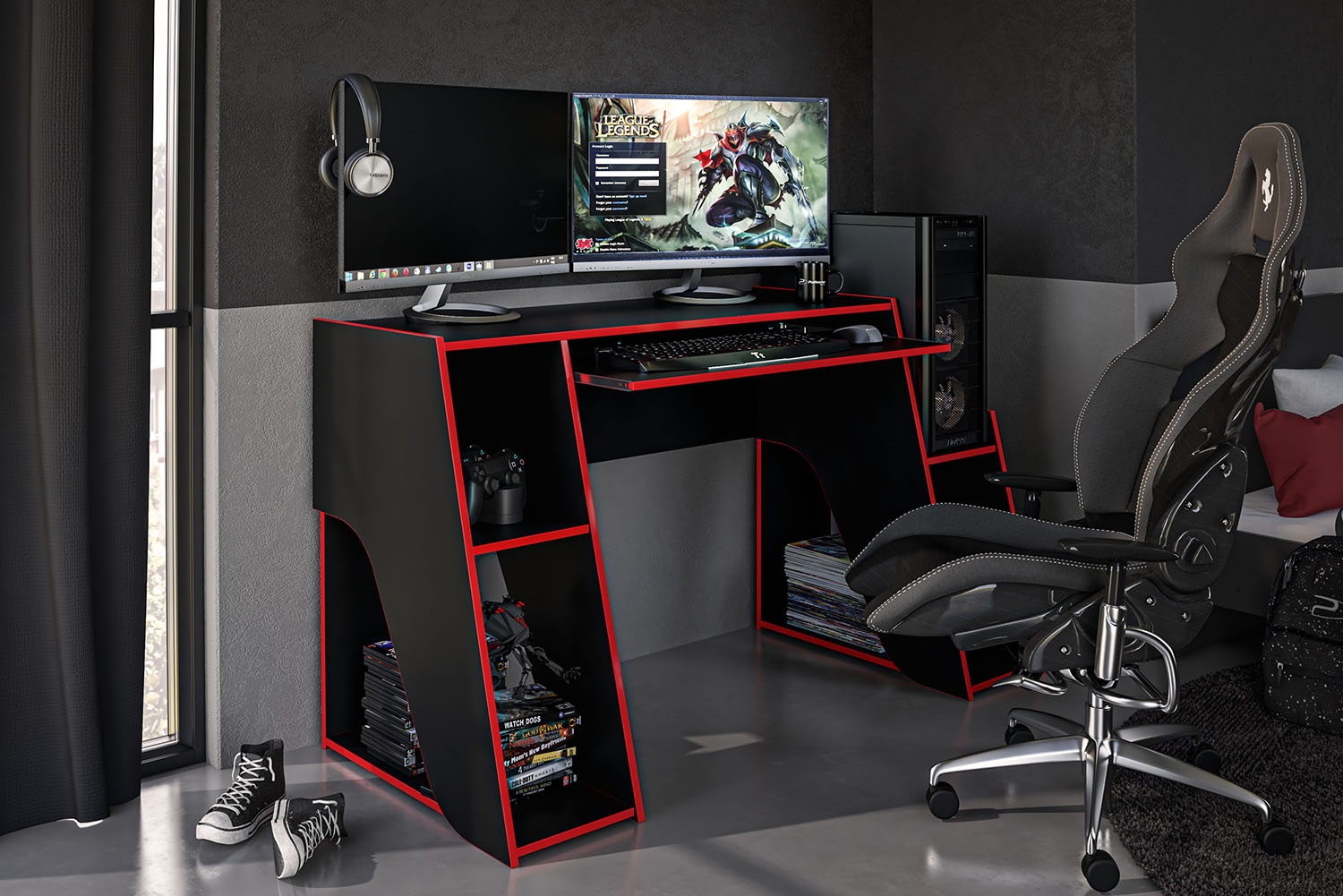 Polifurniture Kyoto Modern 47″ Wood Gaming Desk with Keyboard Tray. Black and Red Finish