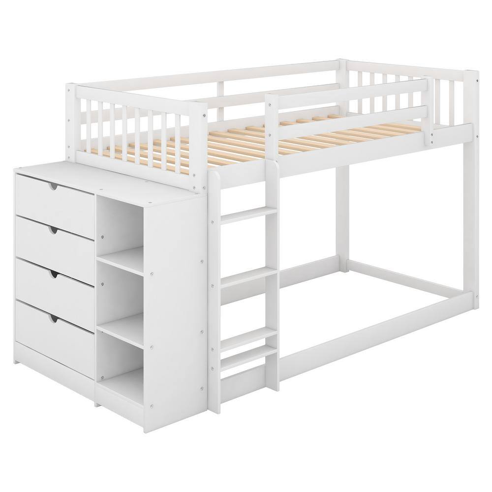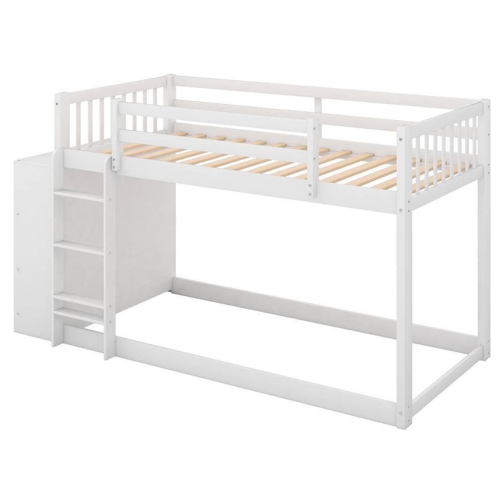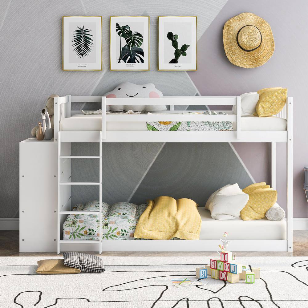 Harper & Bright Designs White Twin over Twin Wood Bunk Bed with Attached Cabinet and Storage Shelves