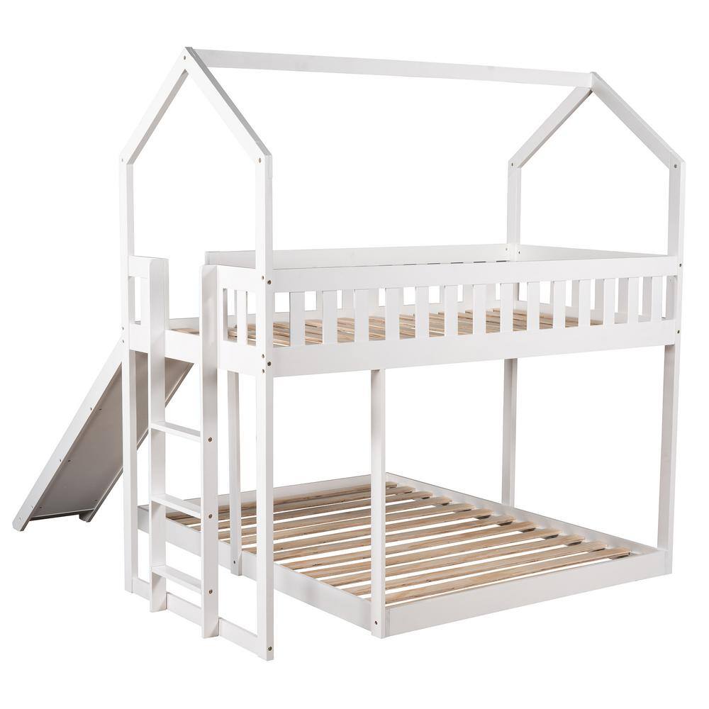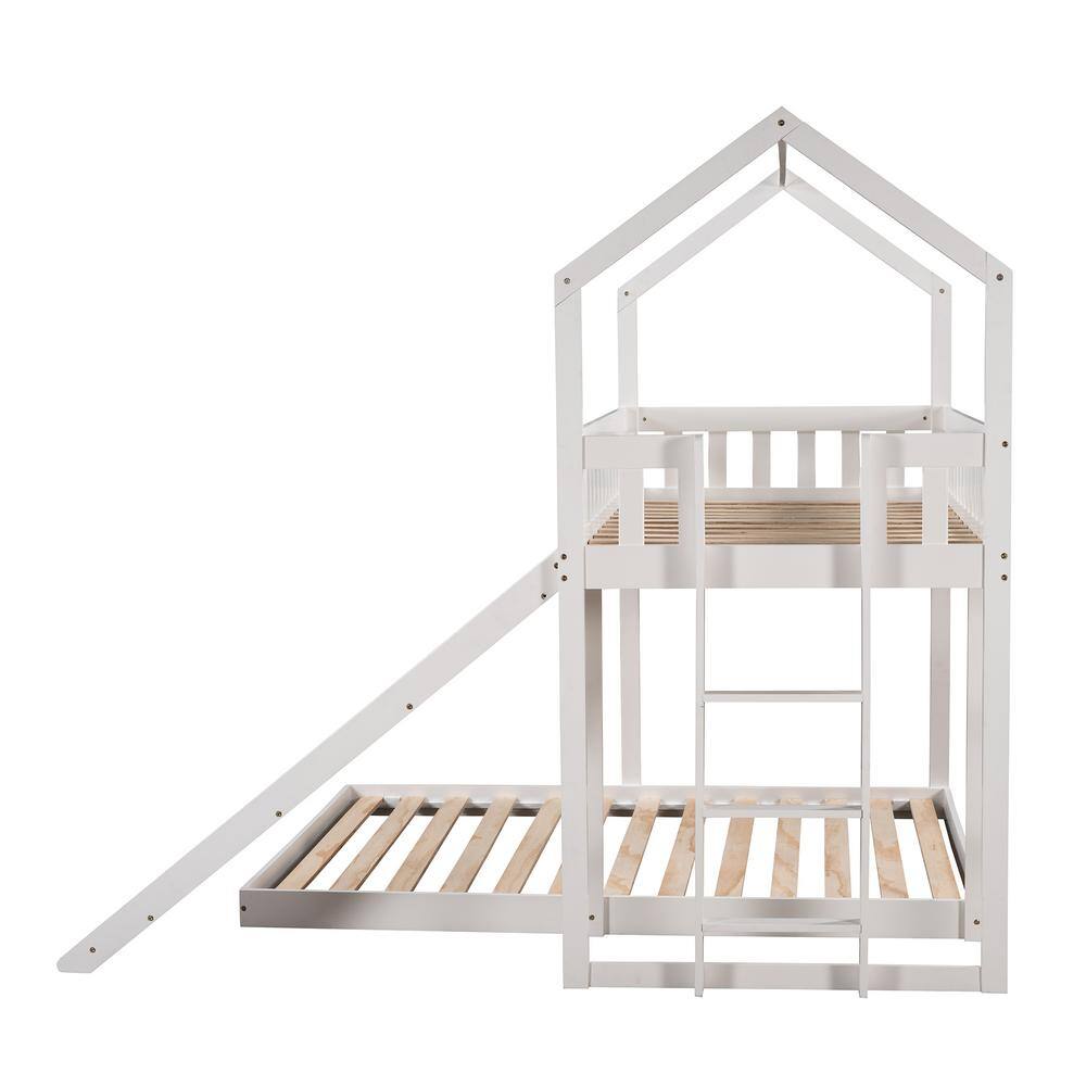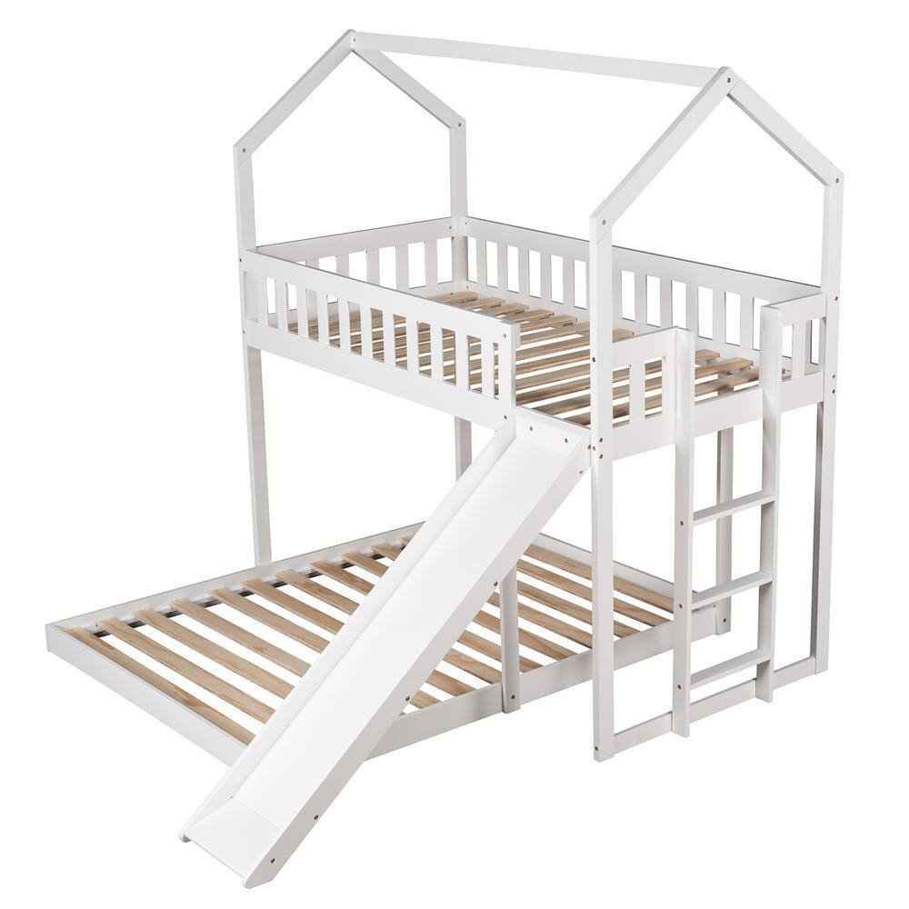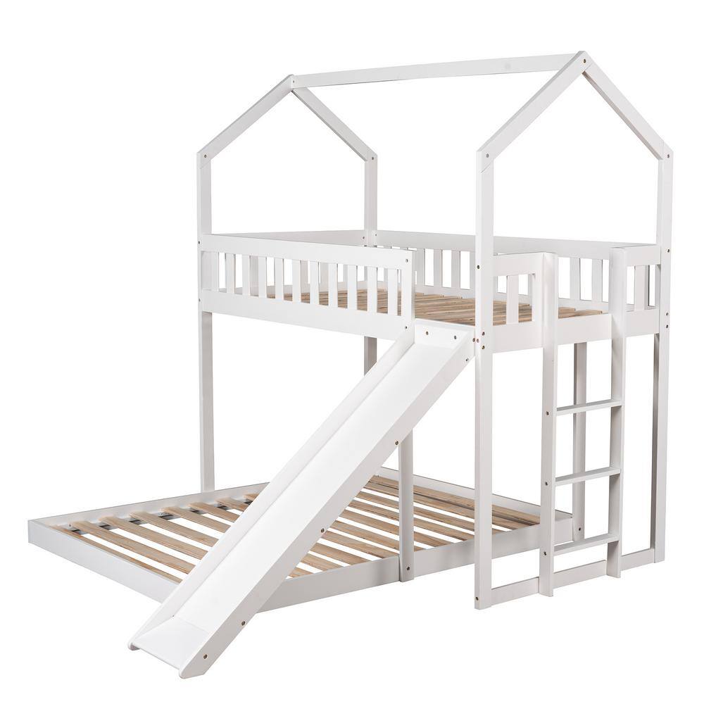 Harper & Bright Designs White Twin over Full Wood House Bunk Bed with Built-in Ladder and Slide