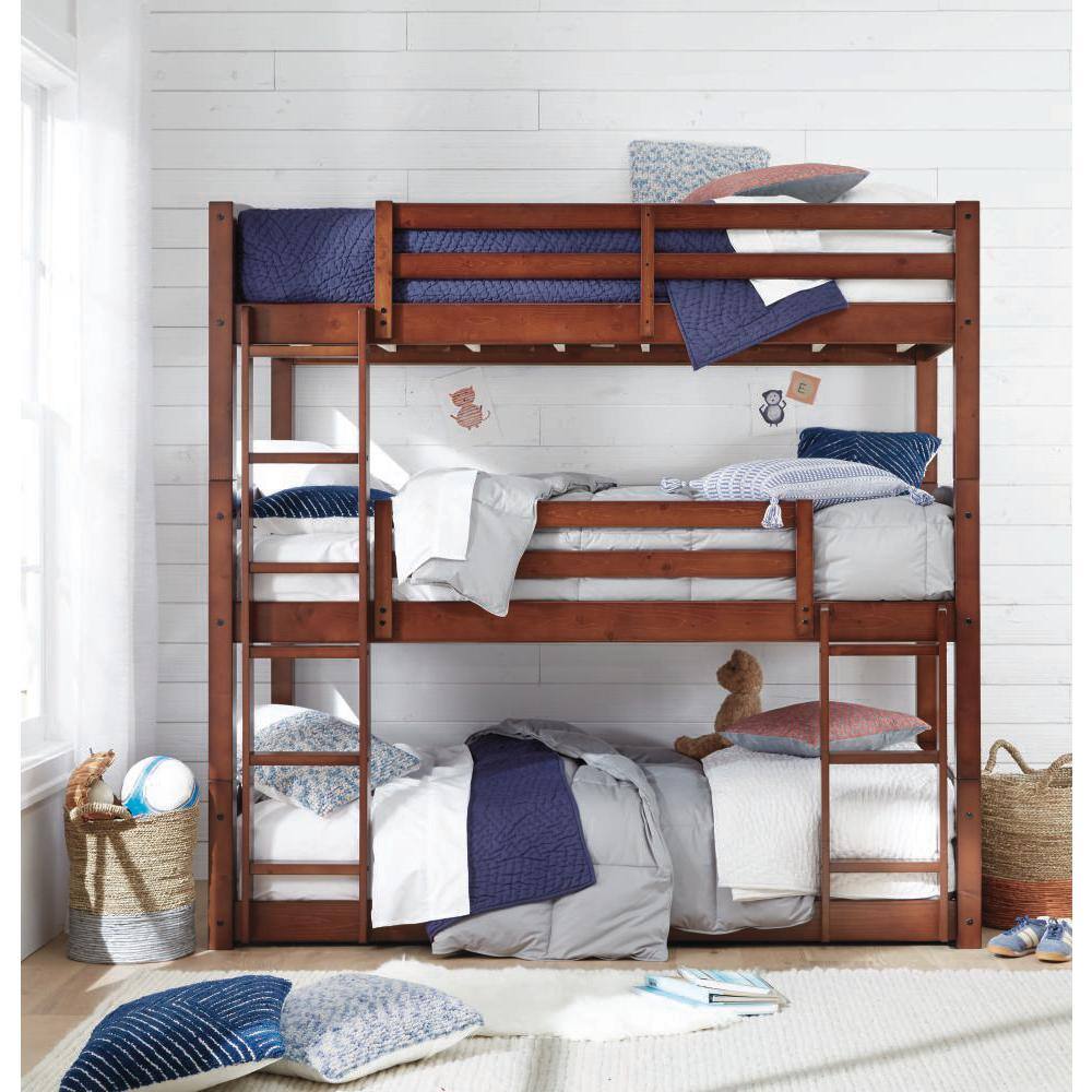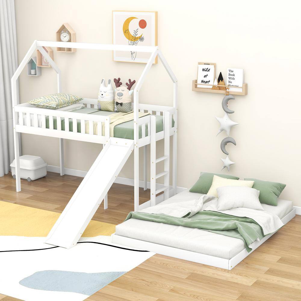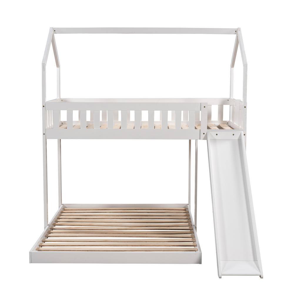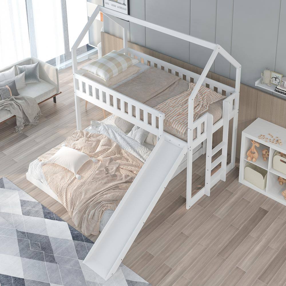 Harper & Bright Designs White Twin over Full Wood House Bunk Bed with Built-in Ladder and Slide