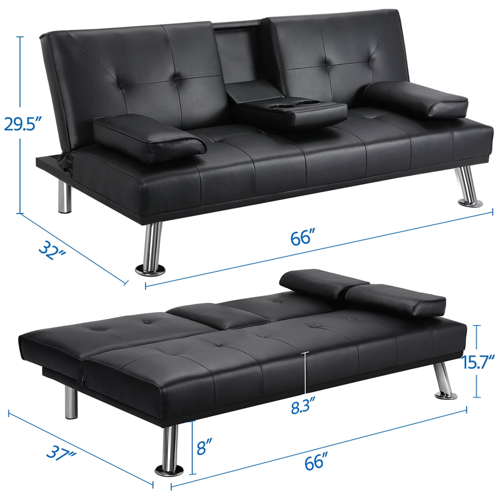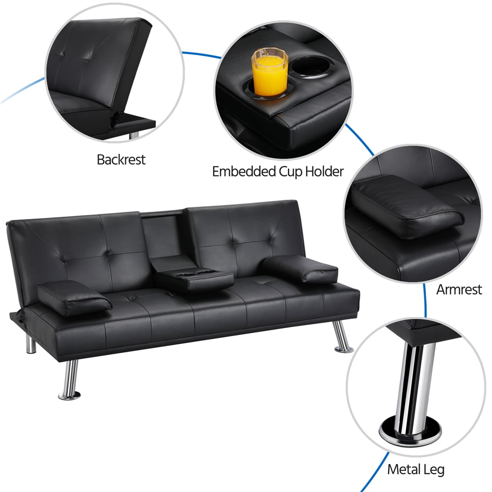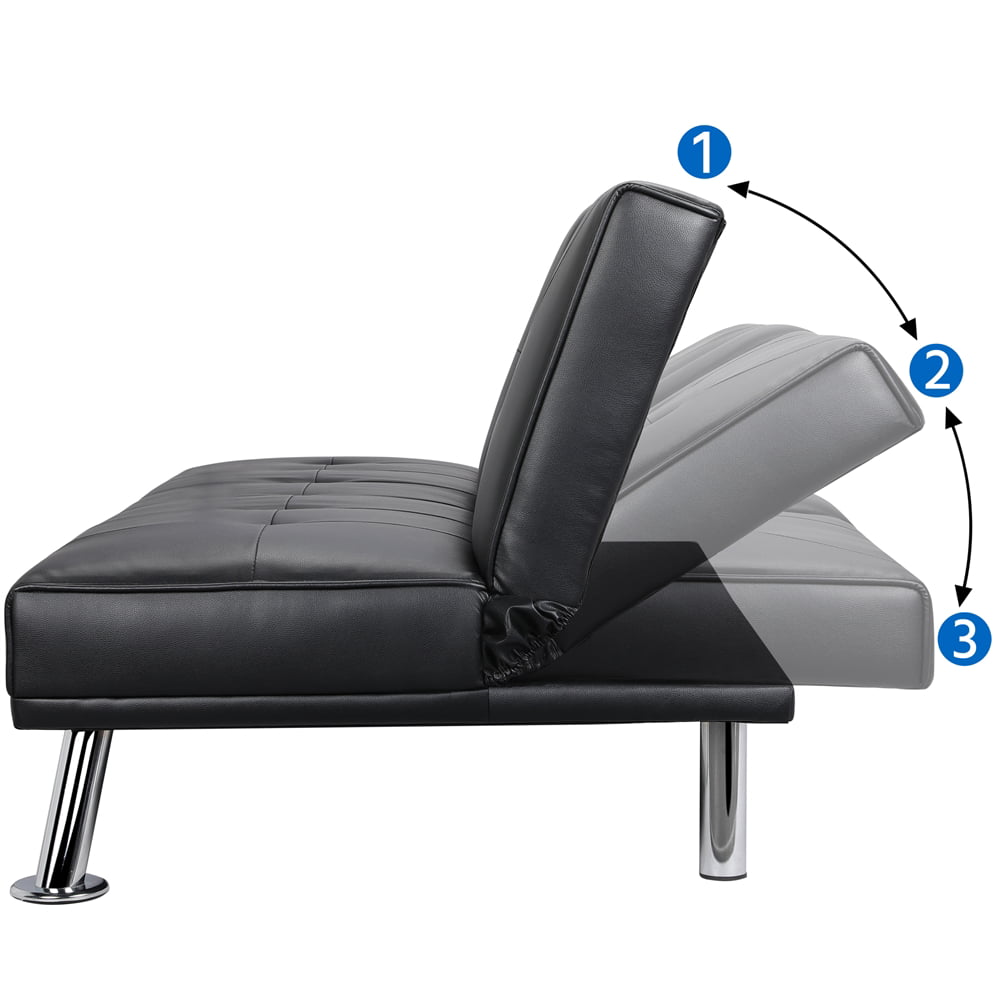 LuxuryGoods Modern Faux Leather Futon with Cupholders and Pillows. Black