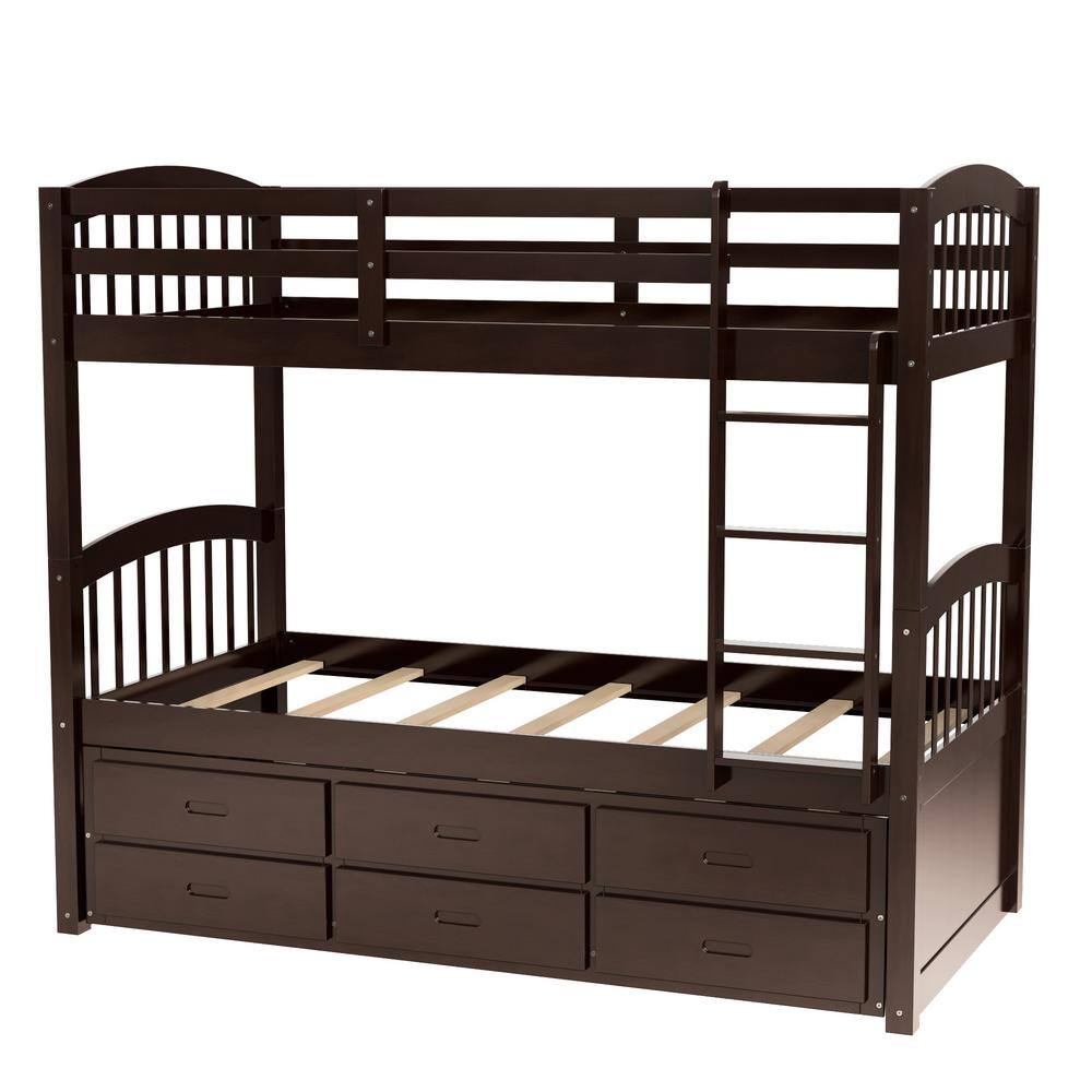 Harper & Bright Designs Espresso Chamblee Twin over Twin Bunk Bed with Trundle and Drawers