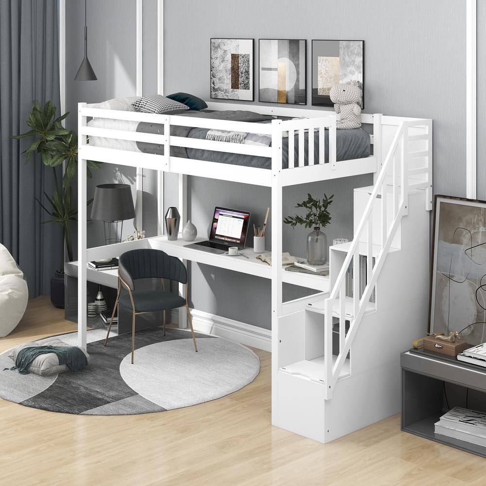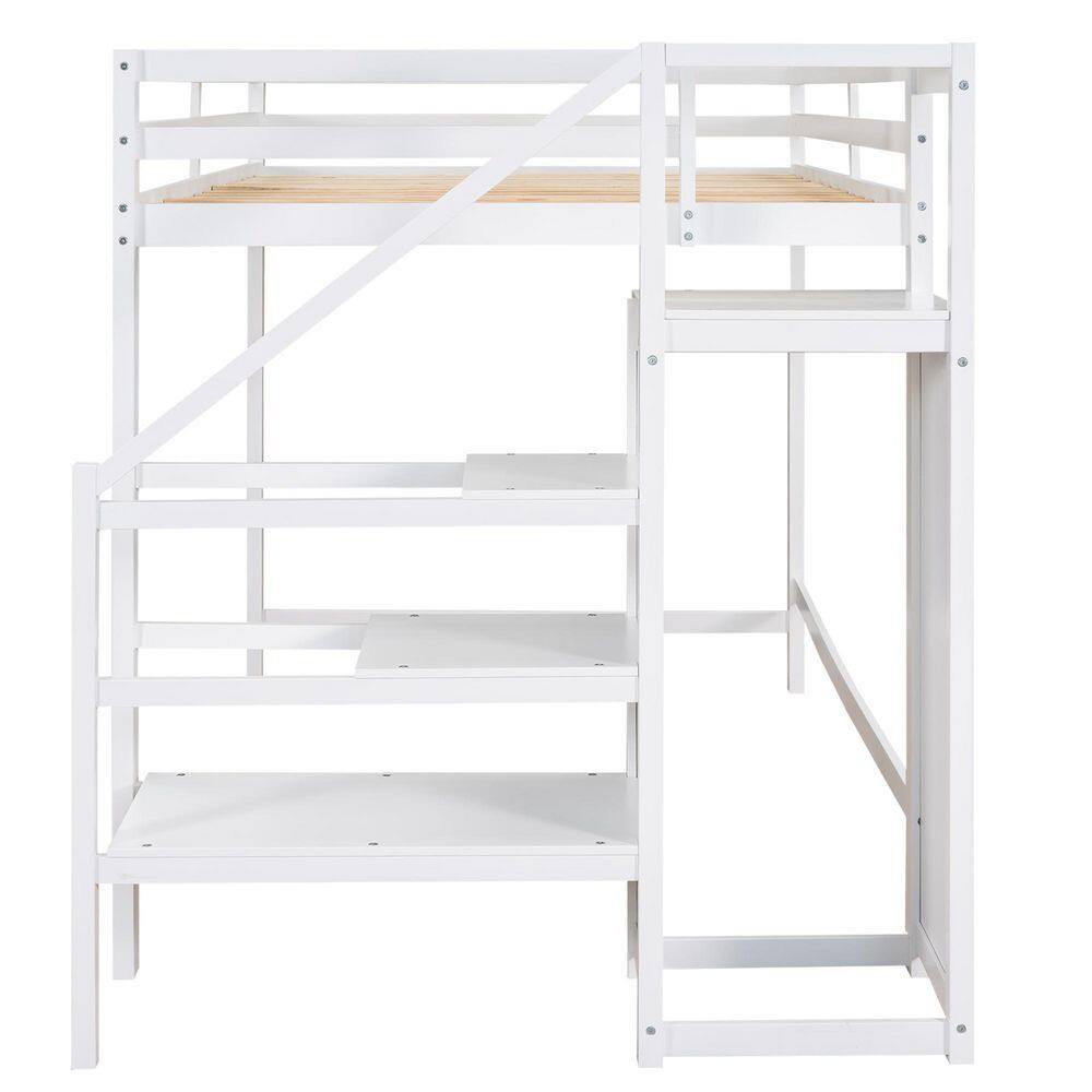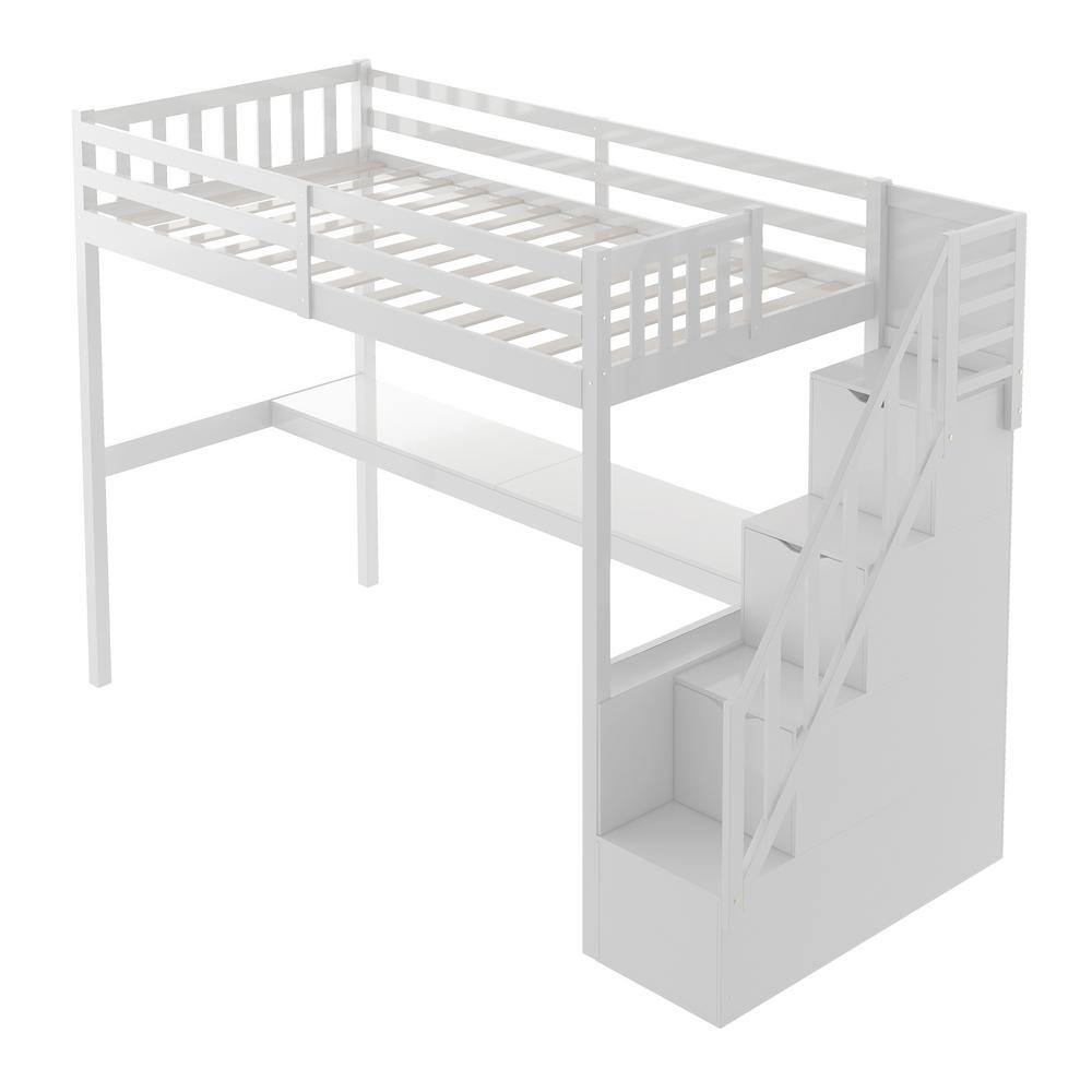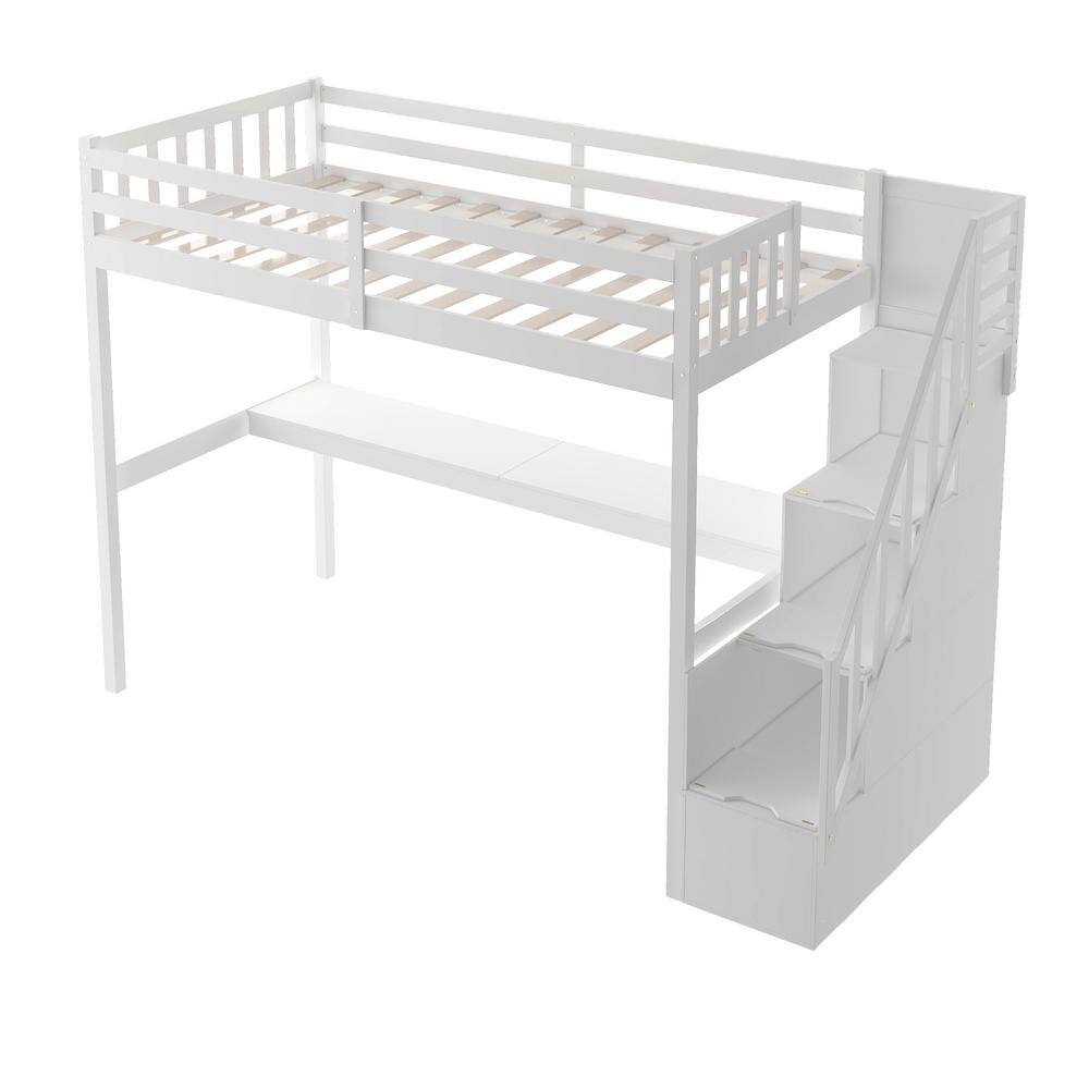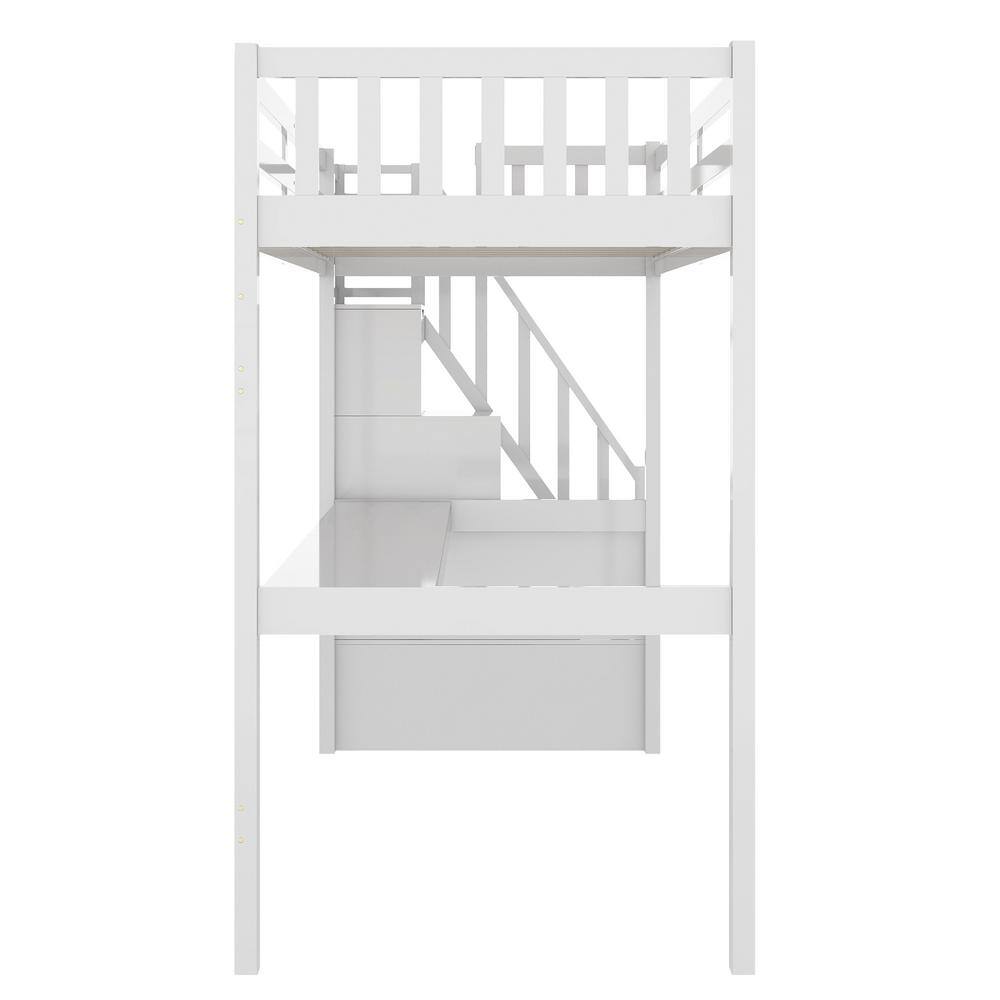 Harper & Bright Designs White Twin Size Wooden Loft Bed with Built in Desk and Staircase