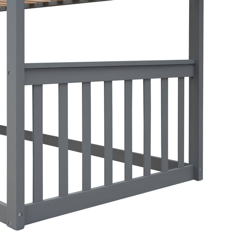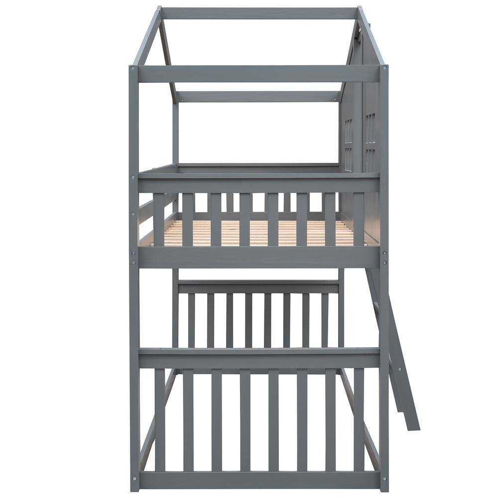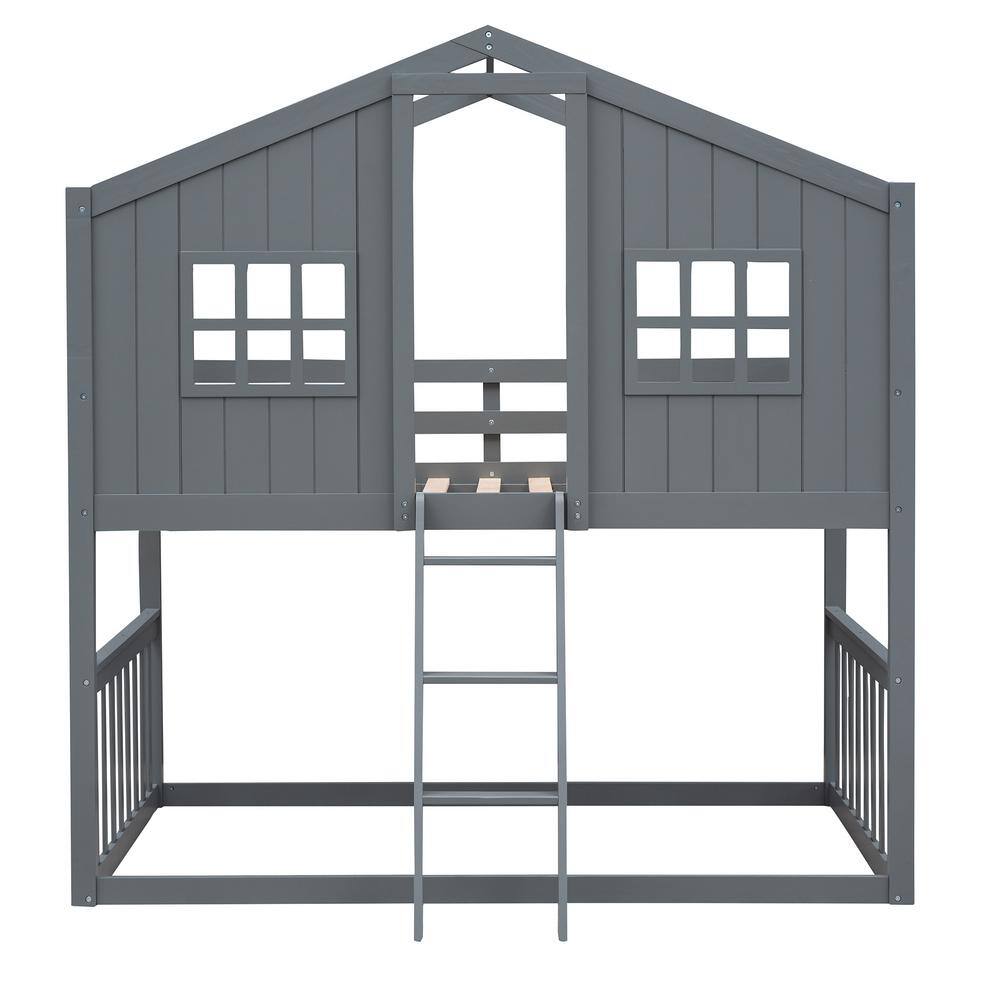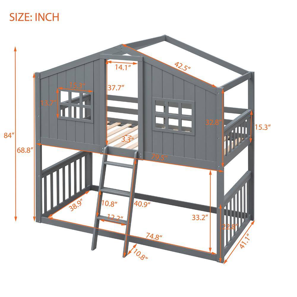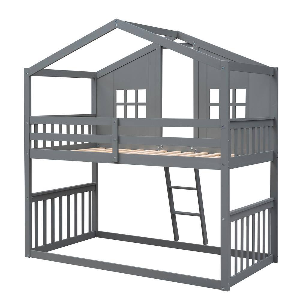 GODEER Gray Twin Over Twin House Bunk Bed With Ladder. Wood Bed