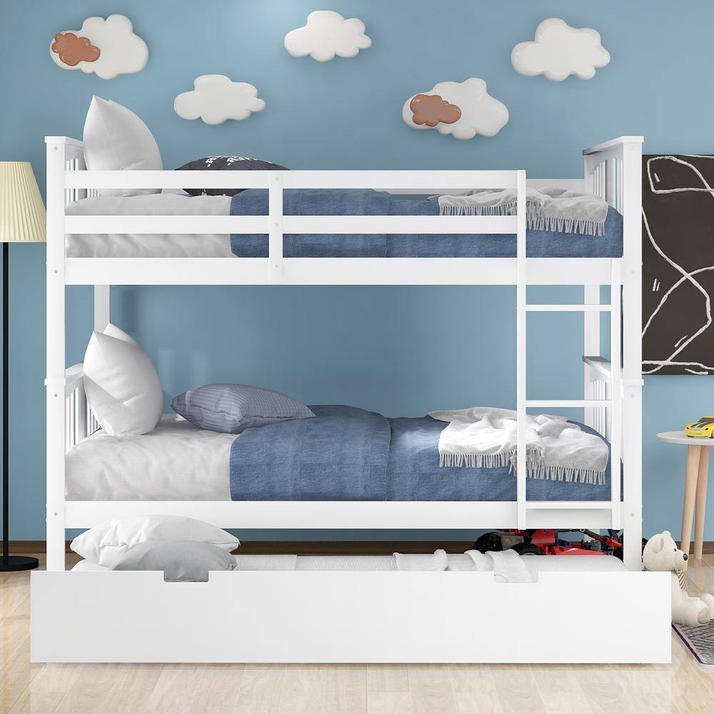 Harper & Bright Designs White Full Wood Bunk Bed with Twin Size Trundle and Ladder