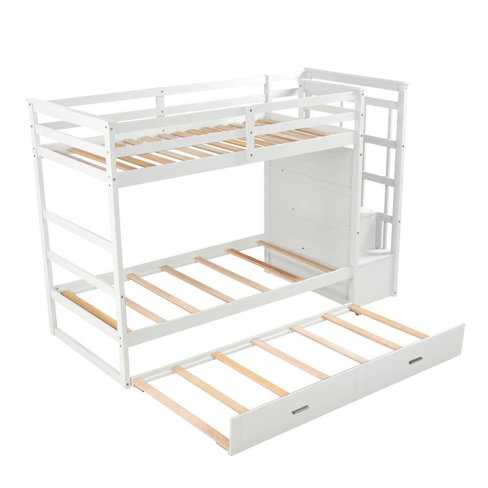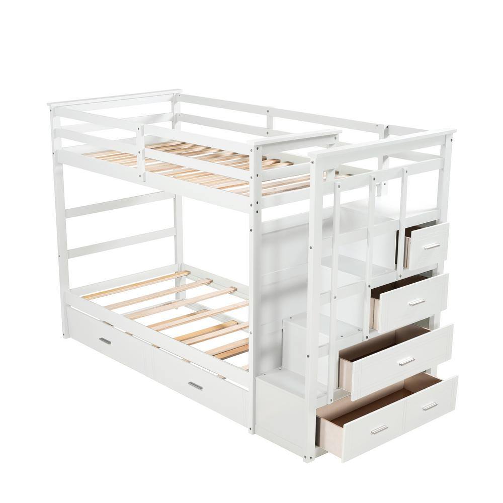 ANBAZAR White Twin Over Twin Bunk Bed with Twin Trundle and 4 Drawers. Wood Kids Bunk Bed Frame with Staircases and Guardrail