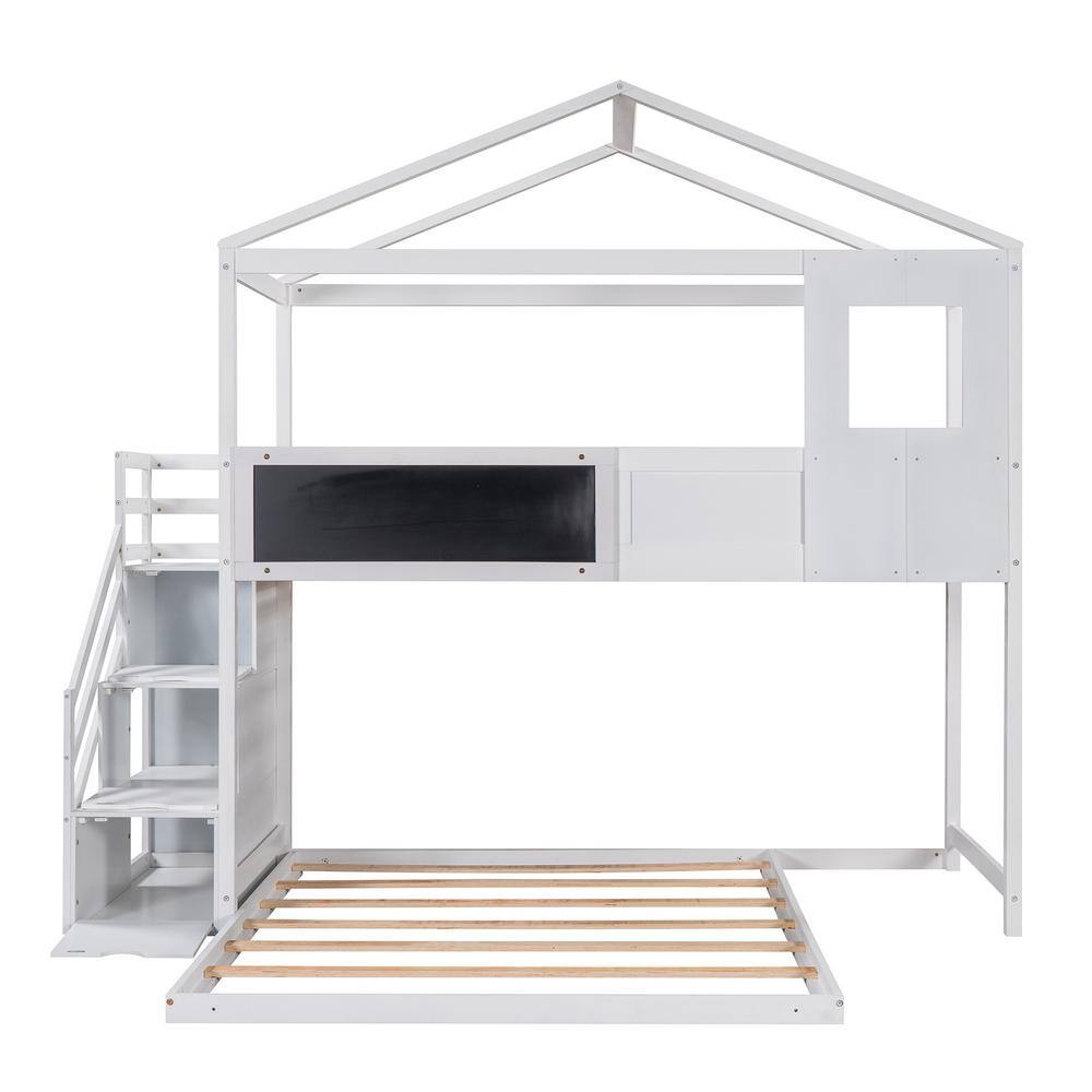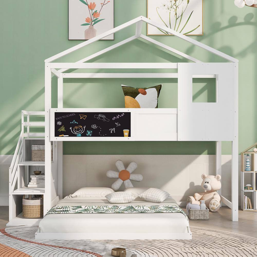 Qualler White Twin Over Full House Bunk Bed With Storage Staircase and Blackboard