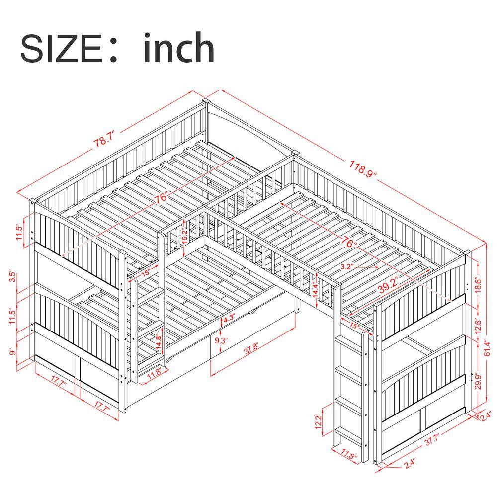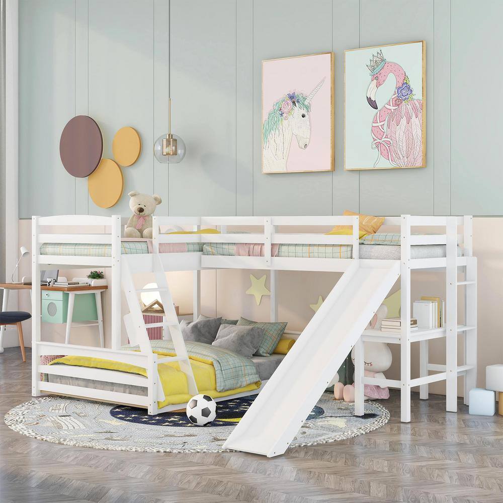 Harper & Bright Designs L-Shaped White Twin Over Full Triple Bunk Bed with Ladder. Slide and Desk
