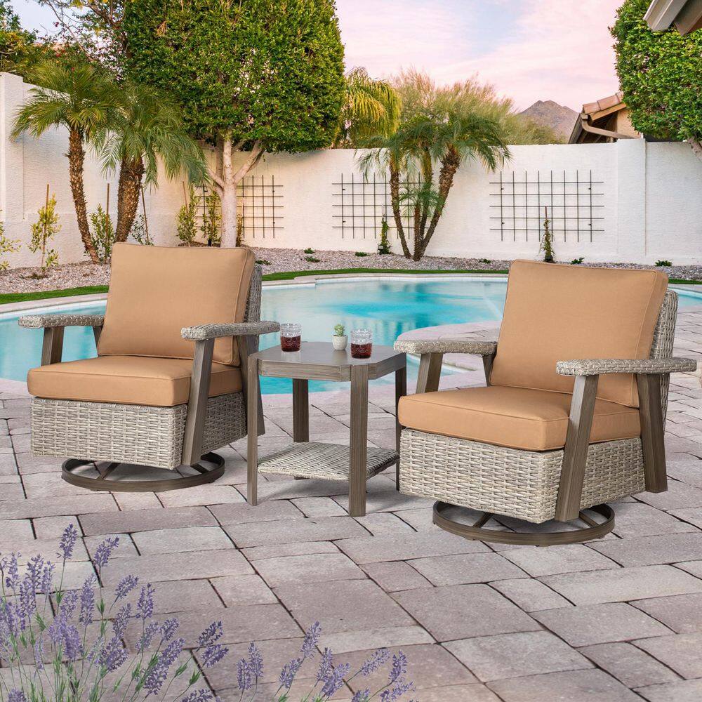 JOYSIDE 3-Piece Wicker Patio Swivel Rocking Chair Conversation Set with Tan Cushions