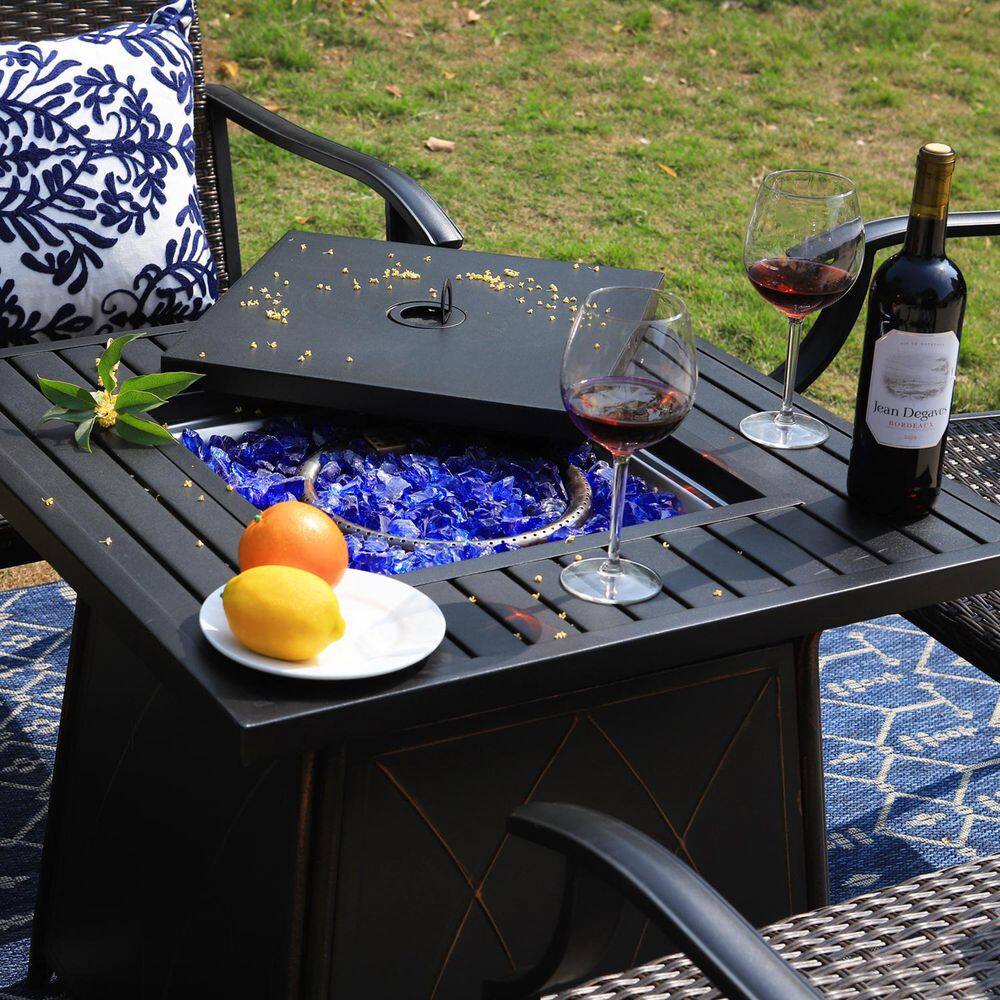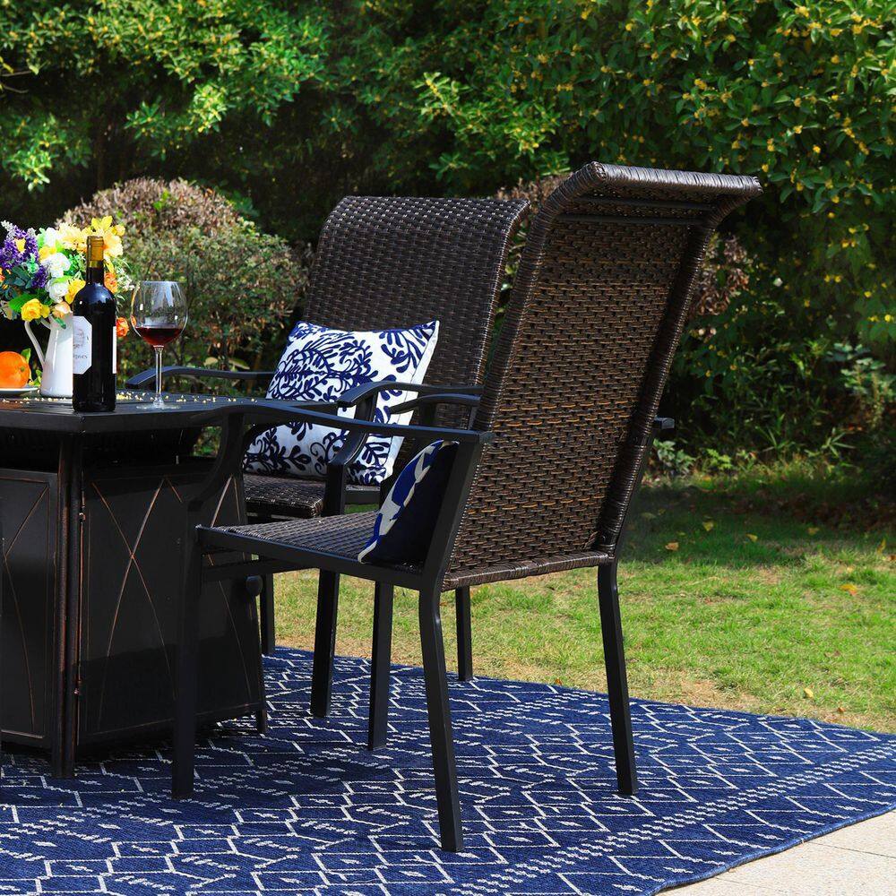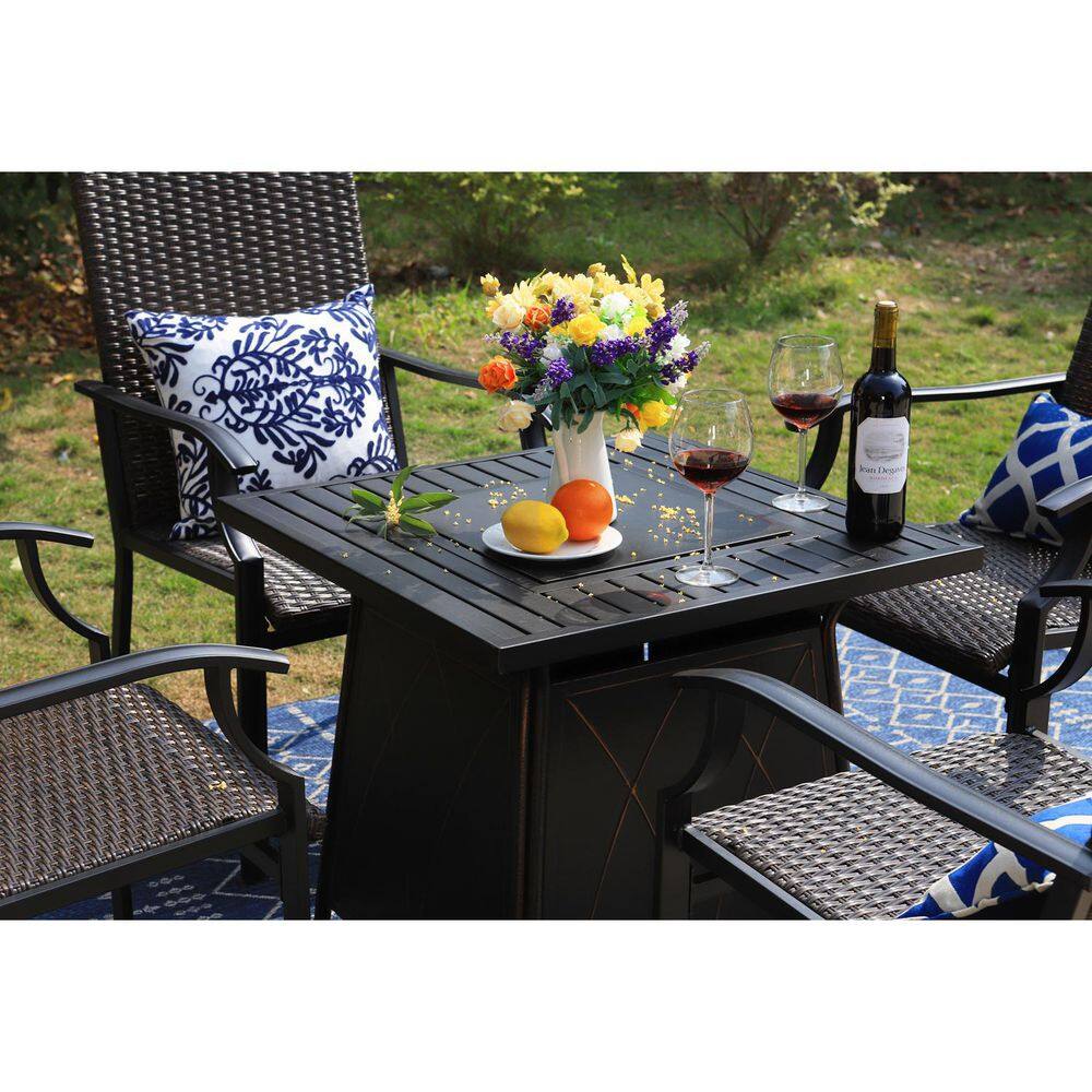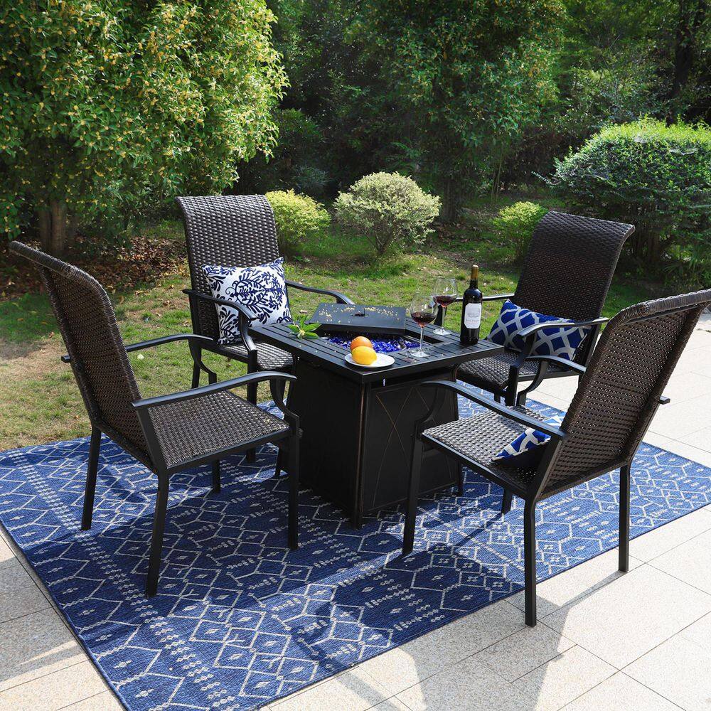 PHI VILLA 5-Piece Rattan Patio Fire Pit Set. 4 Chairs with Wave Armrest High in Back