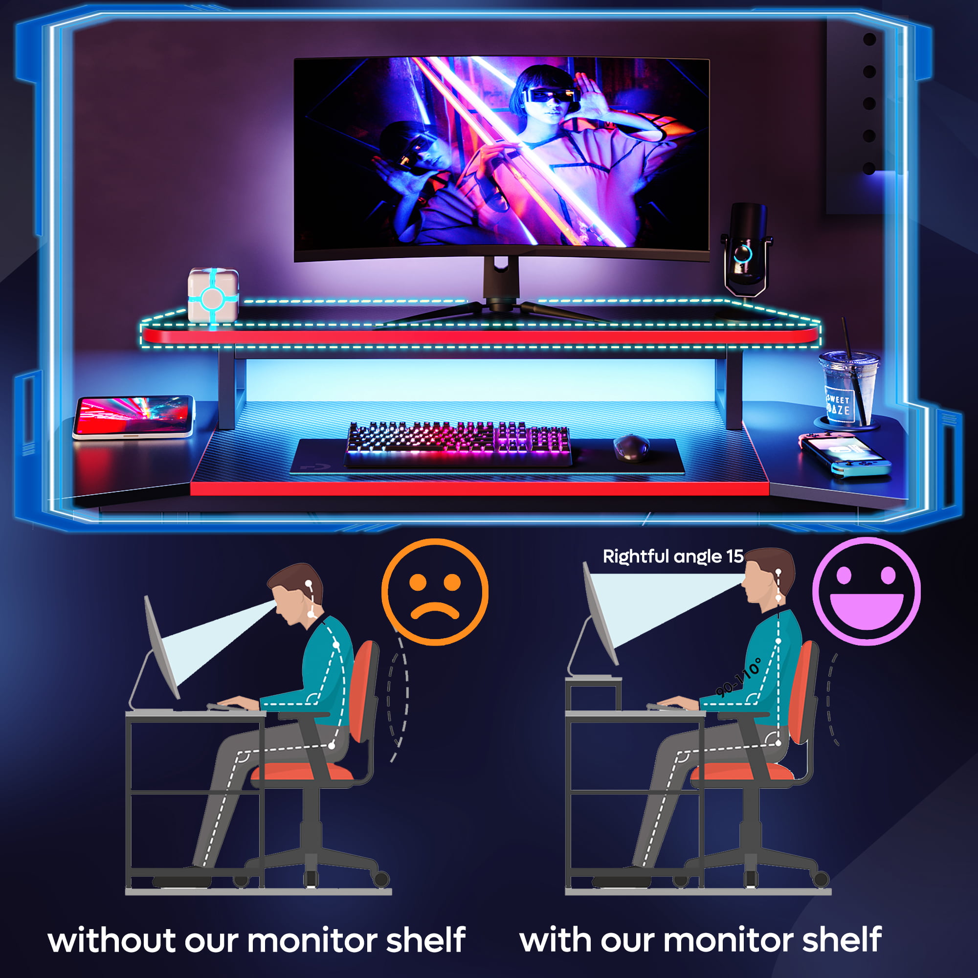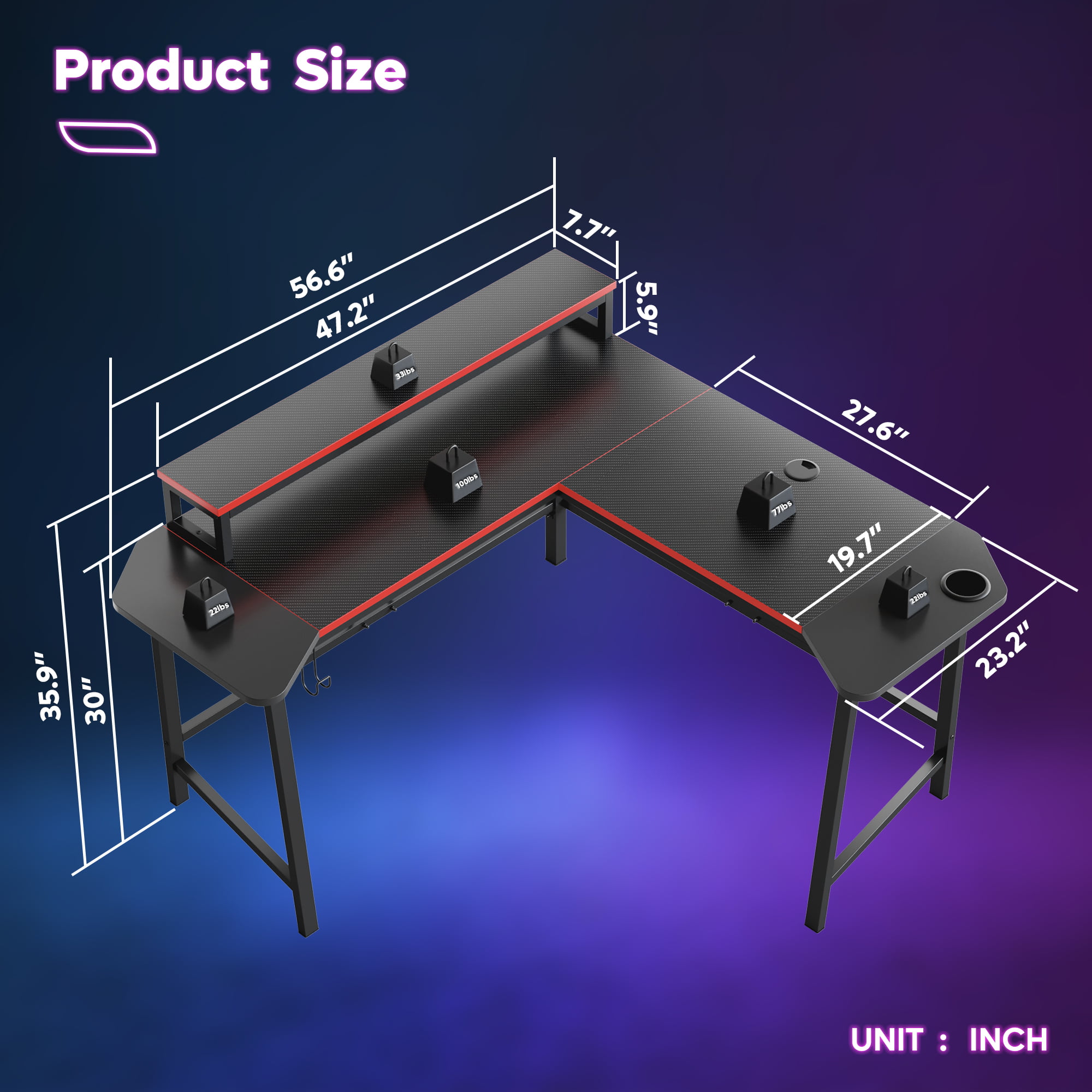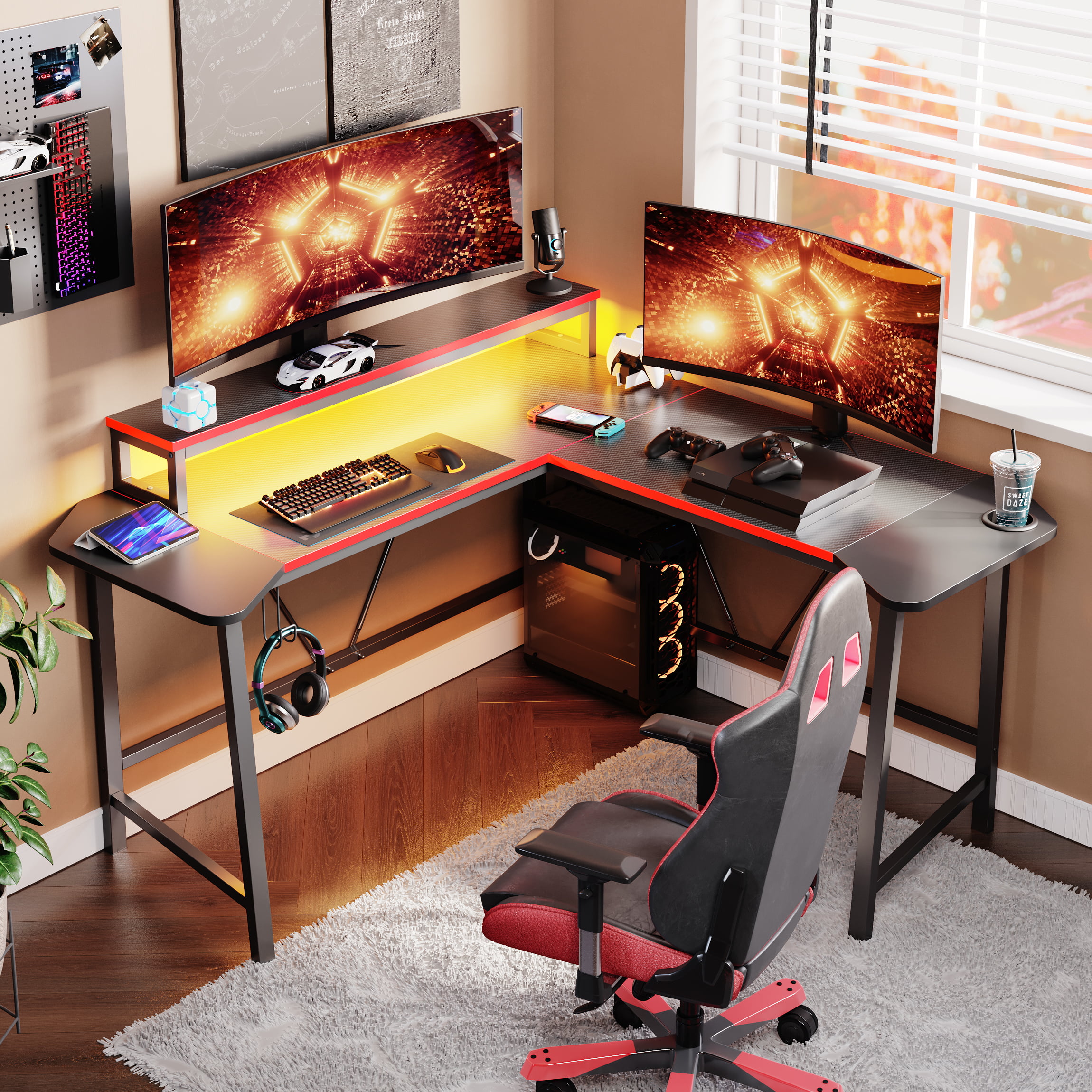 Bestier 56.6″ L Shaped Gaming Desk with LED Lights Home Office Table.Carbon Fiber