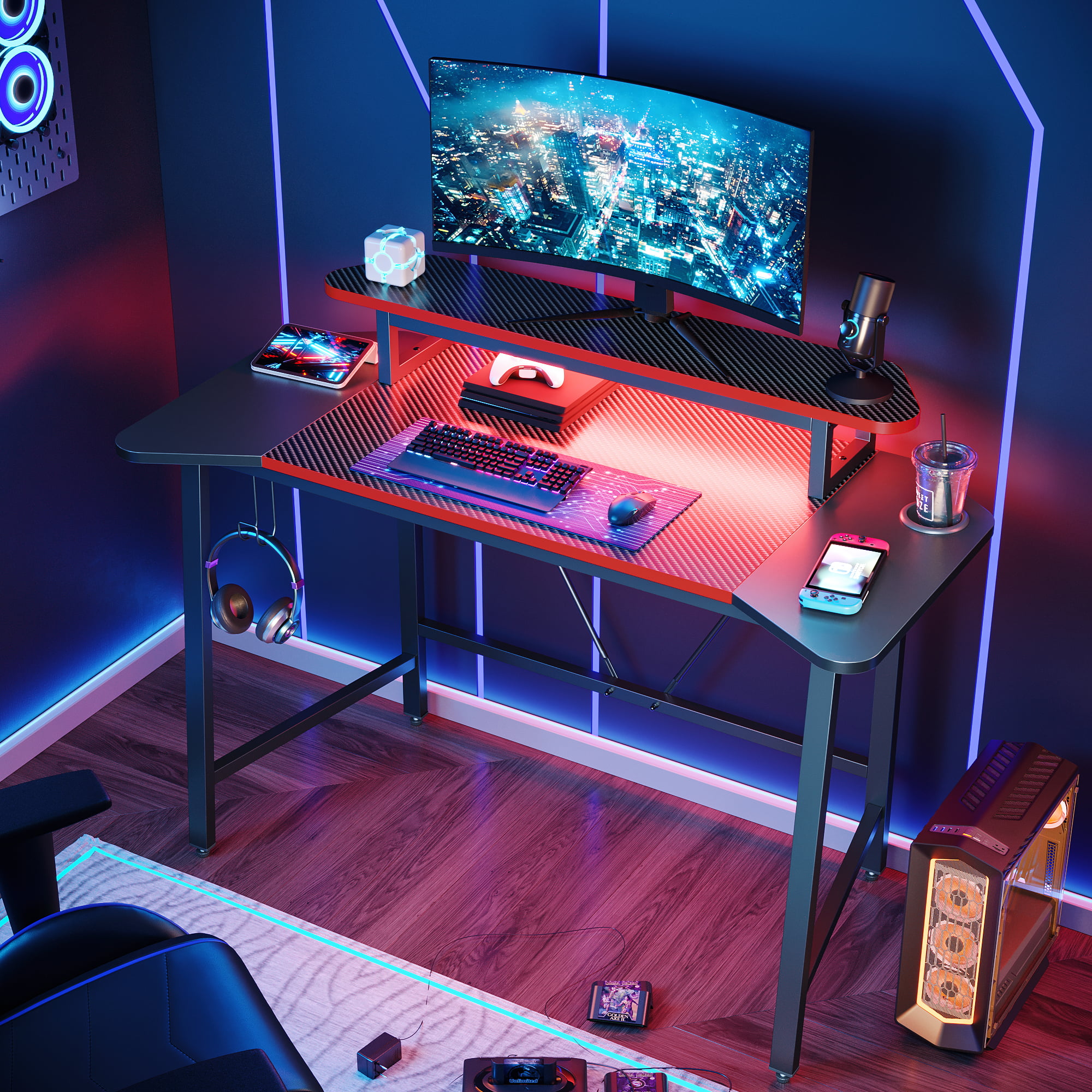 Homall 44 Inches Z-Shaped Gaming Desk Carbon Fiber Surface Desk with Cup Holder & Headphone Hook. Black