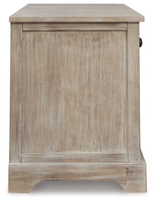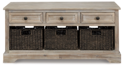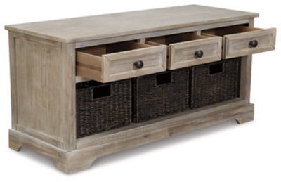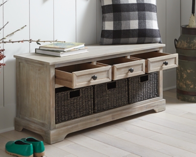 Signature Design by Ashley Oslember Farmhouse Storage Bench with Drawers and 3 Removable Baskets. Brown