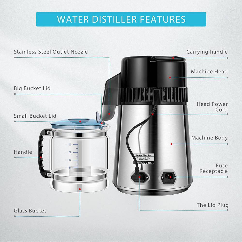 VEVOR Water Distiller 1.1 Gal. Distilled Water Maker 750 Watt Dual-Button Distilled Water Machine with Glass Container. Sliver