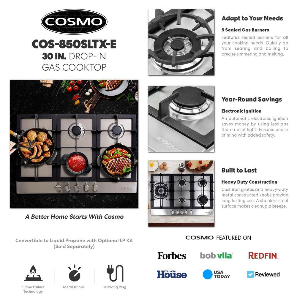 Cosmo 1001652307 30 in. Gas Cooktop in Stainless Steel with 5 Sealed Brass Burners