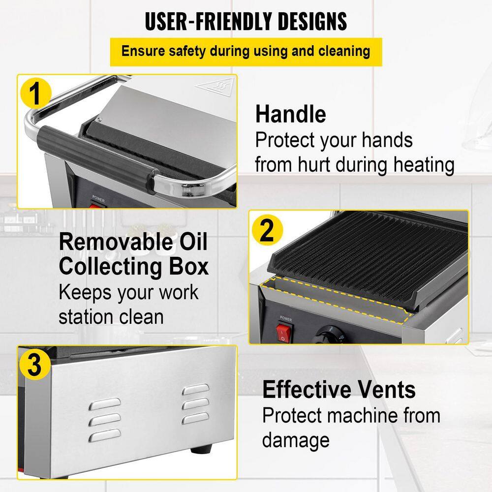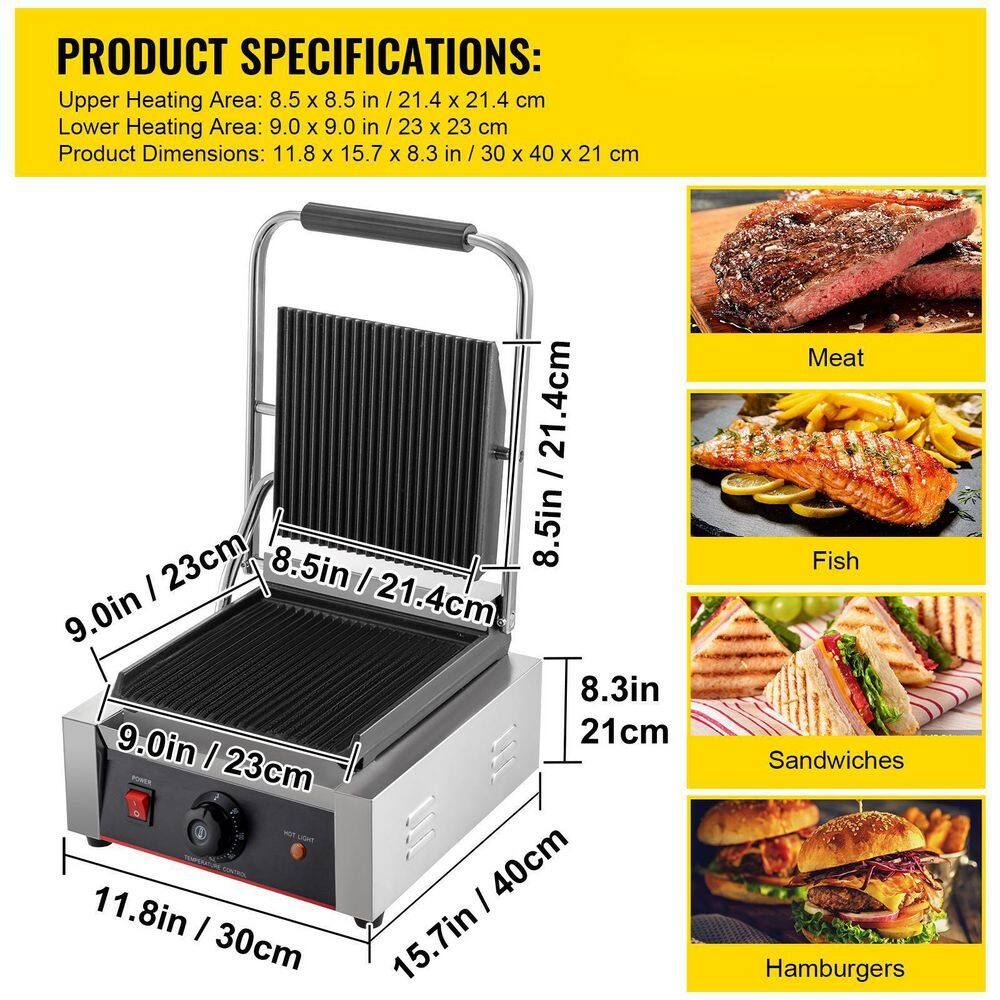 VEVOR Commercial Sandwich Panini Press Grill 1800-Watt Single Full Grooved Plates Stainless Steel Sandwich Maker. Silver