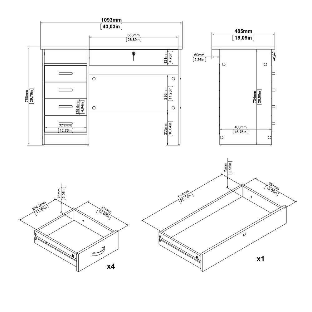 Tvilum 43 in. Rectangular White 5 Drawer Writing Desk with Locking Feature