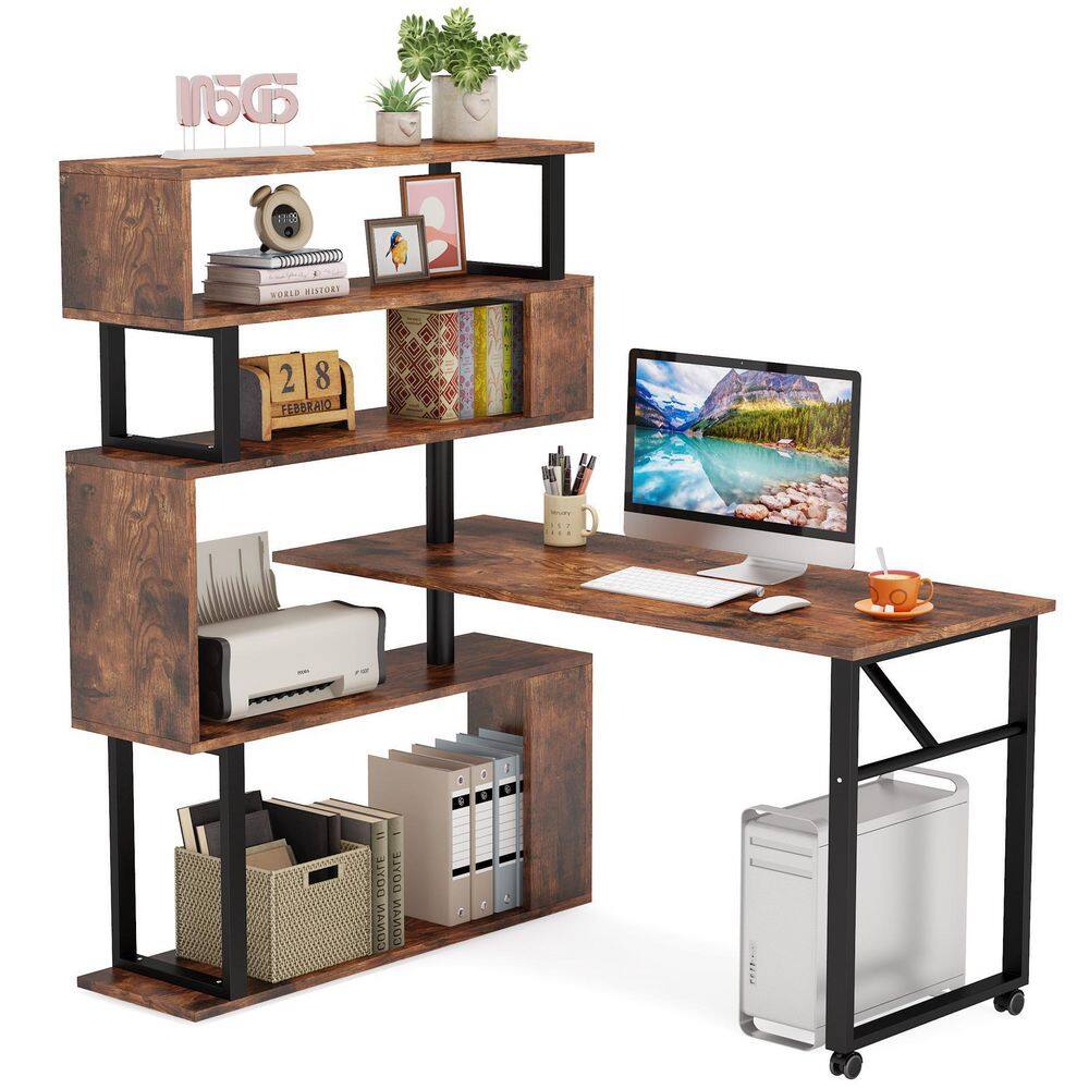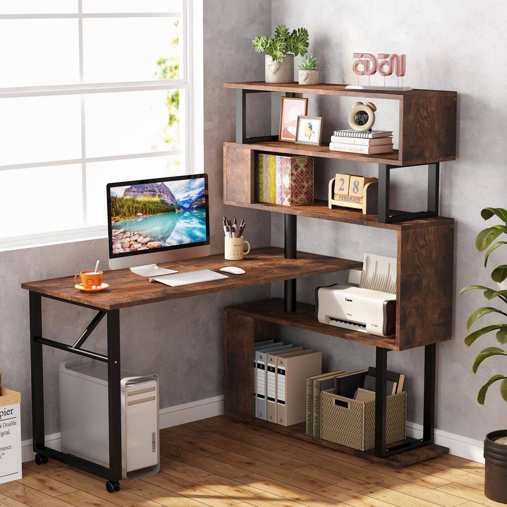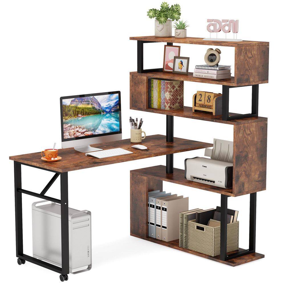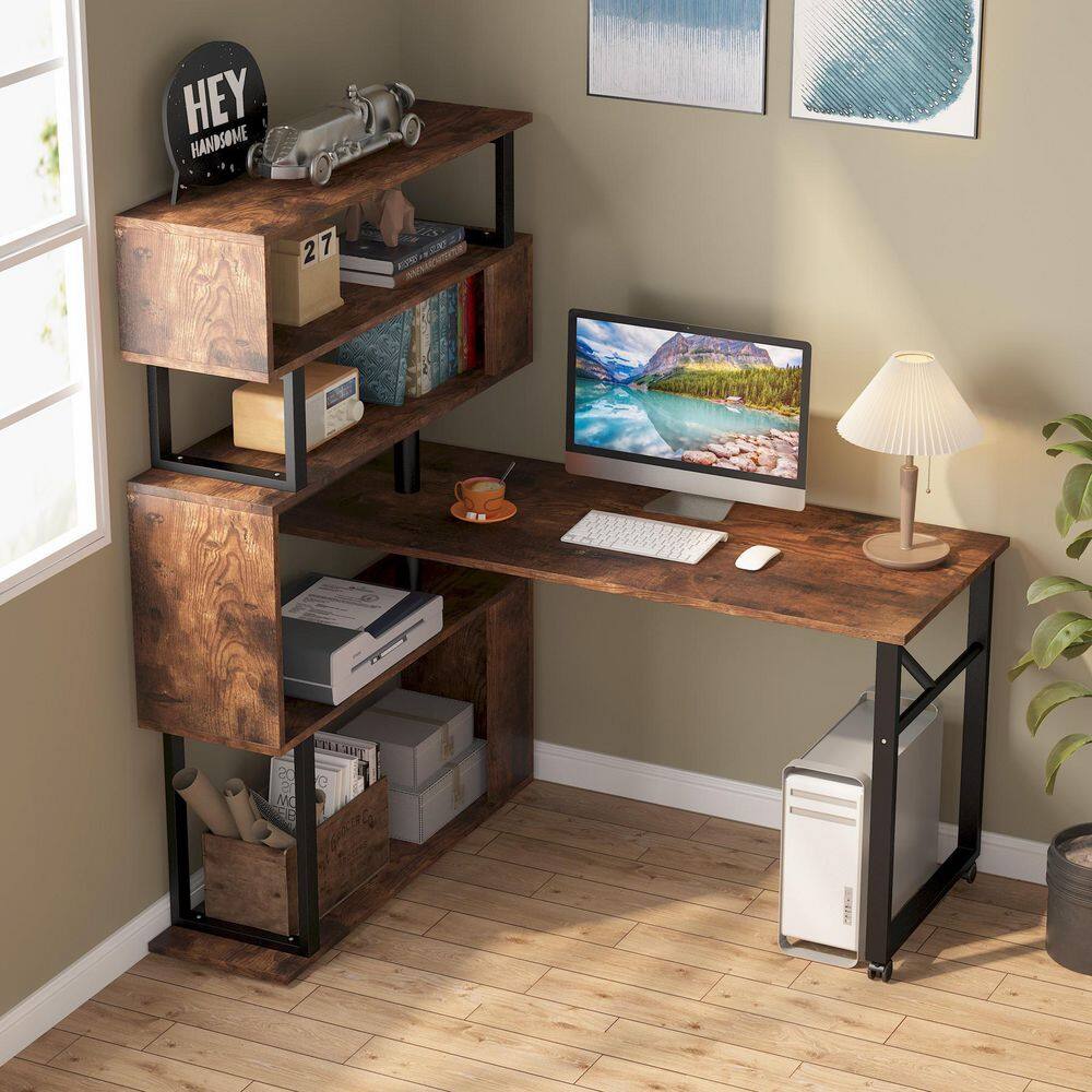 TRIBESIGNS WAY TO ORIGIN Halsey 47 in. W Reversible L-Shaped Brown Wood Corner Computer Desk Writing Studying Reading Desk 5-Tier Storage Shelves