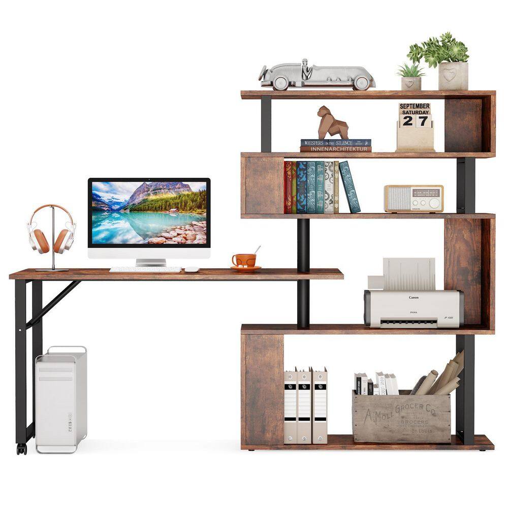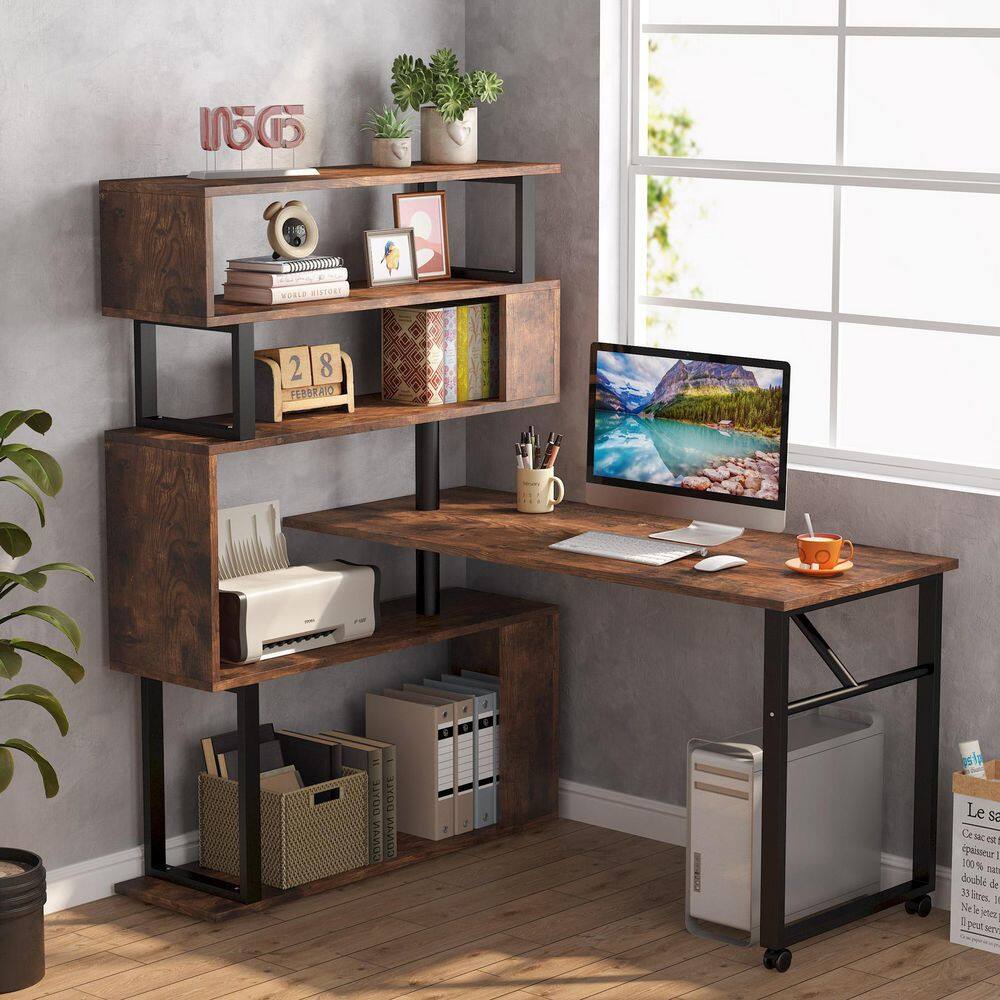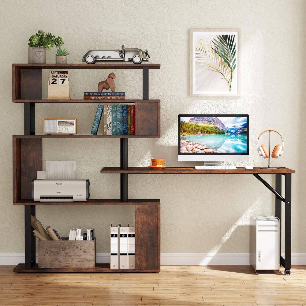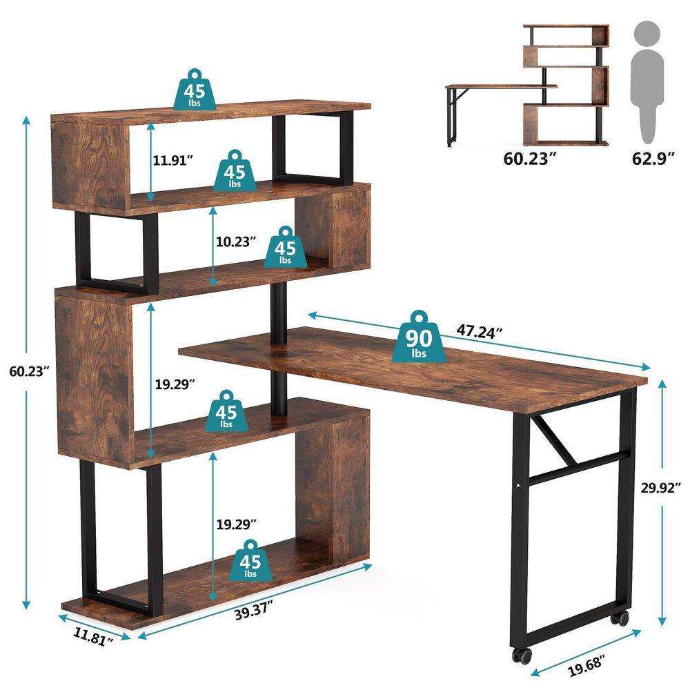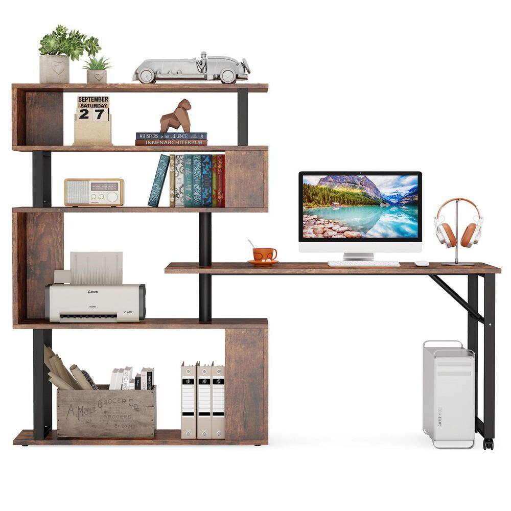 TRIBESIGNS WAY TO ORIGIN Halsey 47 in. W Reversible L-Shaped Brown Wood Corner Computer Desk Writing Studying Reading Desk 5-Tier Storage Shelves