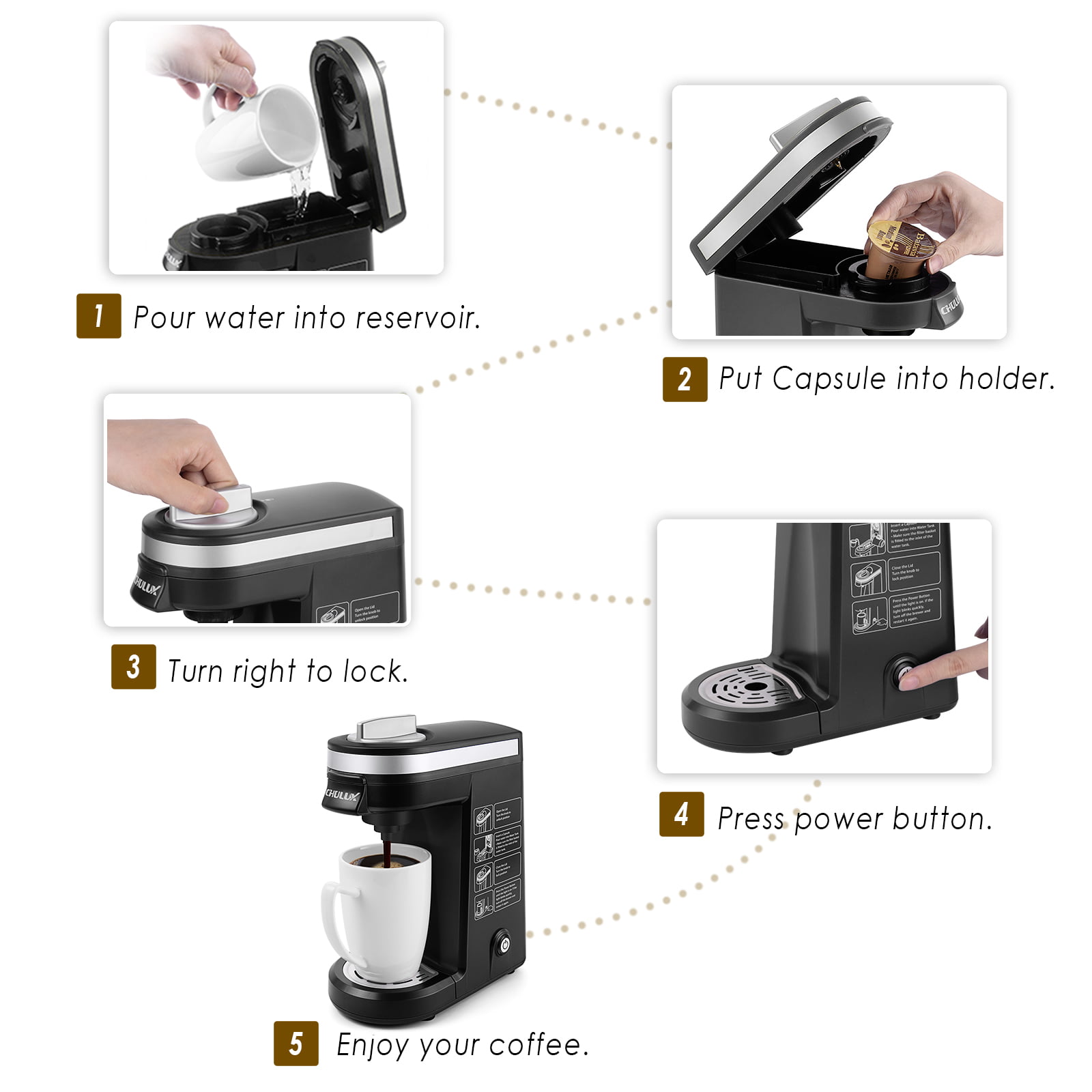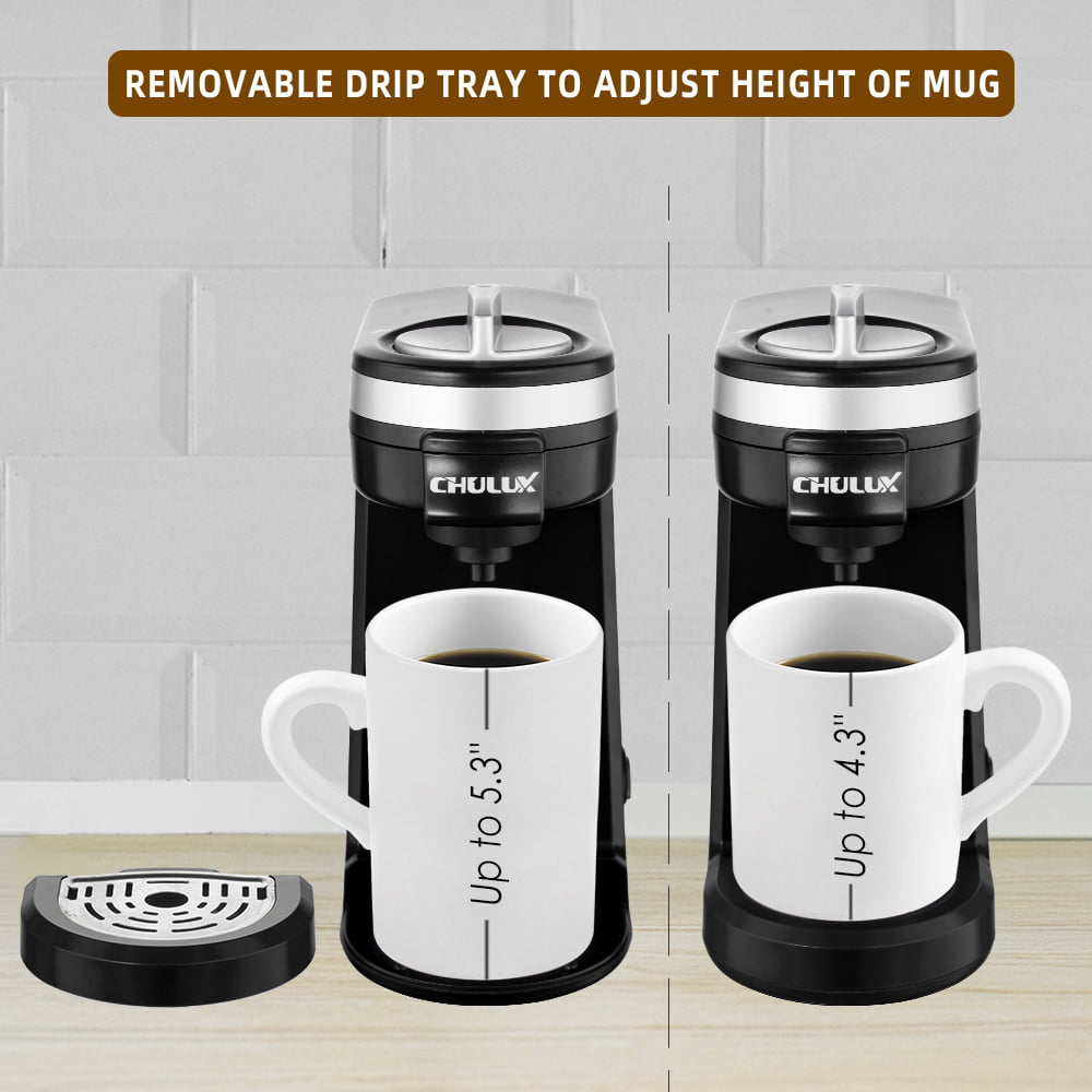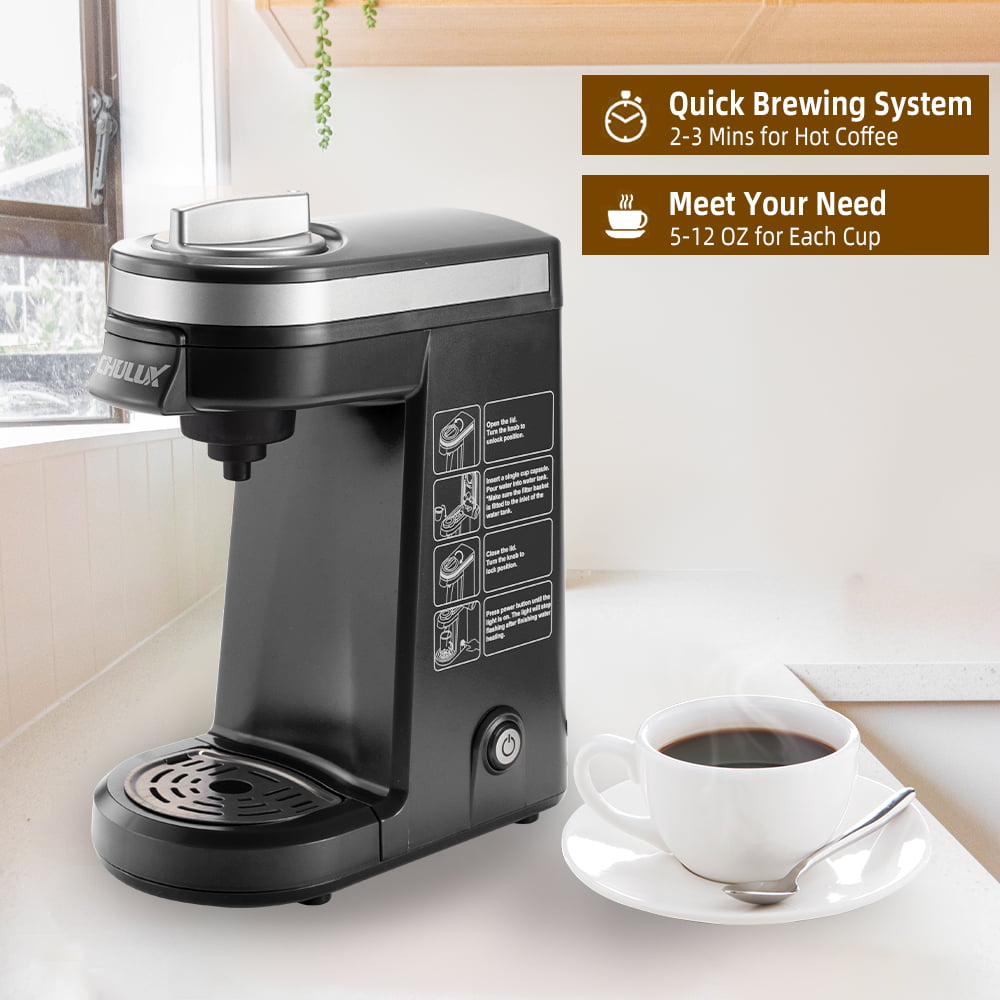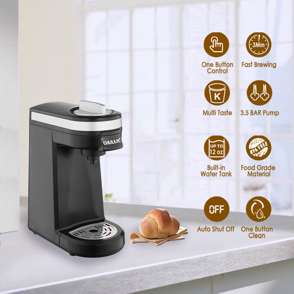 CHULUX Single Serve Coffee Maker. Travel Mini Coffee Brewer for K Cup Capsule and Coffee Powder with 5-12oz Built-in Water Tank. One Button Operation. Auto Shut Off