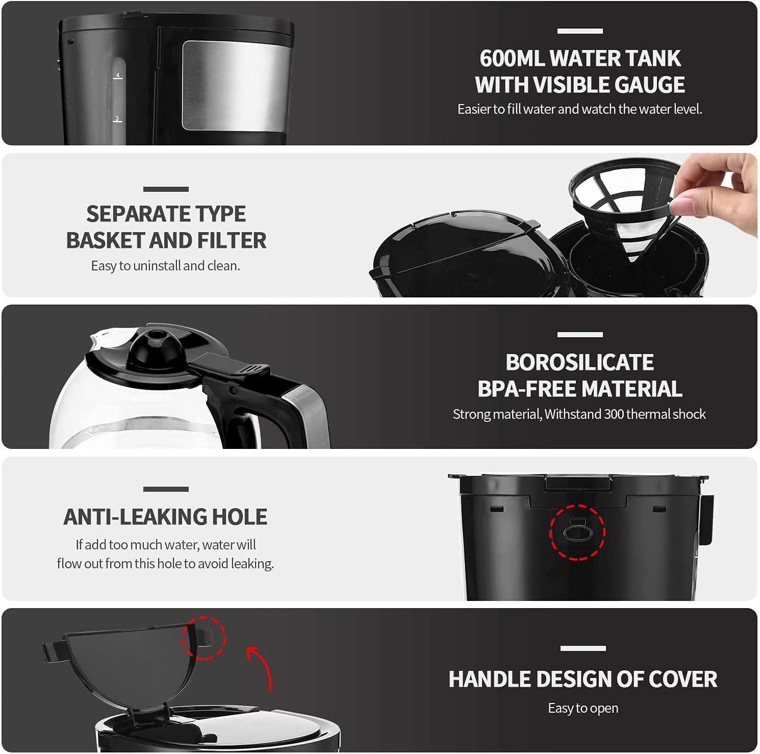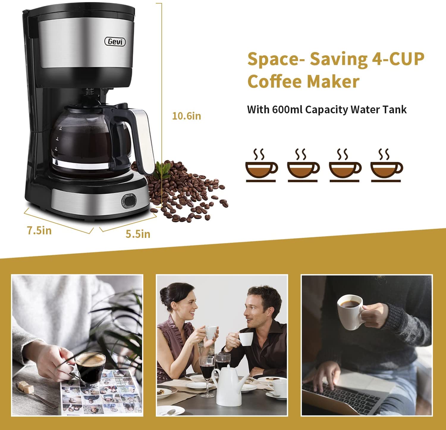 Gevi 4-Cup Coffee Maker with Auto-Shut off. Cone Filter. Stainless Steel Finish. 600ml