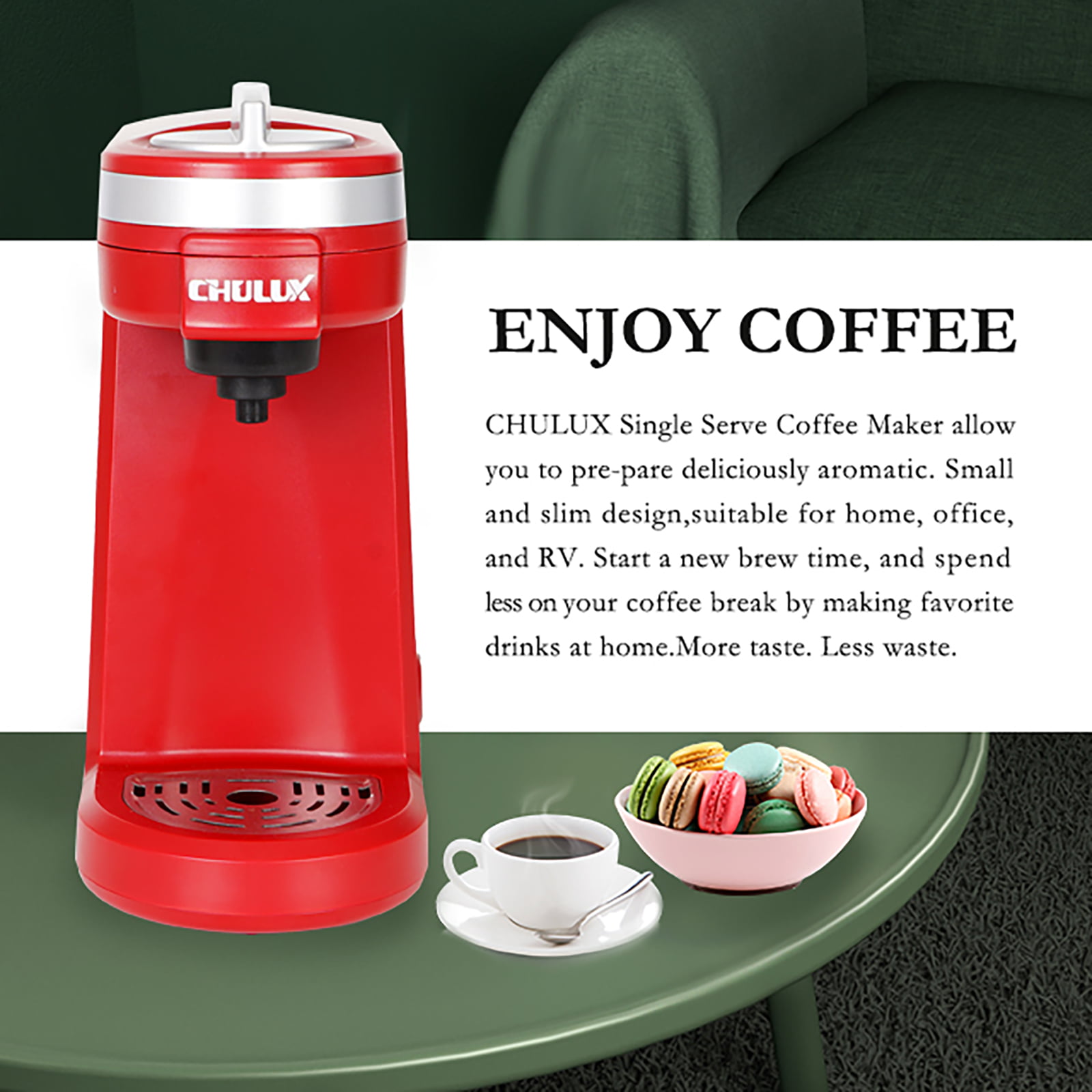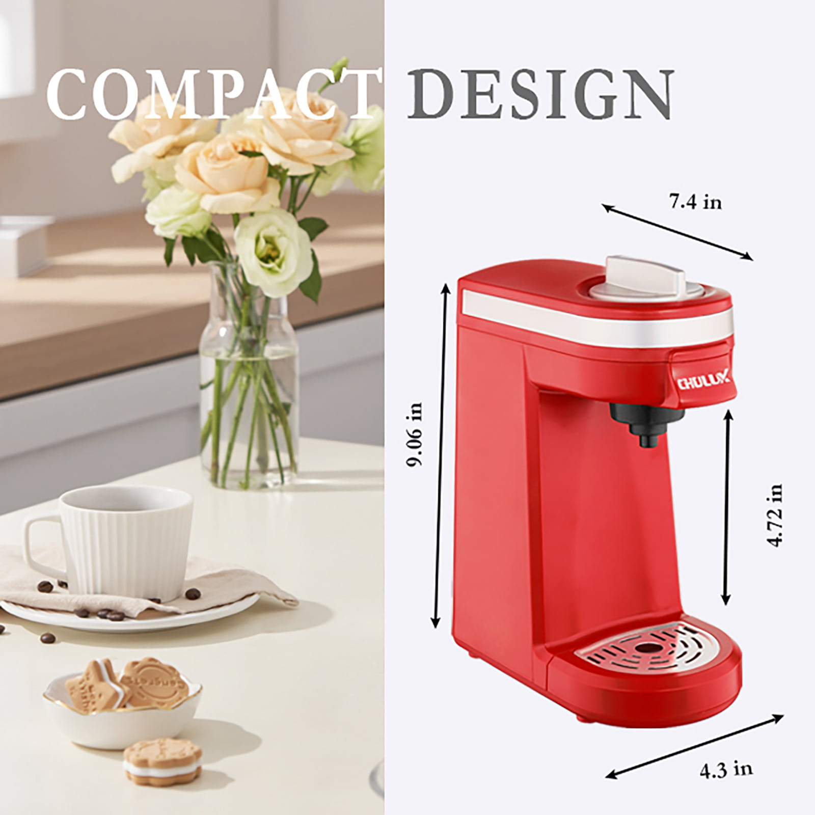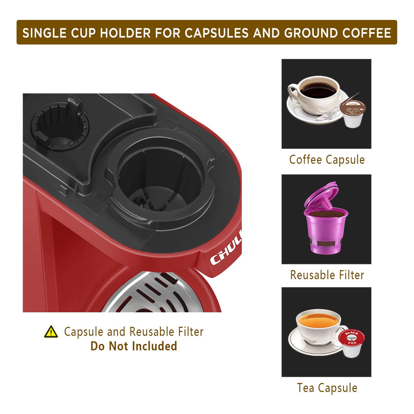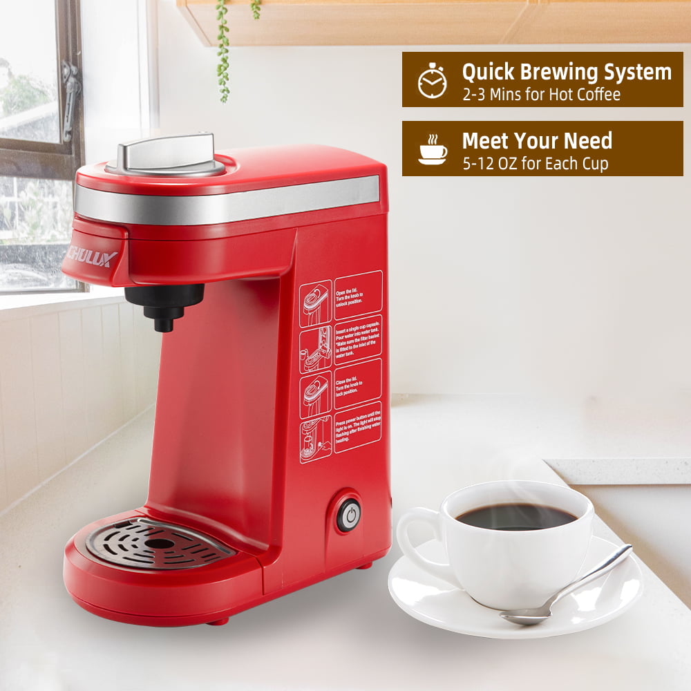 CHULUX Single Serve Coffee Maker. Fast Brewing Coffee Machine for K Cup Pod Capsule and Ground Coffee with Water Filter. 5-12 Ounce. Red