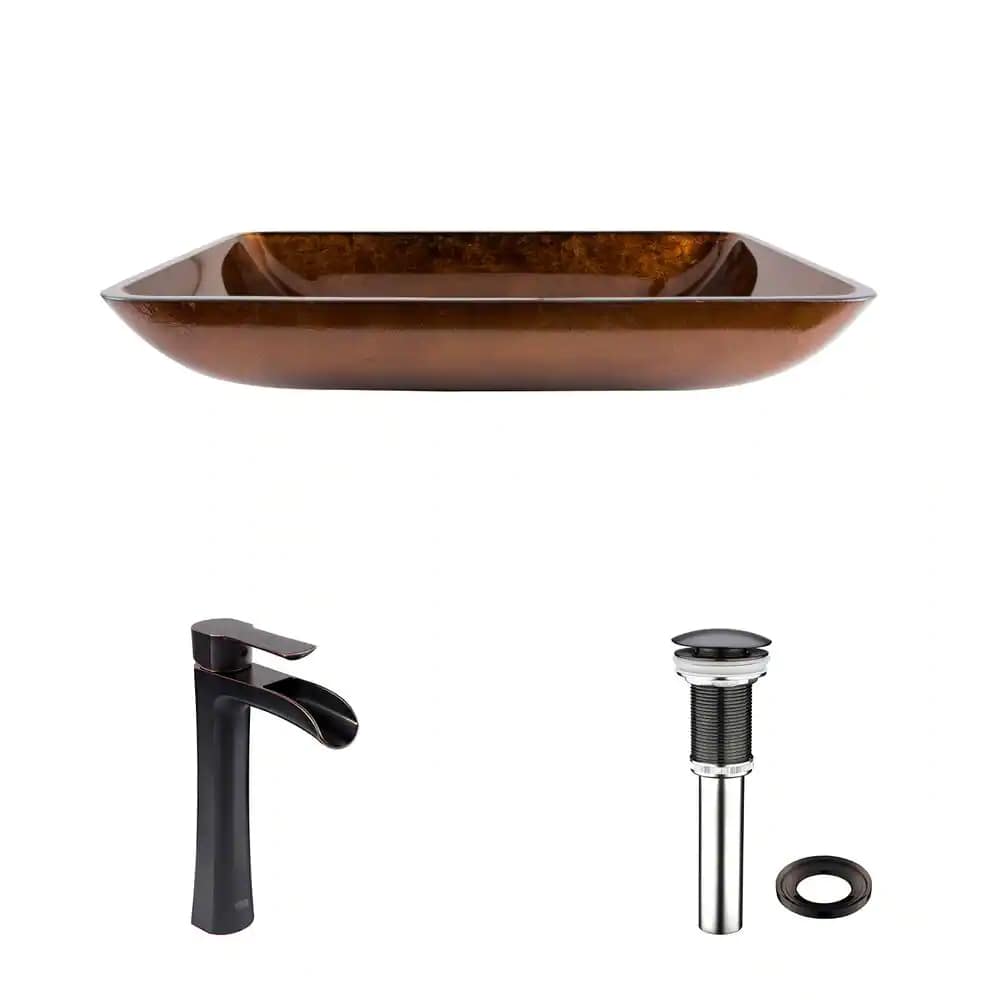 VIGO VGT1055 Glass Rectangular Vessel Bathroom Sink. Chocolate Brown. Antique Rubbed Bronze