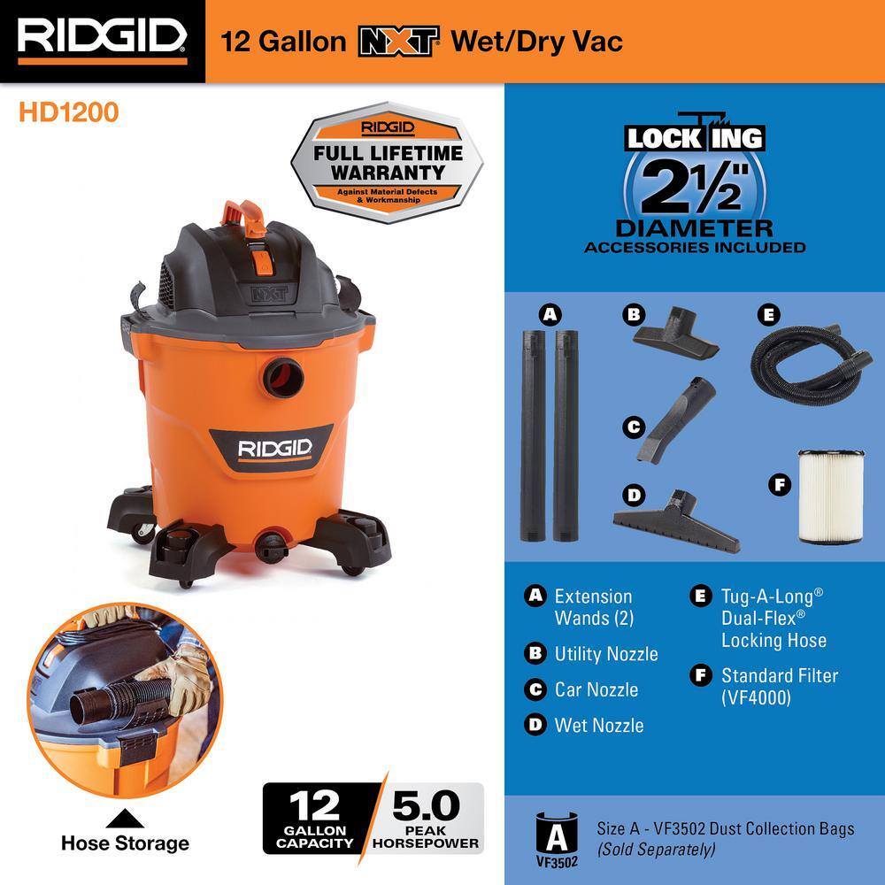 RIDGID 12 Gallon 5.0 Peak HP NXT Wet/Dry Shop Vacuum with Filter. Locking Hose and Accessories
