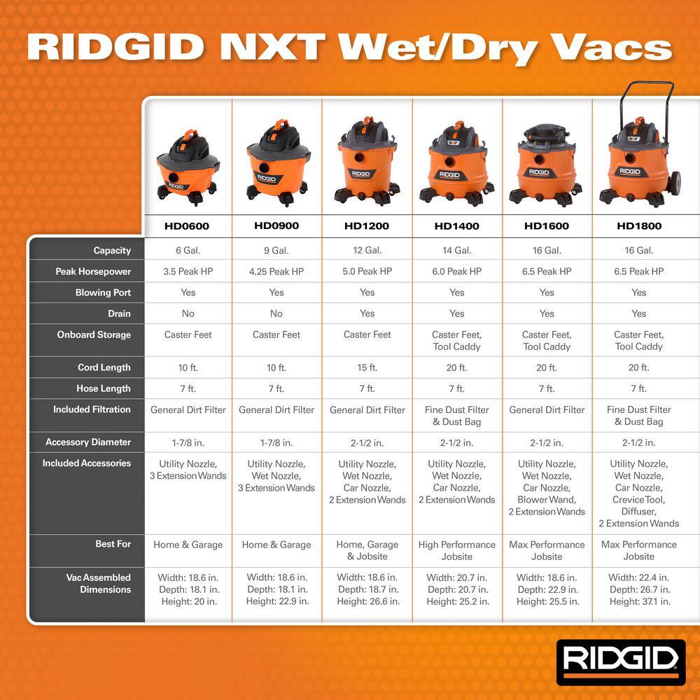 RIDGID HD1280 12 Gal. 6.0-Peak HP NXT Wet/Dry Shop Vacuum with Detachable Blower. Filter. Dust Bag. Hose and Accessories