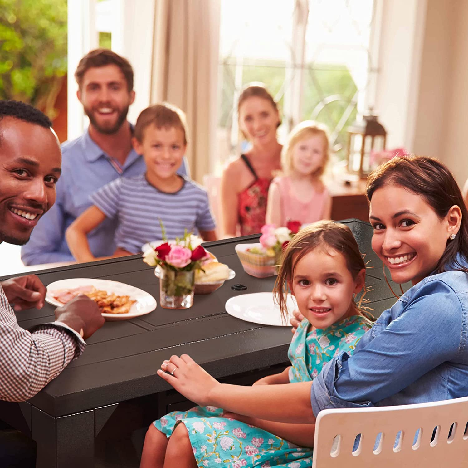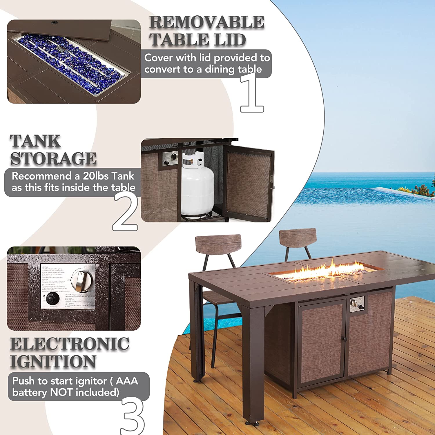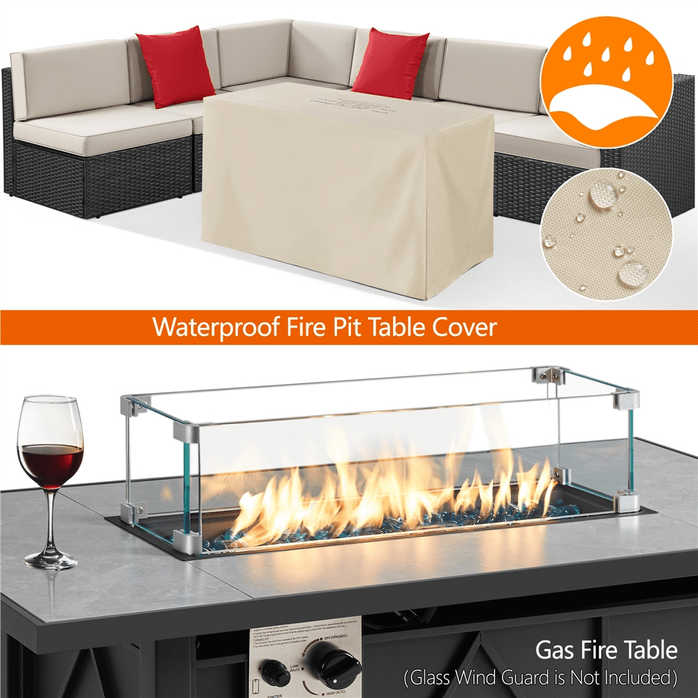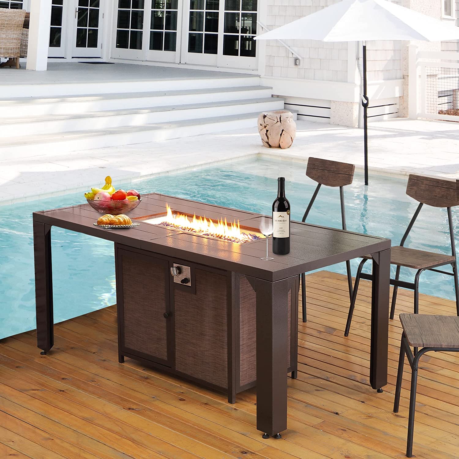 PIZZELLO Fire Pit Table 62.5″ Propane Outdoor Patio Dining Table Rectangular with Fire Glass Bead. Brown