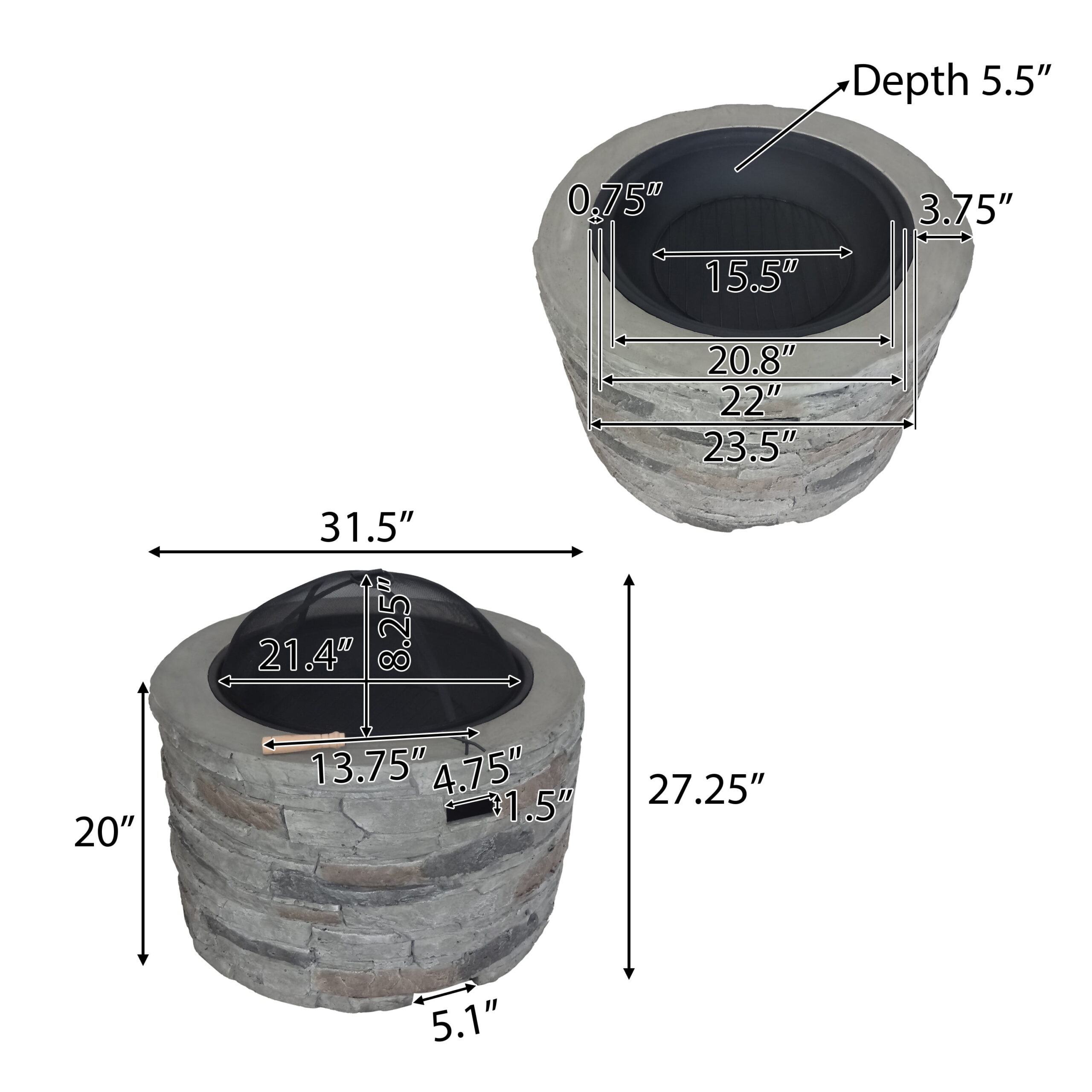 Dione Outdoor 32″ Wood Burning Light Weight Concrete Round Fire Pit. Grey