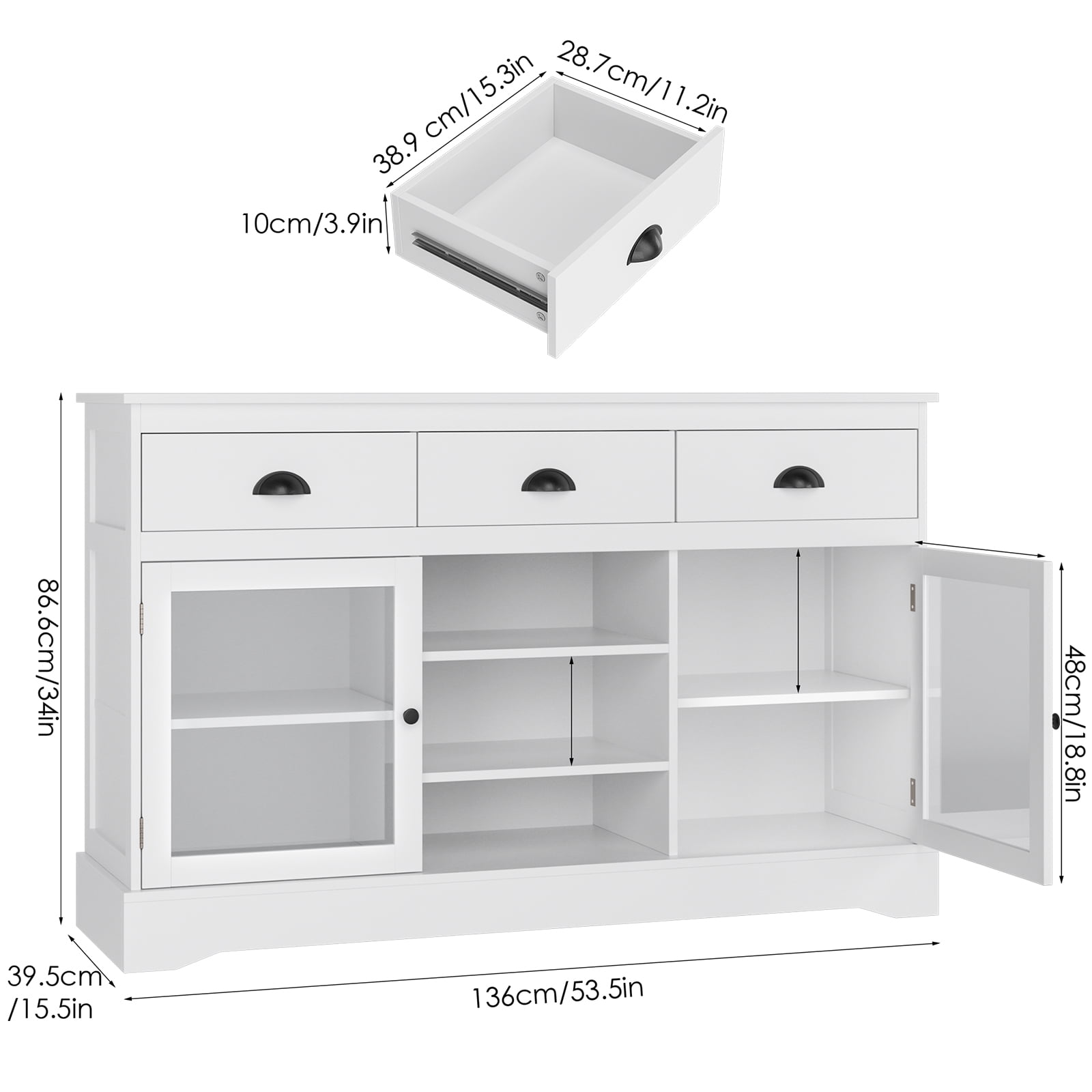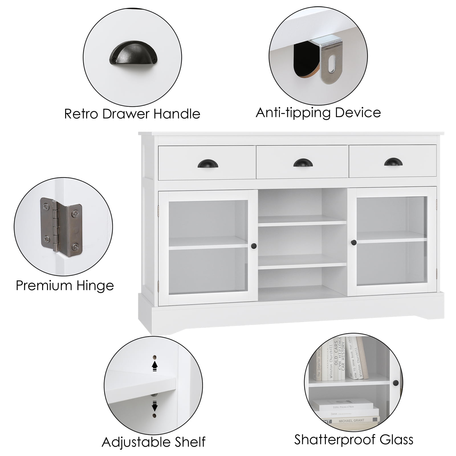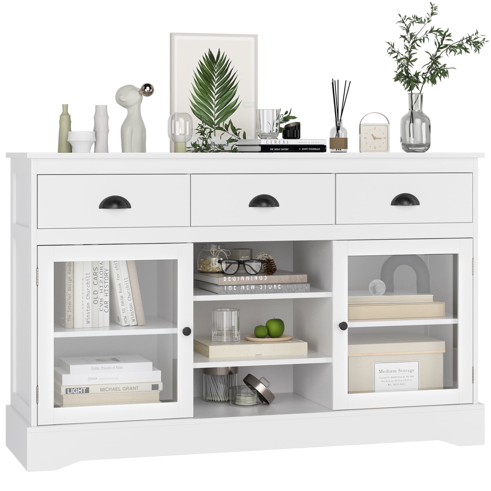 Homfa Sideboard Buffet. 53” Wide Kitchen Cupboard Storage Cabinet with 3 Drawers. White