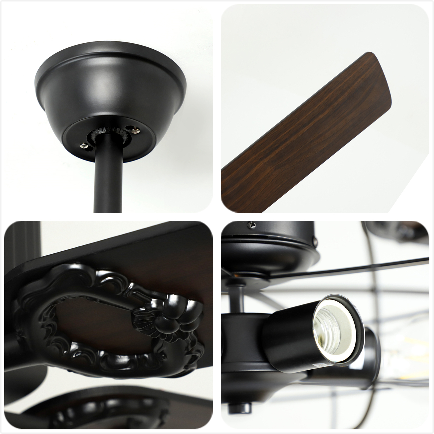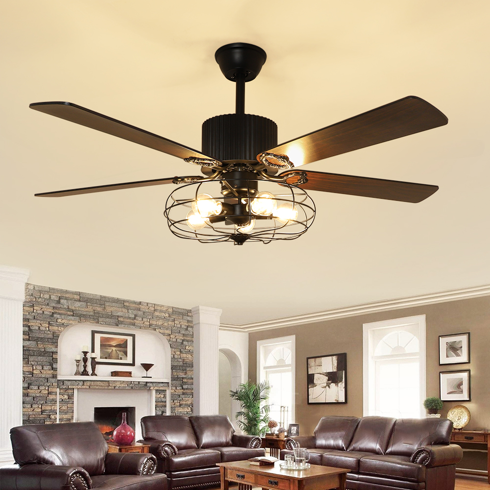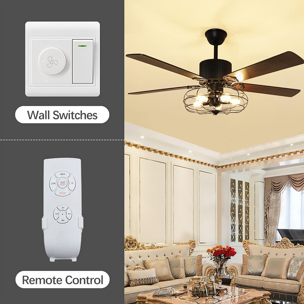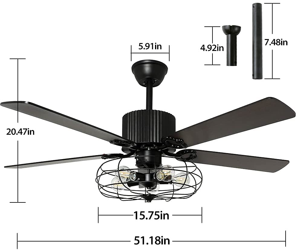 Depuley Remote 52” Caged Industrial 5 Blades Ceiling Fan with Light. Reversible Plywood Blades with Remote for Living Bedroom. Timing. 5 E26 Bulbs Not Incl