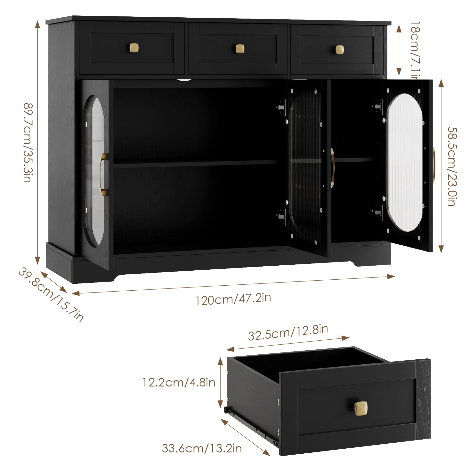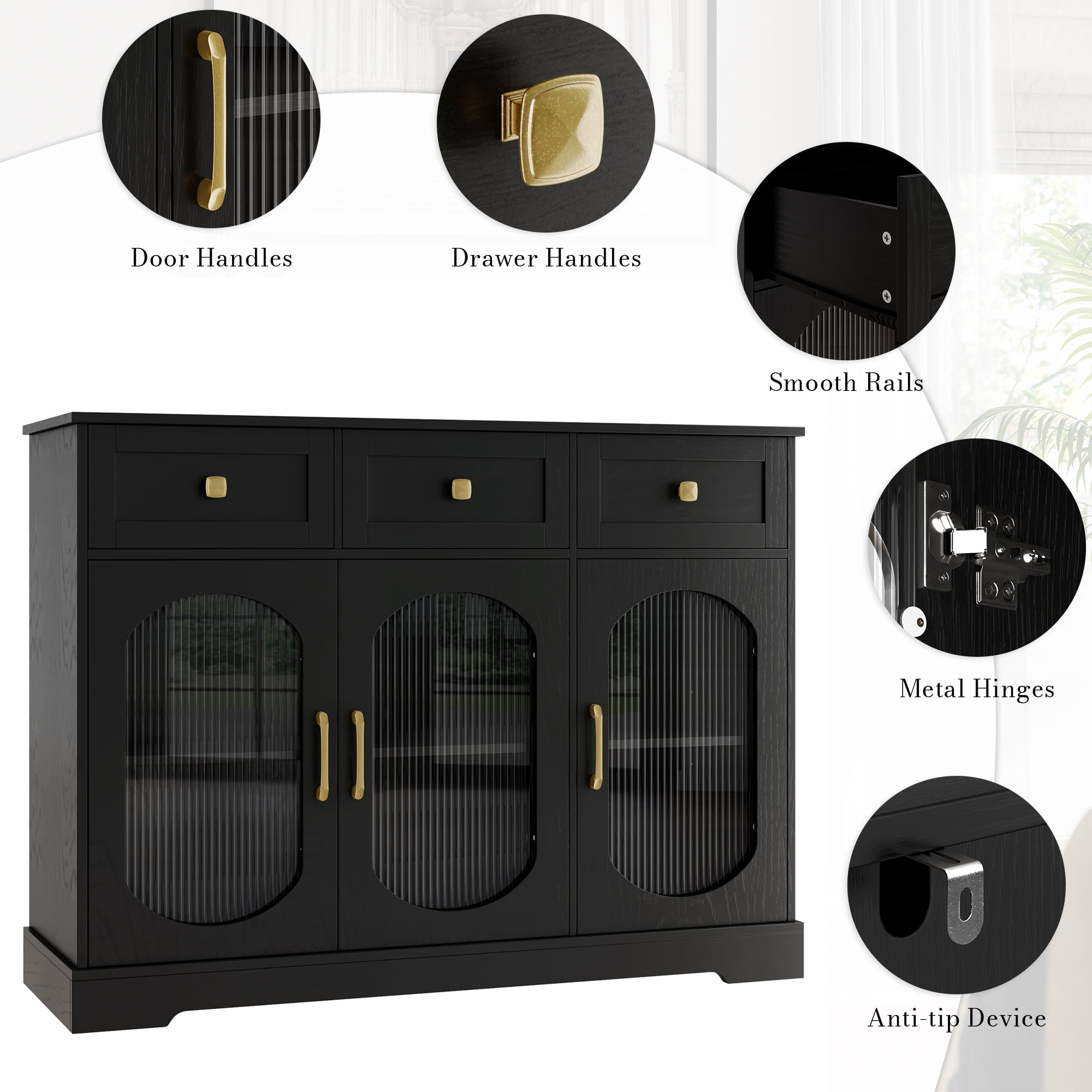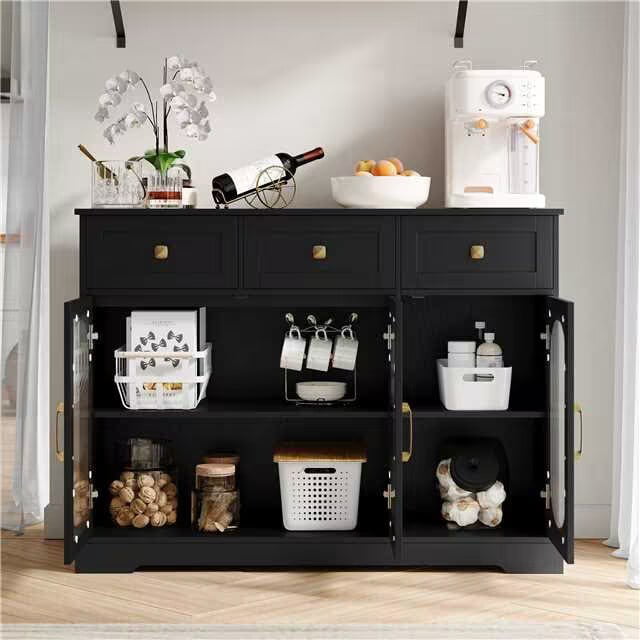 Homfa 3 Drawer Buffet Cabinet with 3 Curved Glass Doors. 47.2”W Kitchen Sideboard with Adjustable Shelf. Black
