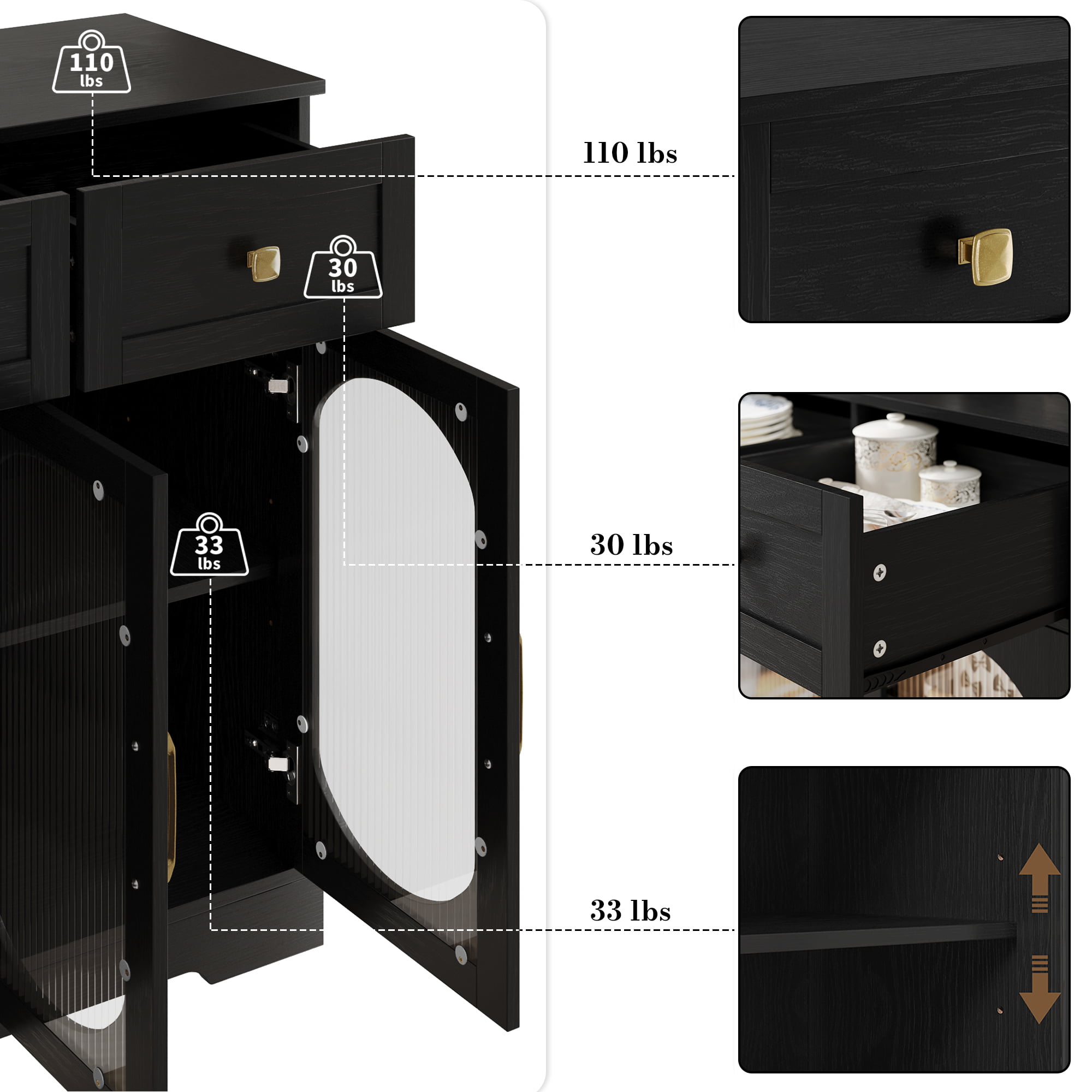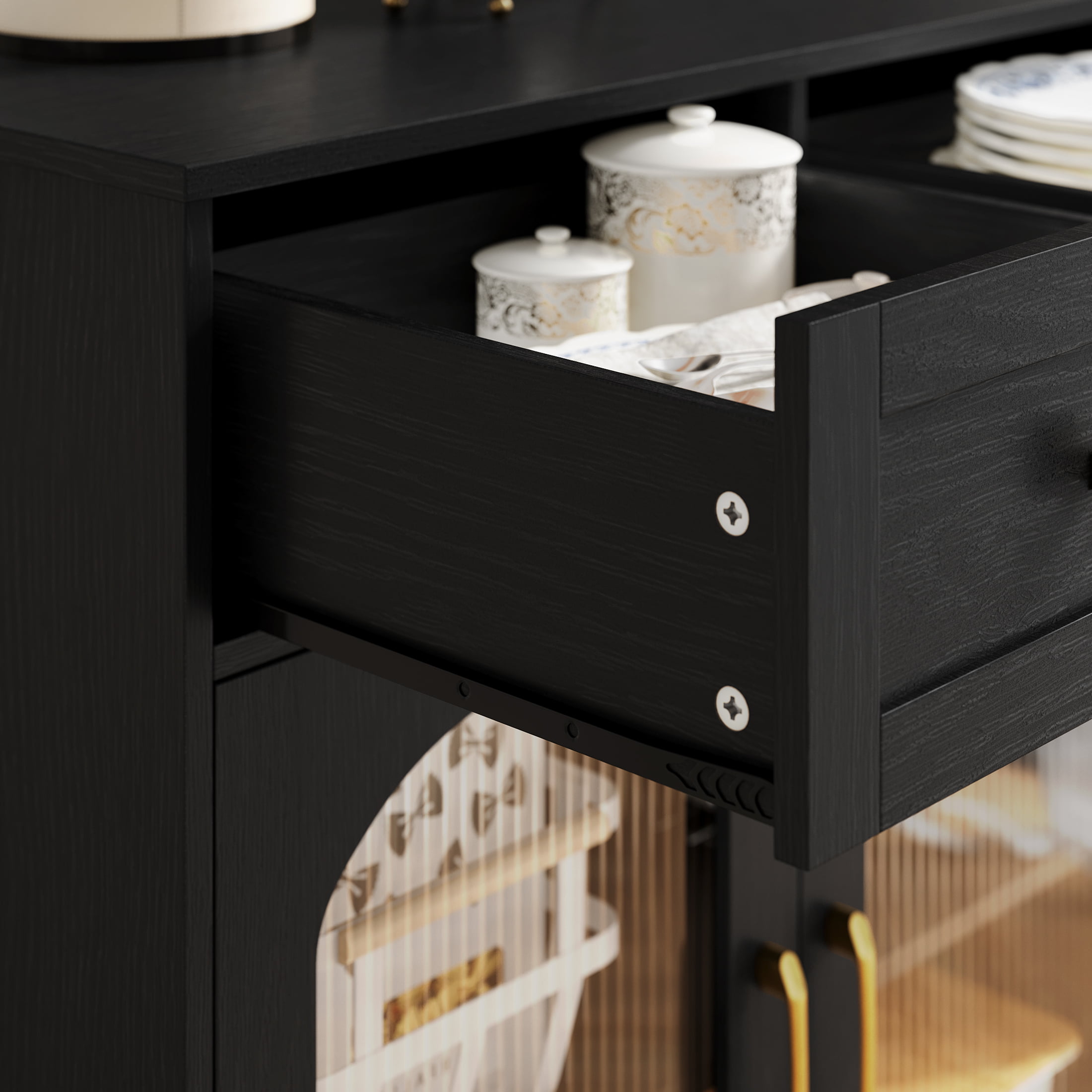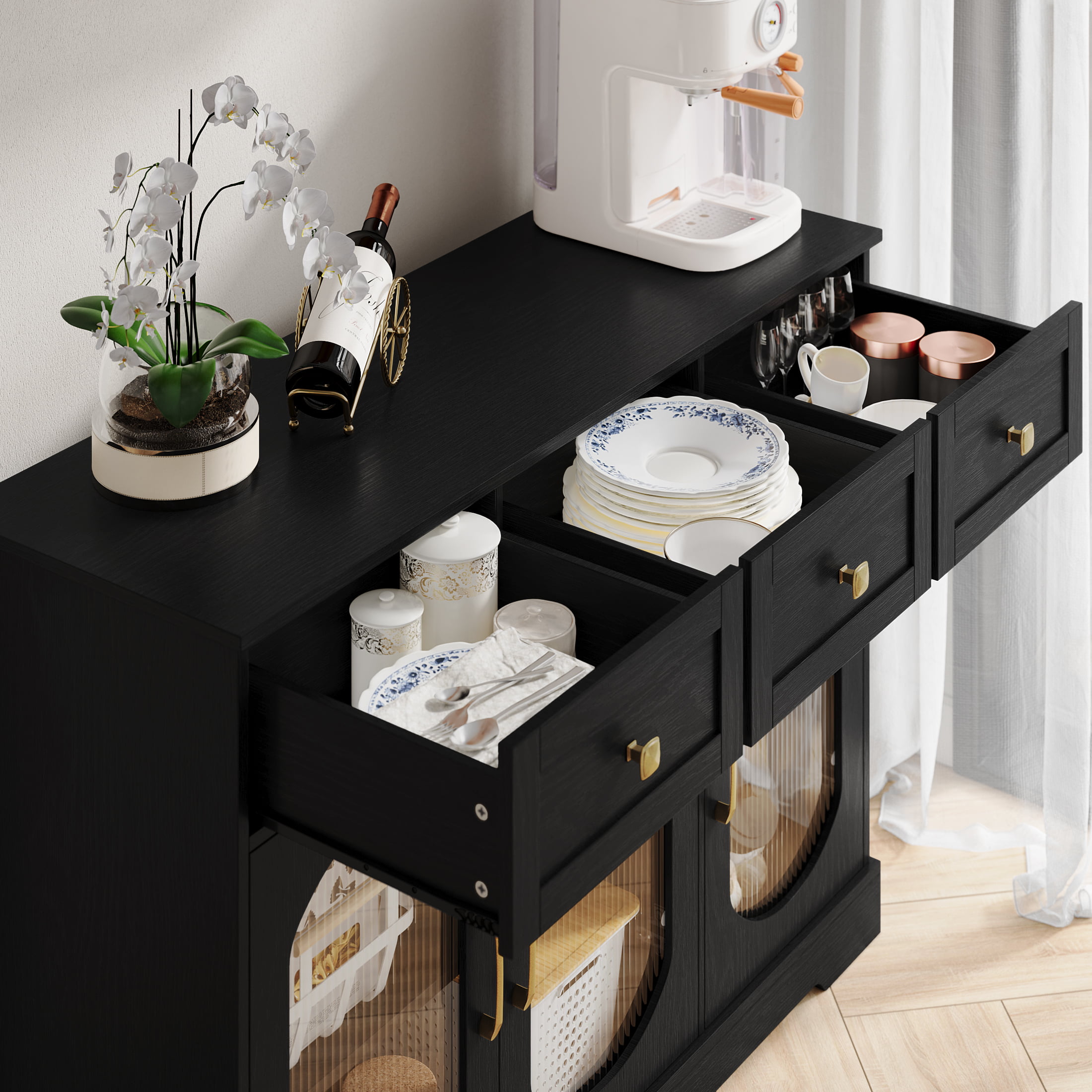 Homfa 3 Drawer Buffet Cabinet with 3 Curved Glass Doors. 47.2”W Kitchen Sideboard with Adjustable Shelf. Black