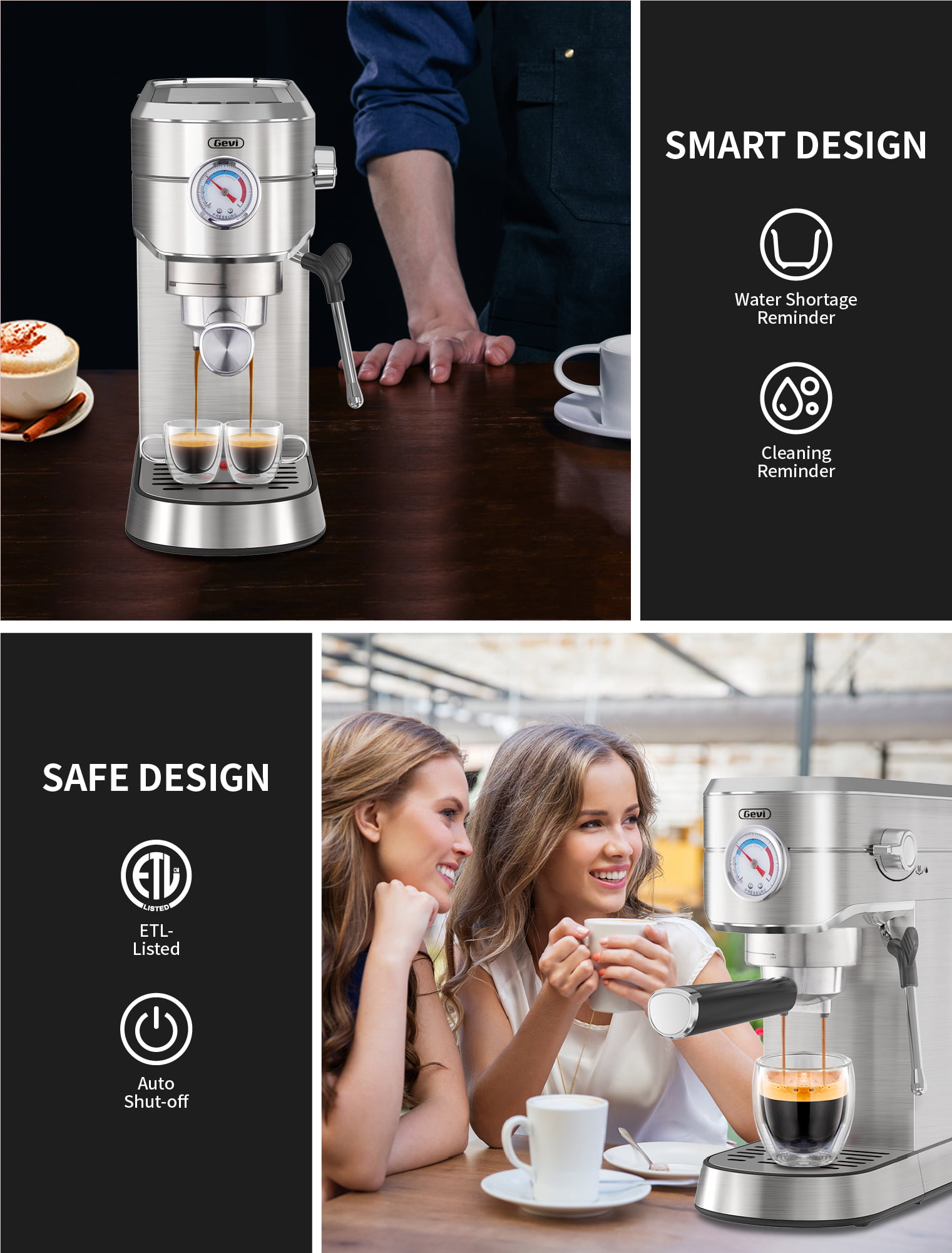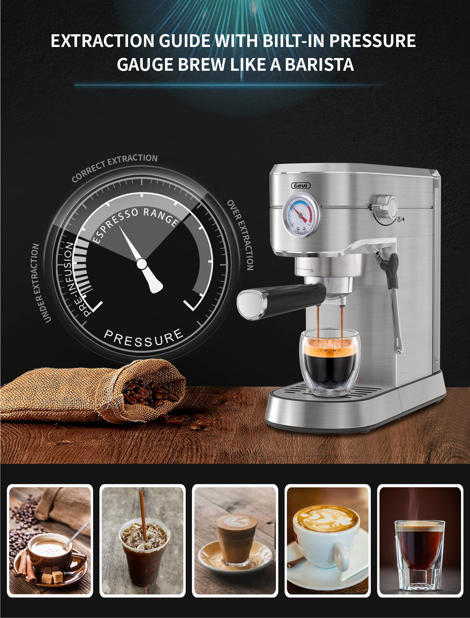 Gevi Silver 20 Bar Professional Espresso Machine 35 OZ Water Tank. Stainless Steel. New