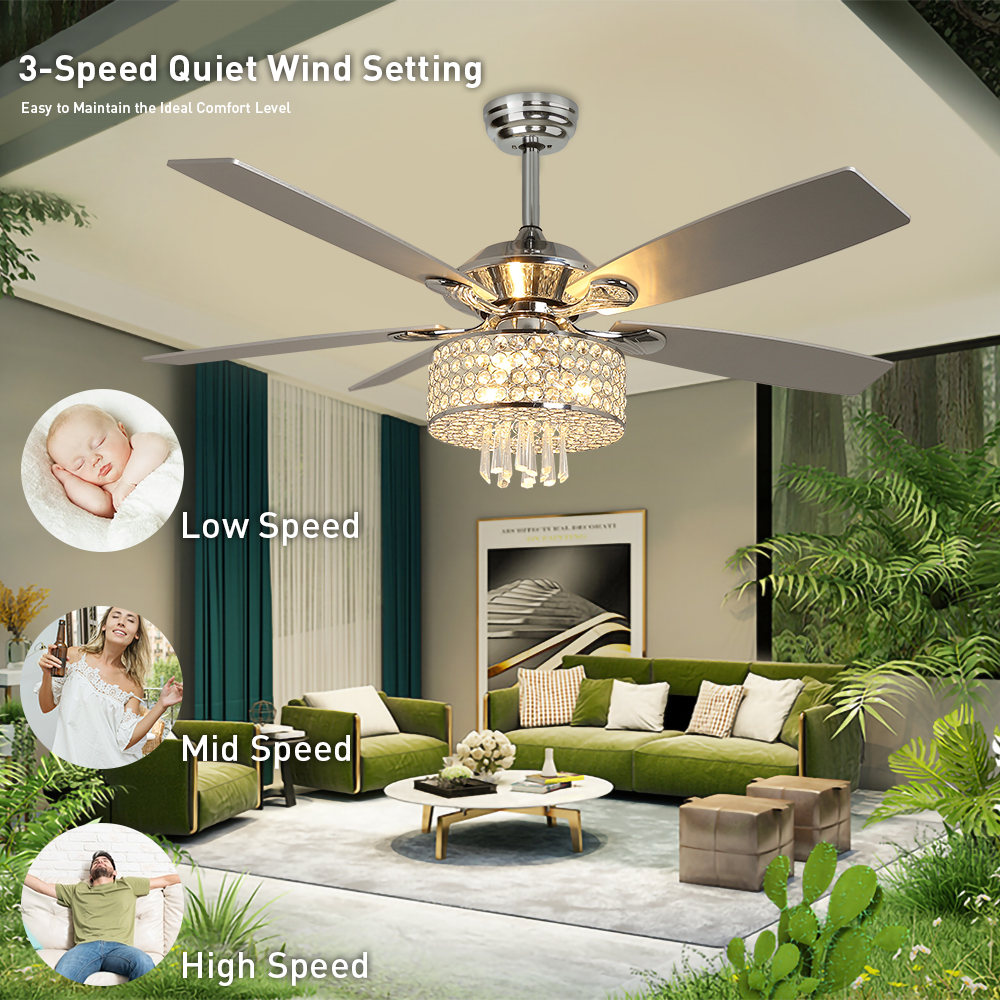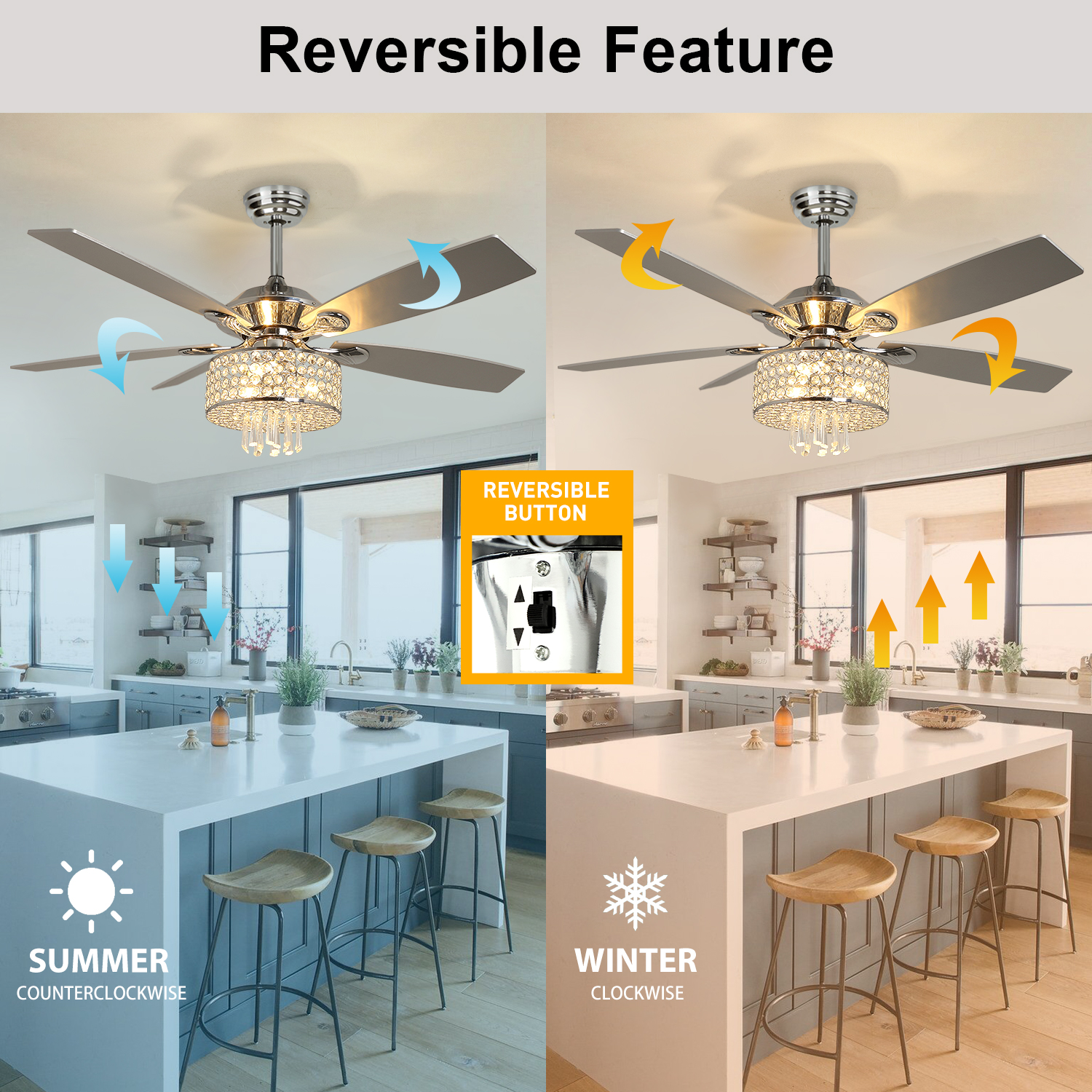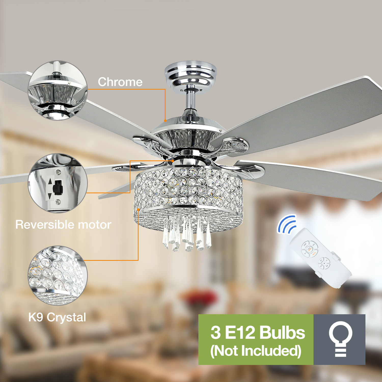 Depuley 52″ Remote Crystal Ceiling Fan with Lights. Modern Chandelier Chrome Ceiling Fans with 5 Reversible Wood Blades. 3-Speed Timing