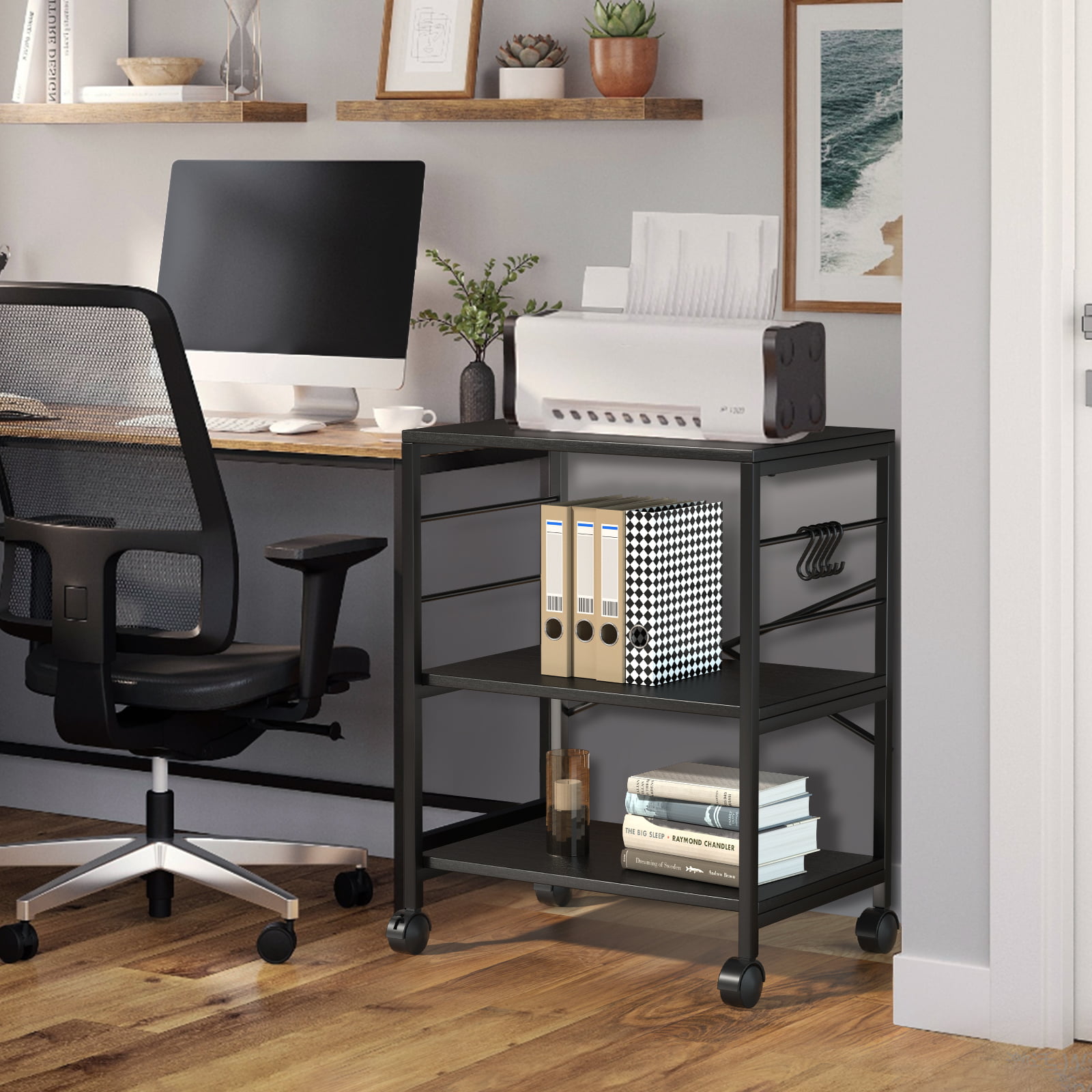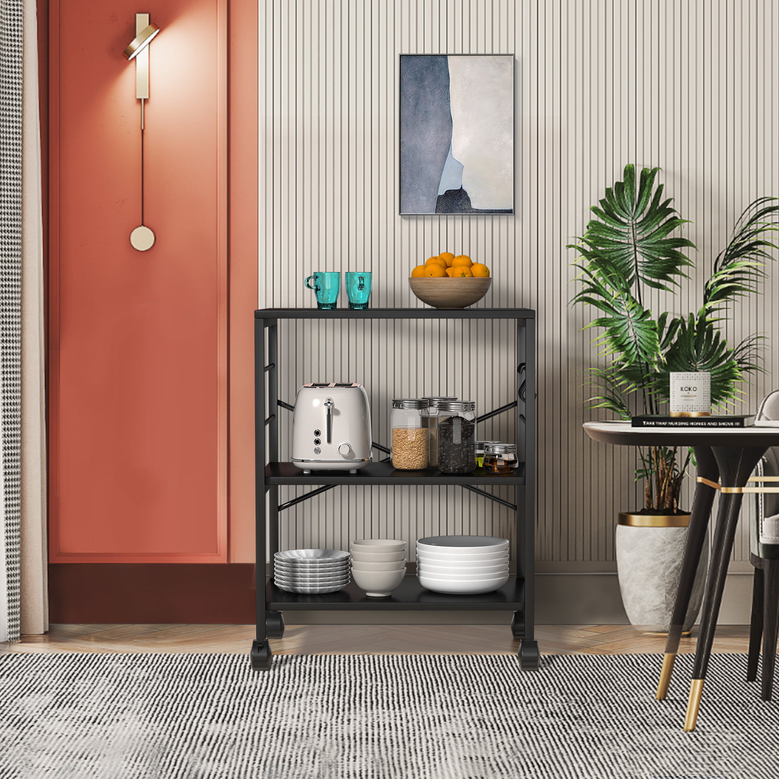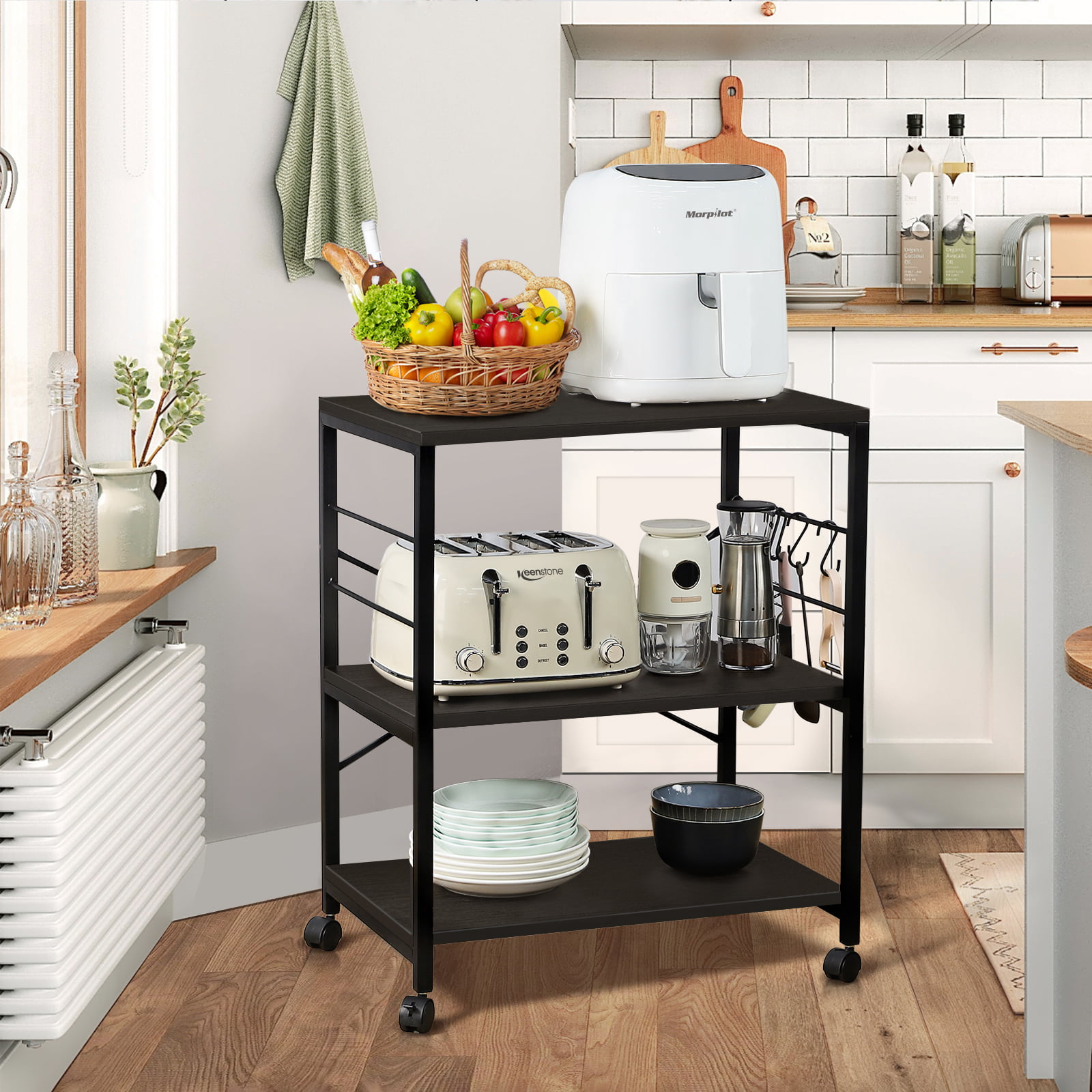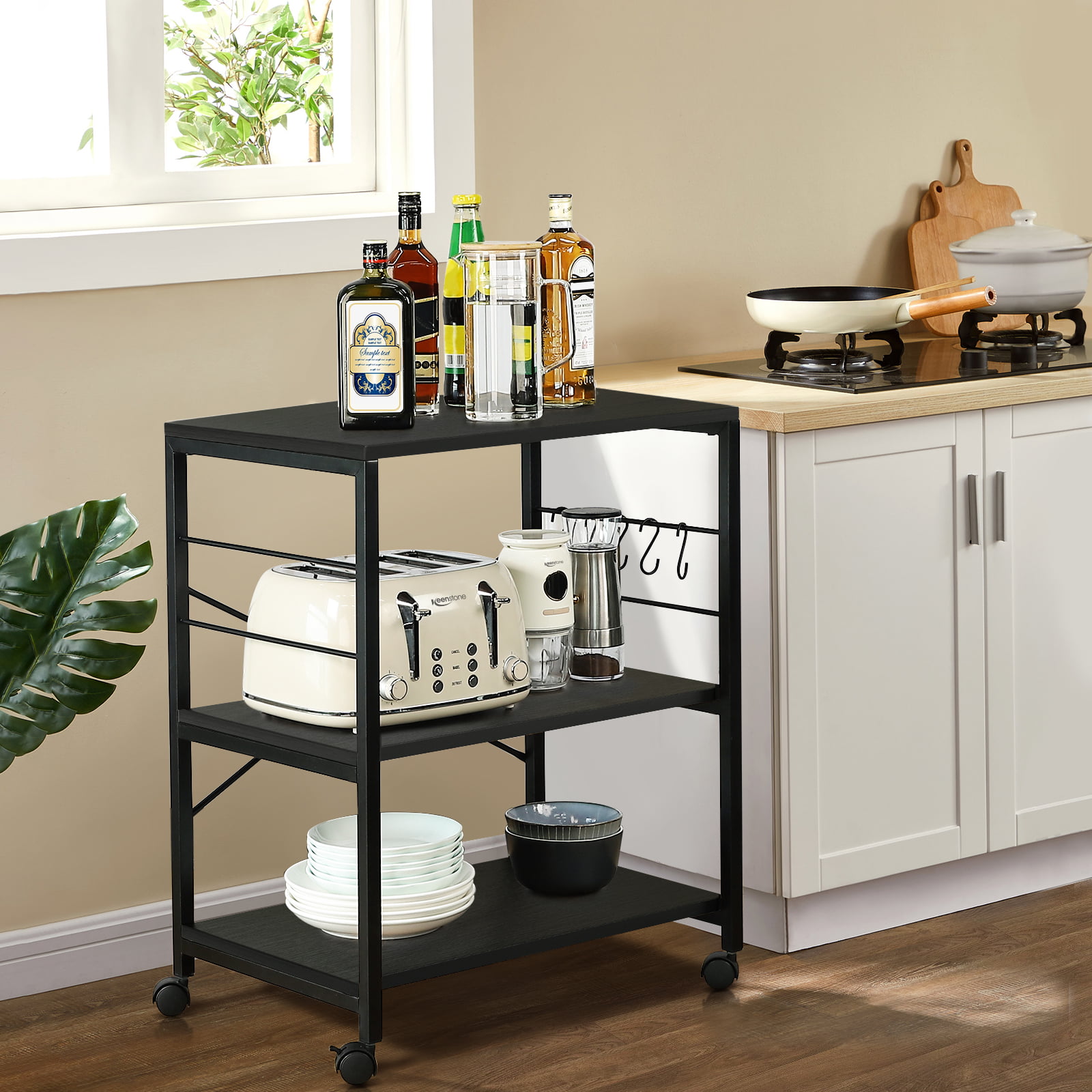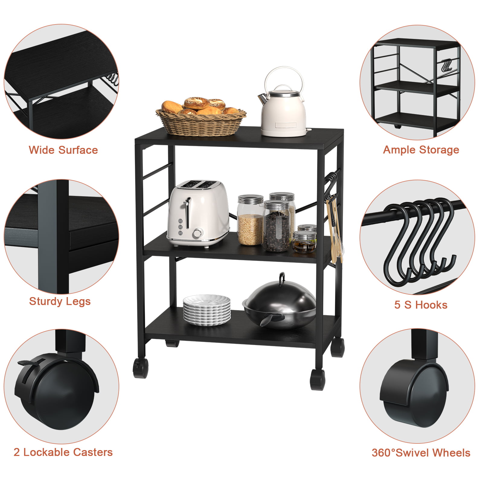 Cheflaud Kitchen Microwave Cart. 3-Tier Kitchen Utility Cart Vintage Rolling Bakers Rack with 5 Hooks for Living Room Decoration